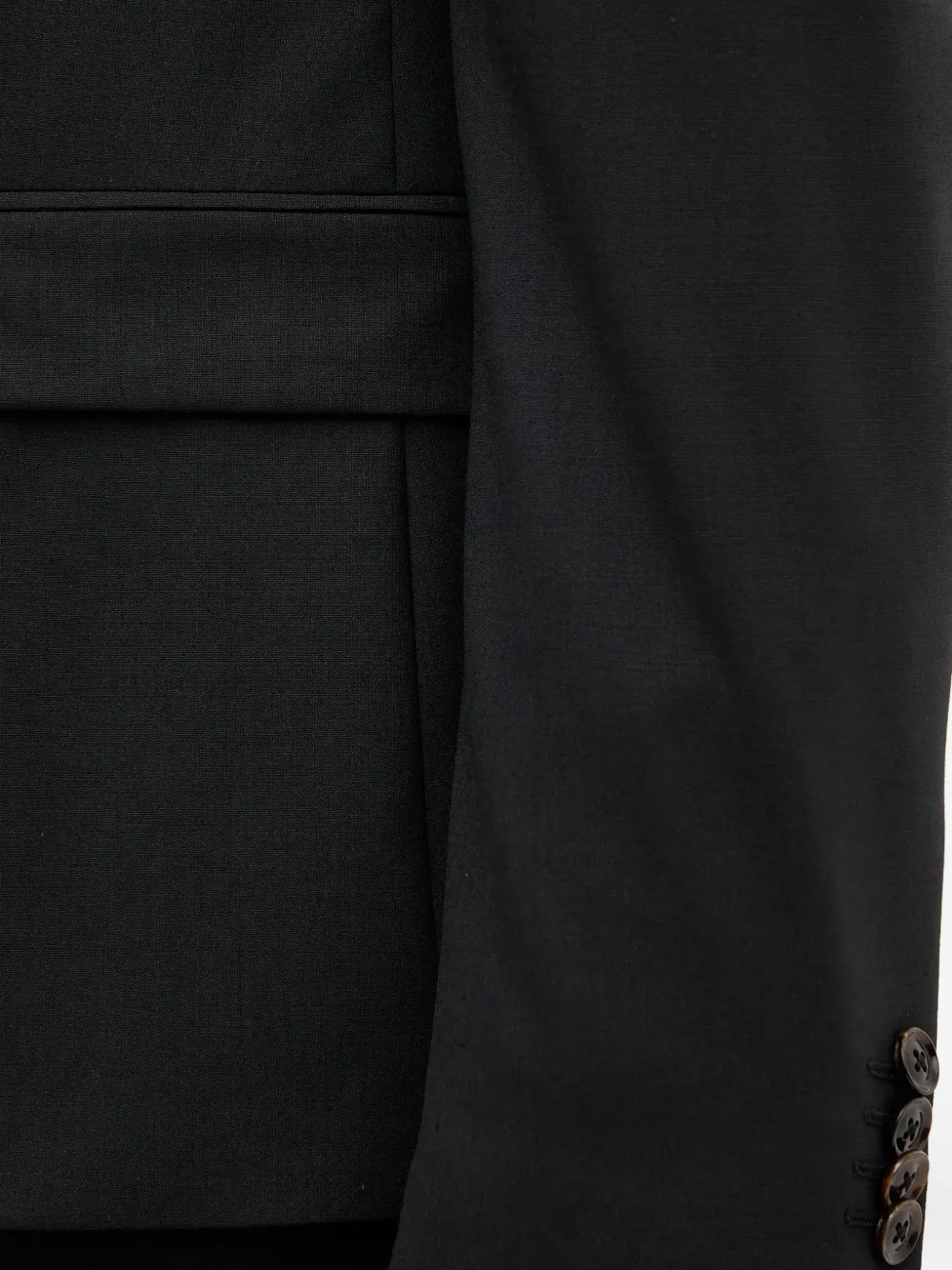Черные лацканы с вырезом, застежка на пуговицы спереди, боковые карманы с клапанами, манжеты на пуговицах, нагрудный прорезной карман