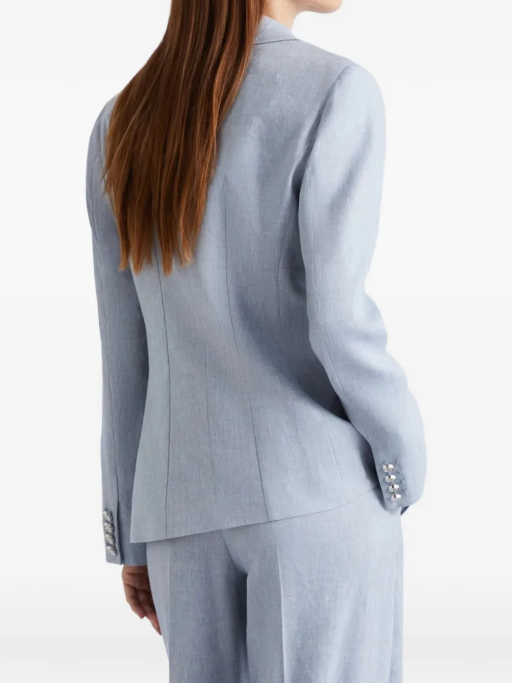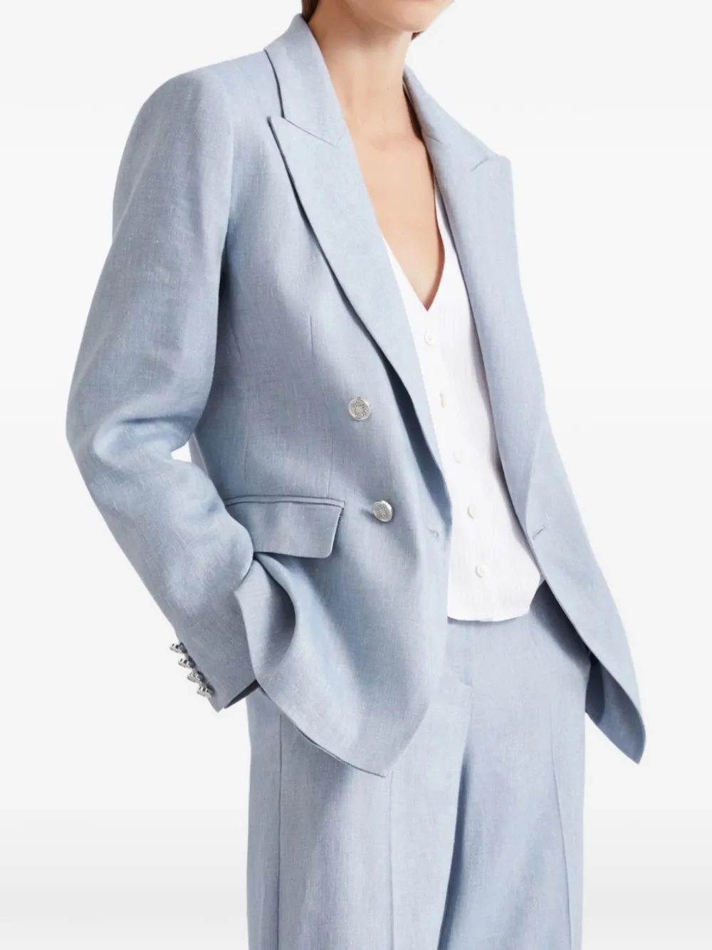 Светло-голубой двубортный пиджак с лацканами, застежкой на пуговицы спереди, манжетами на пуговицах и передними клапанными карманами