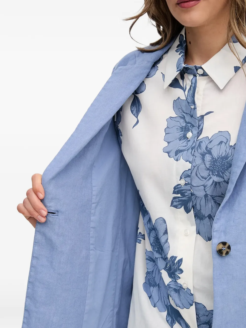 Синего цвета, застежка на пуговицы спереди, накладные карманы с клапанами, лацканы с вырезом, длинные рукава, манжеты на пуговицах