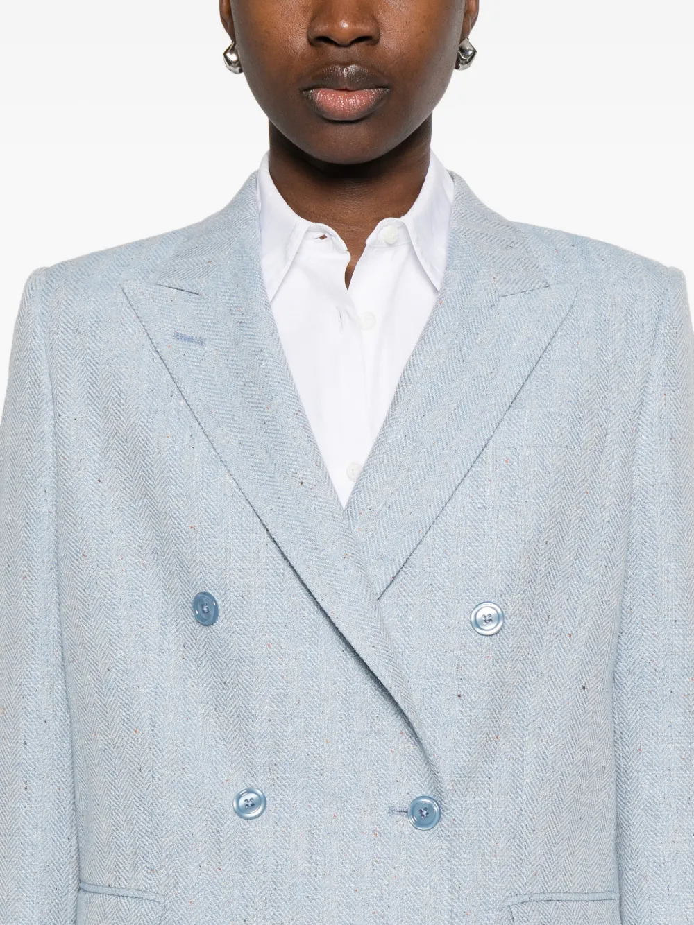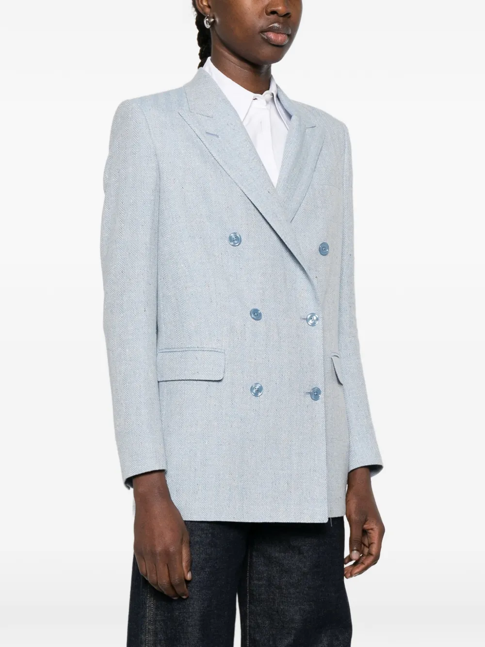 Синие лацканы с вырезом, застежка на пуговицы спереди, передние прорезные карманы с клапанами, двубортный, длинные рукава