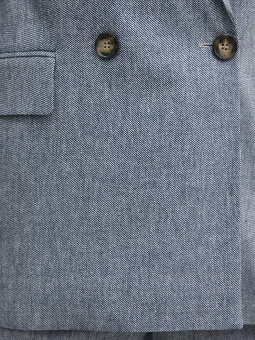 Синий двубортный пиджак с застежкой на пуговицы, лацканами с вырезом, клапанами на карманах и длинными рукавами