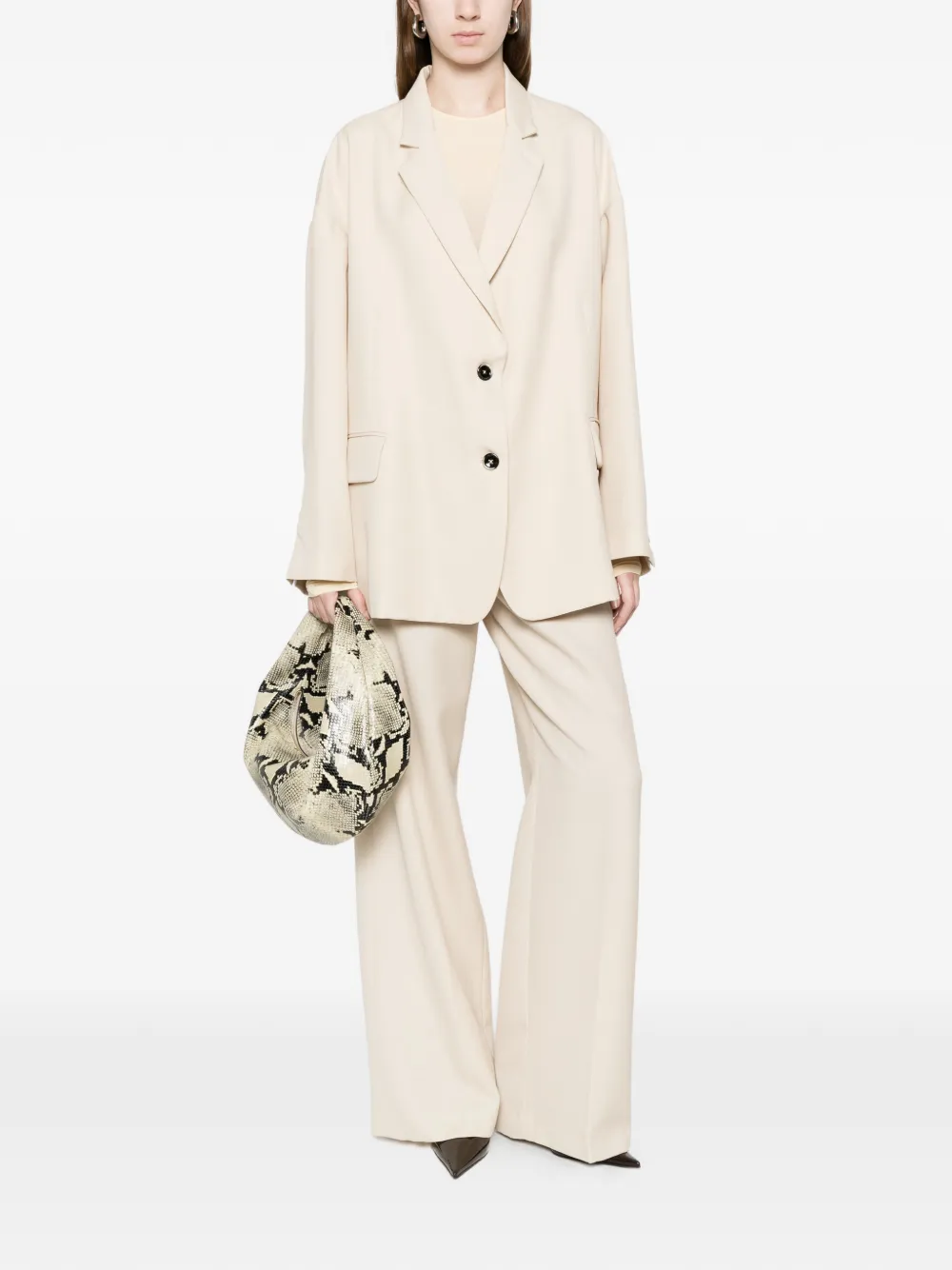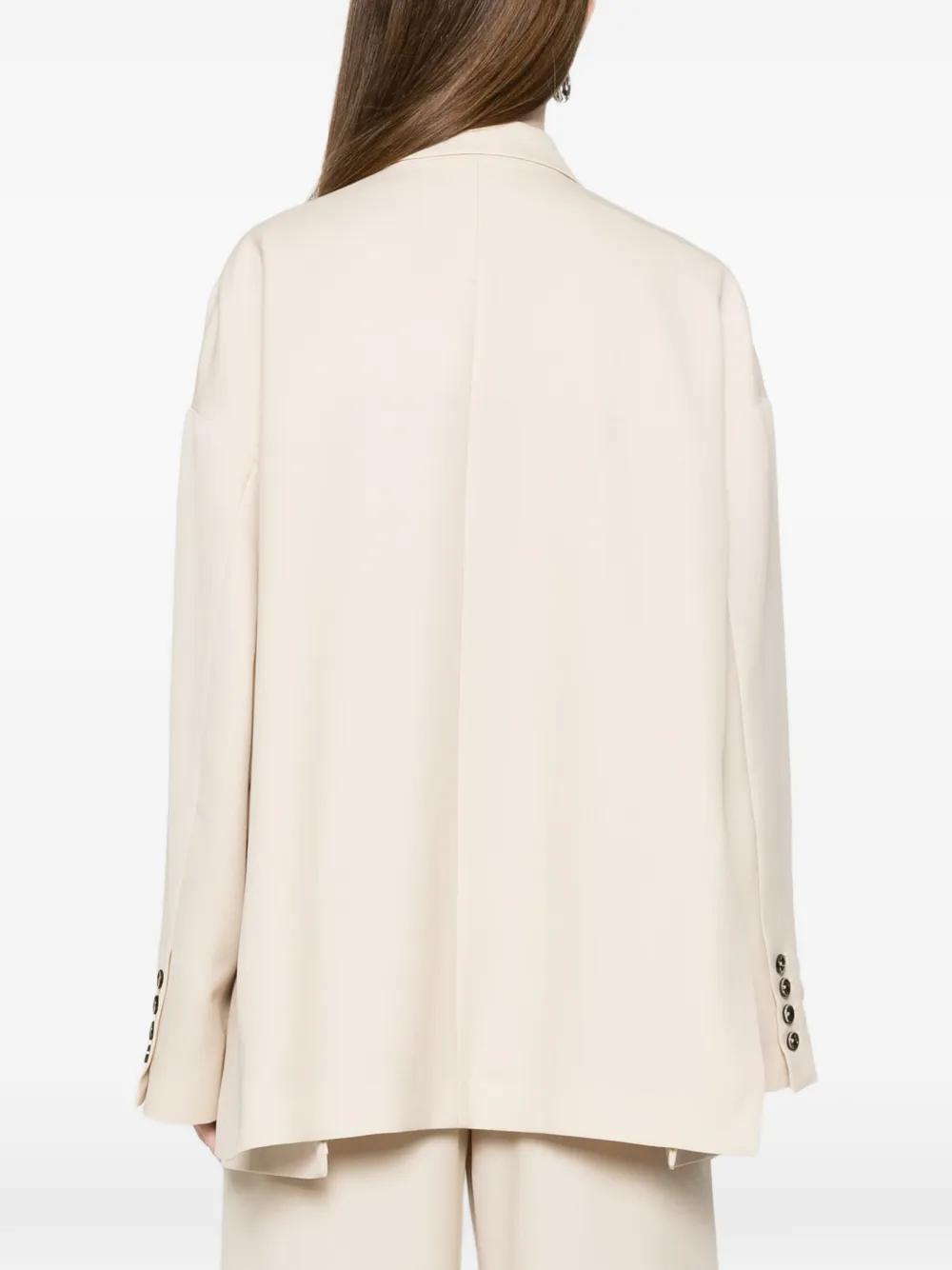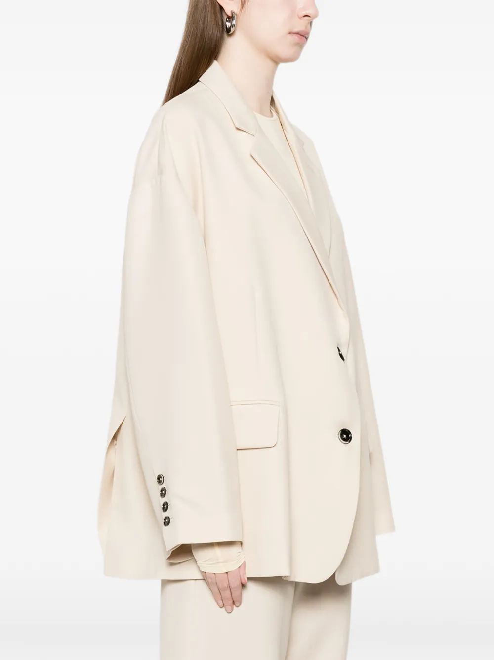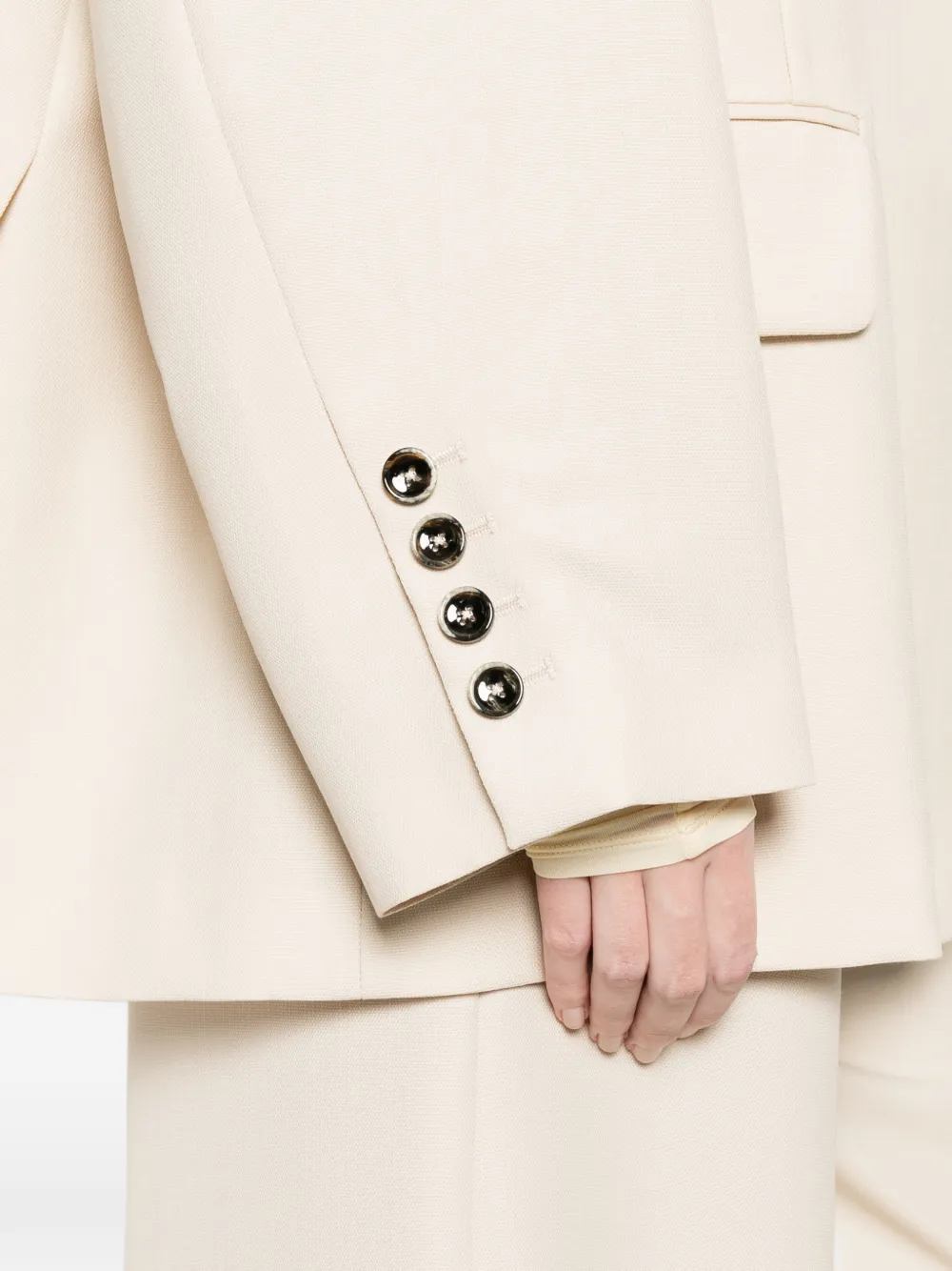 Светло-бежевый, накладные карманы, застежка на пуговицы, V-образный вырез, заостренные лацканы, длинные рукава