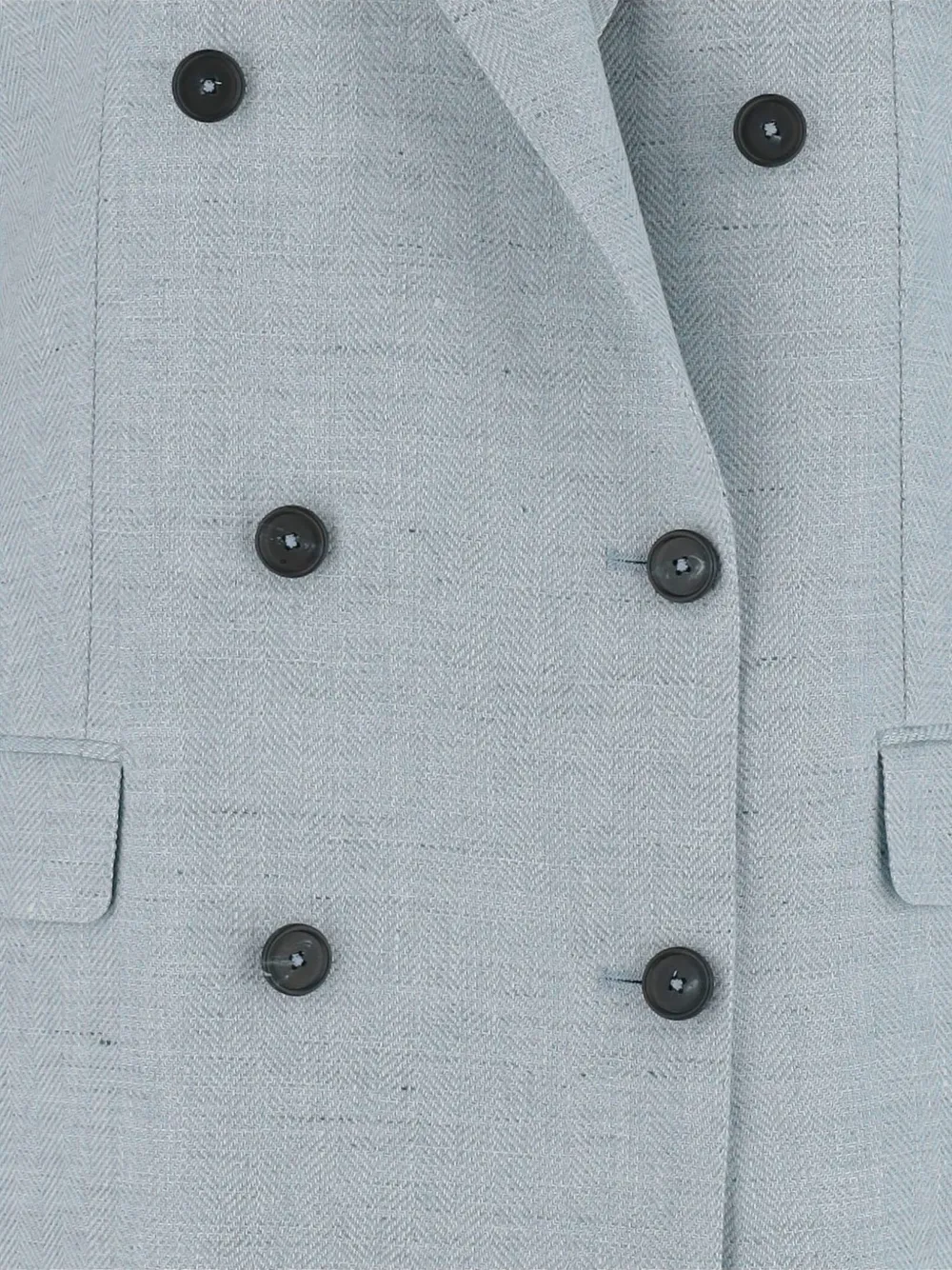 Светло-голубой двубортный пиджак на пуговицах с лацканами с вырезом, клапанами на карманах, длинными рукавами