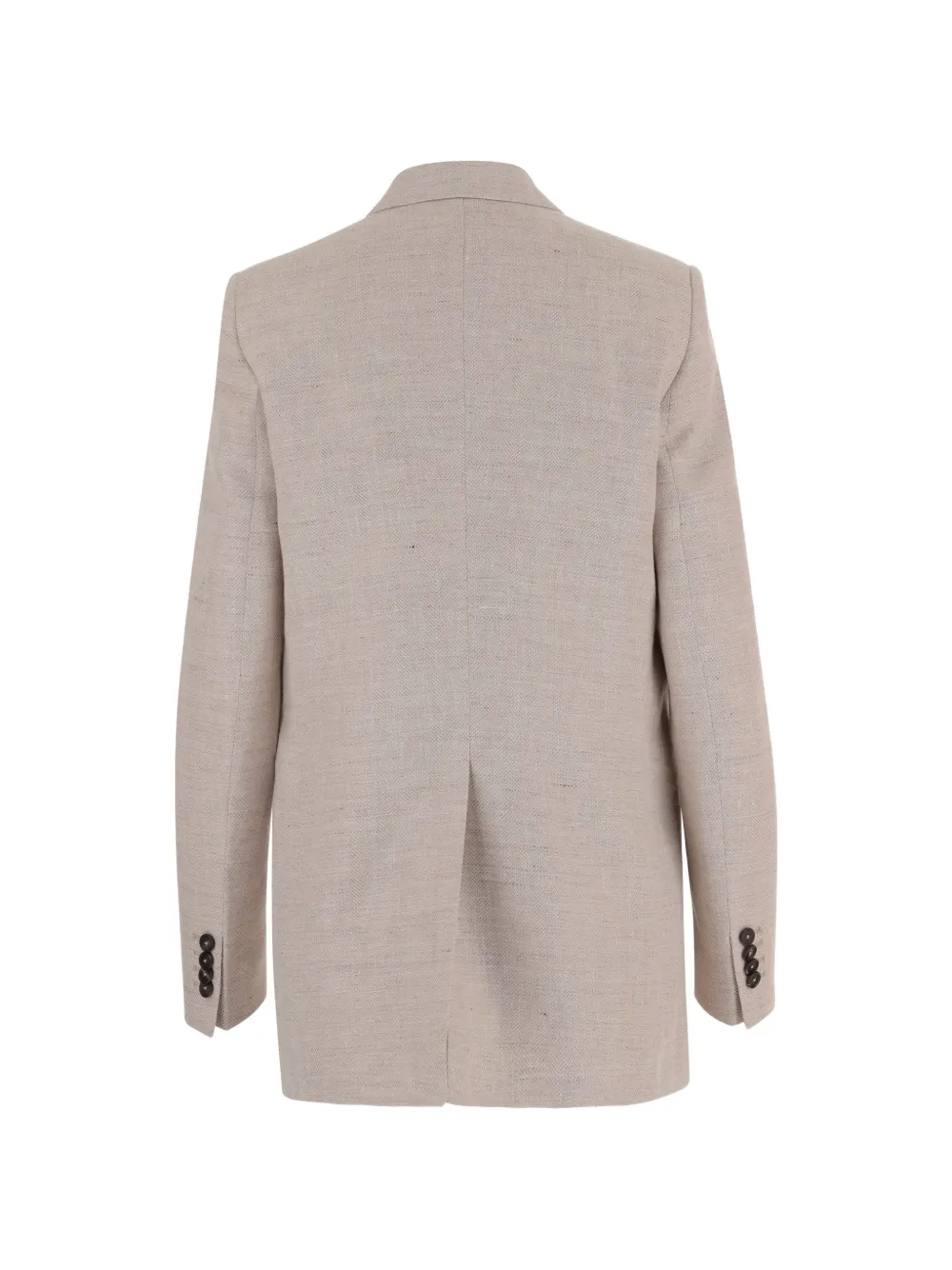 Бежевый двубортный пиджак, застежка на пуговицы, лацканы с вырезом, клапанные карманы, манжеты на пуговицах