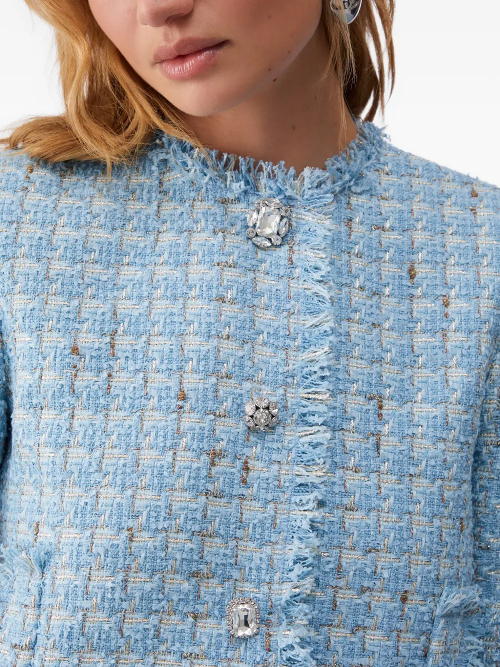 Светло-голубой букле, фактурная ткань, отделка бахромой, застежка на драгоценные пуговицы, передние карманы