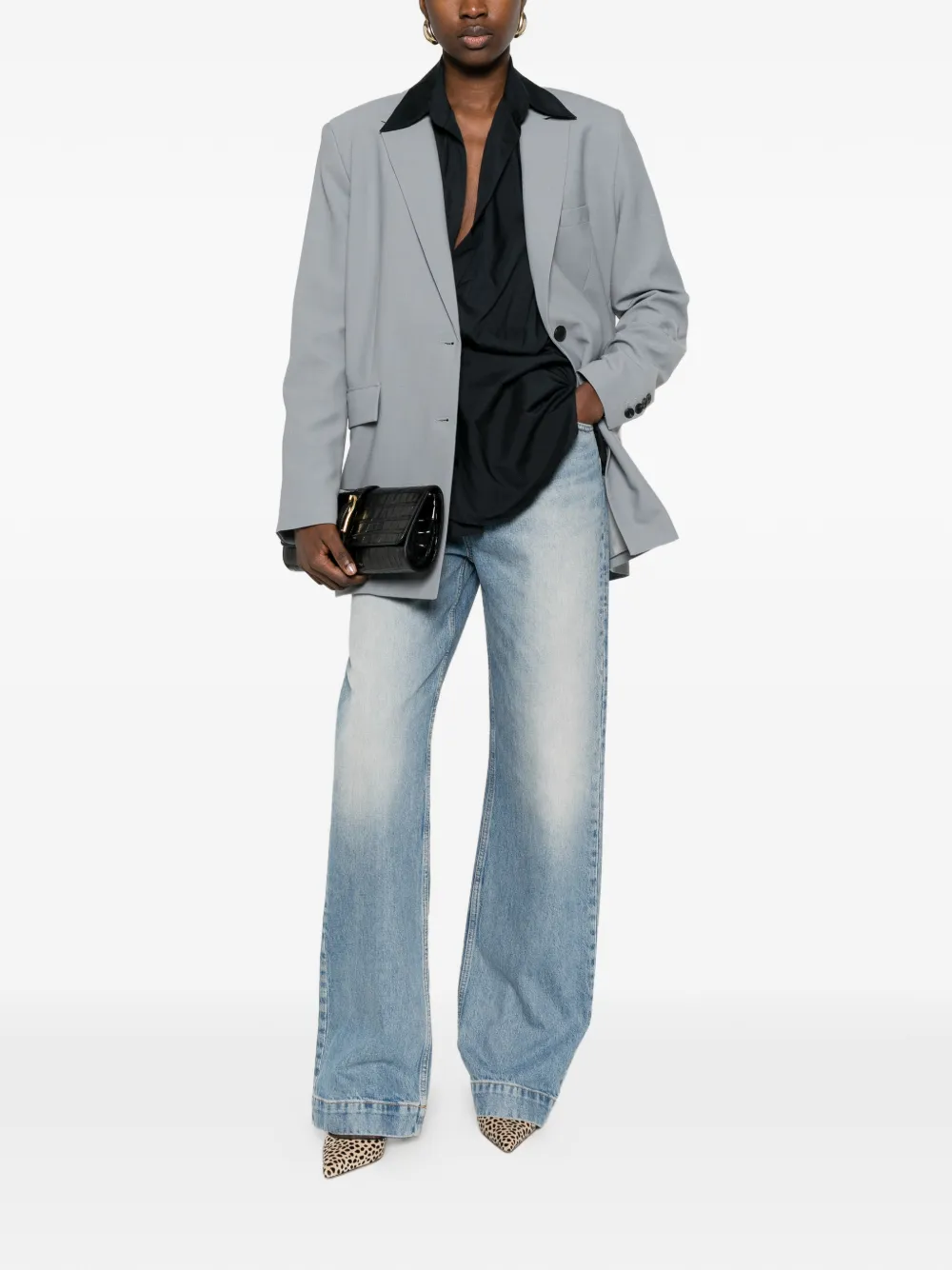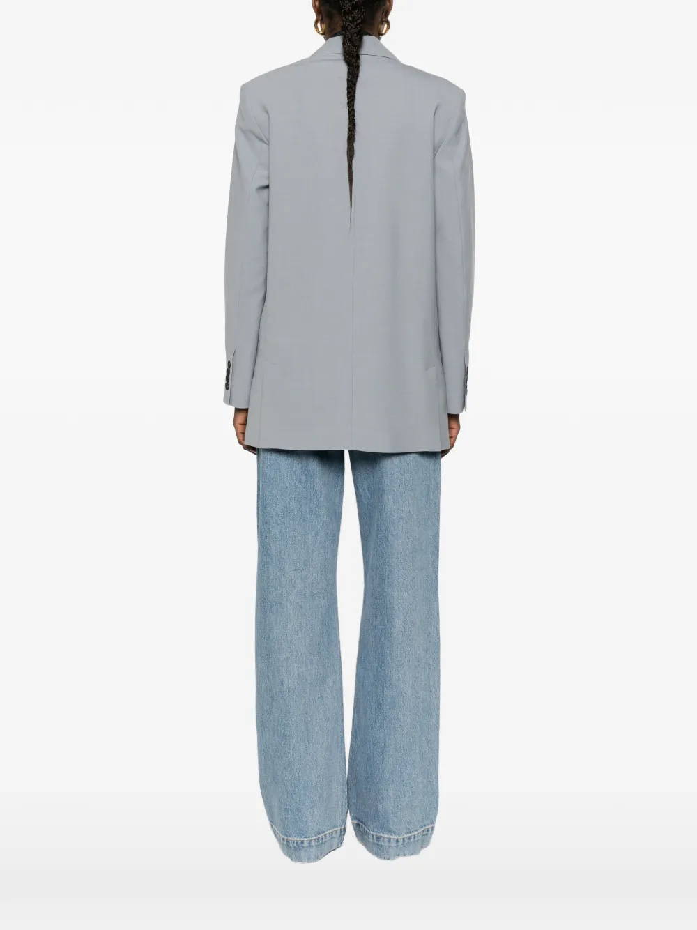 Серые заостренные лацканы, застежка на пуговицы, прорезные карманы с клапанами, длинные рукава, прямой низ