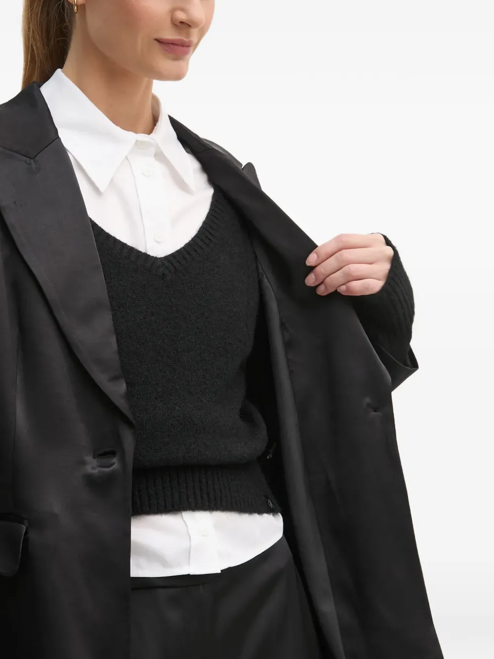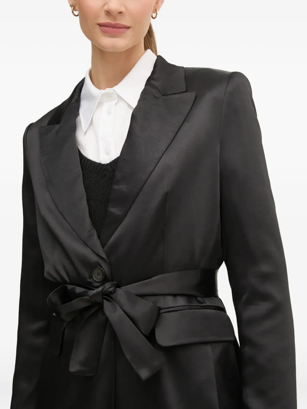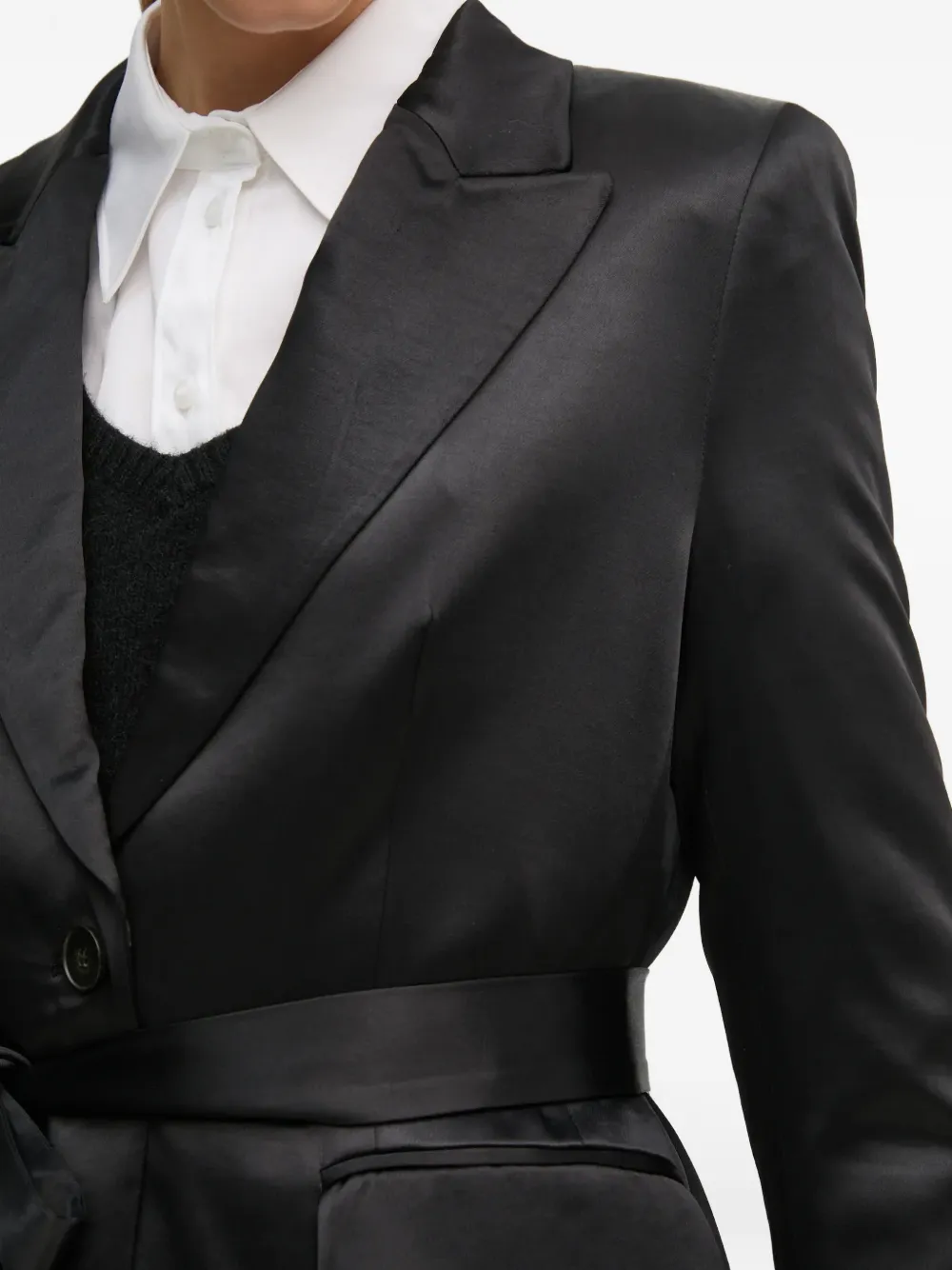Черный пояс, клапаны на карманах, застежка на одну пуговицу, лацканы с острыми концами, длинные рукава