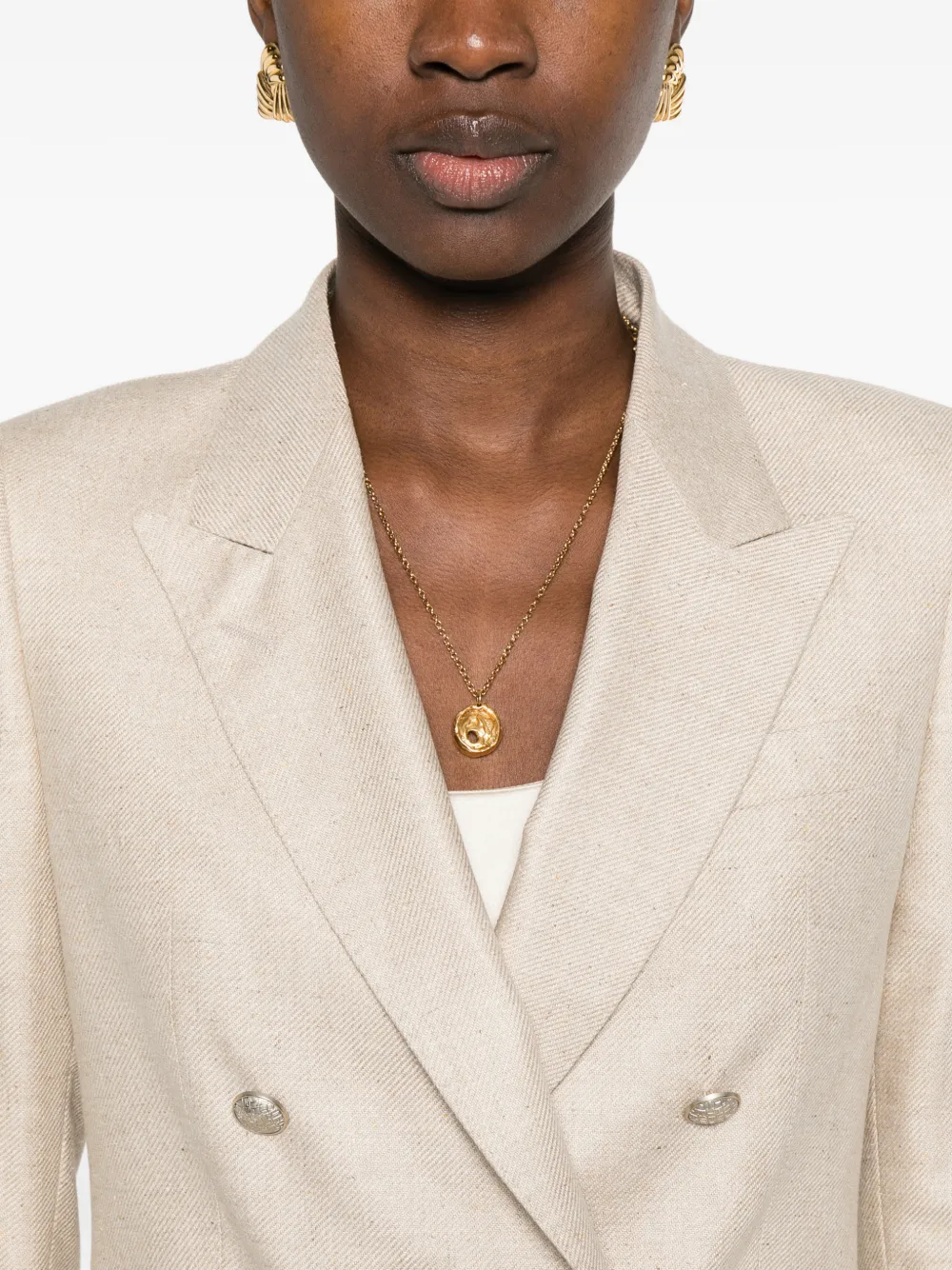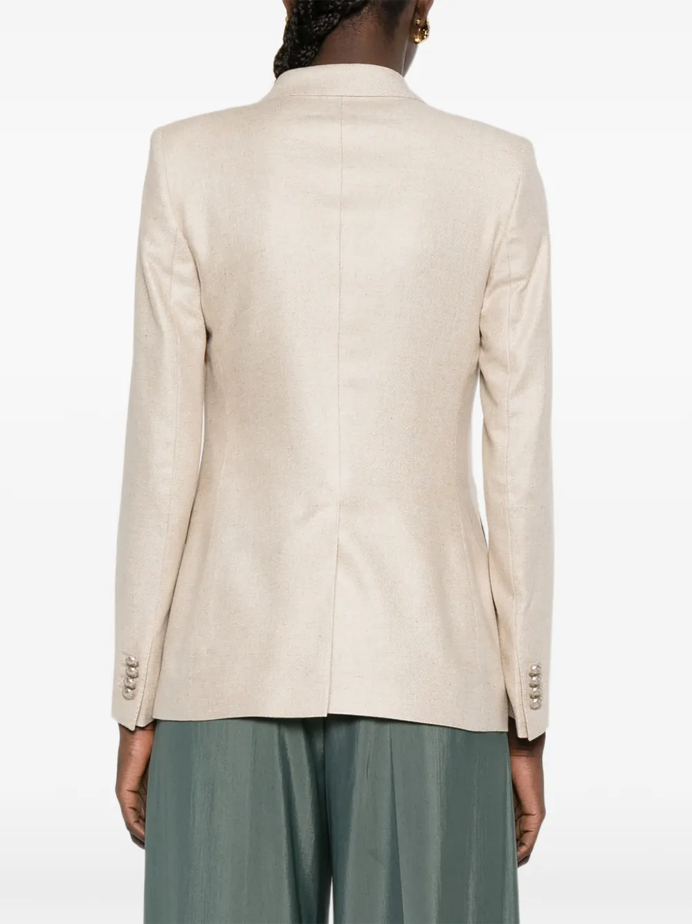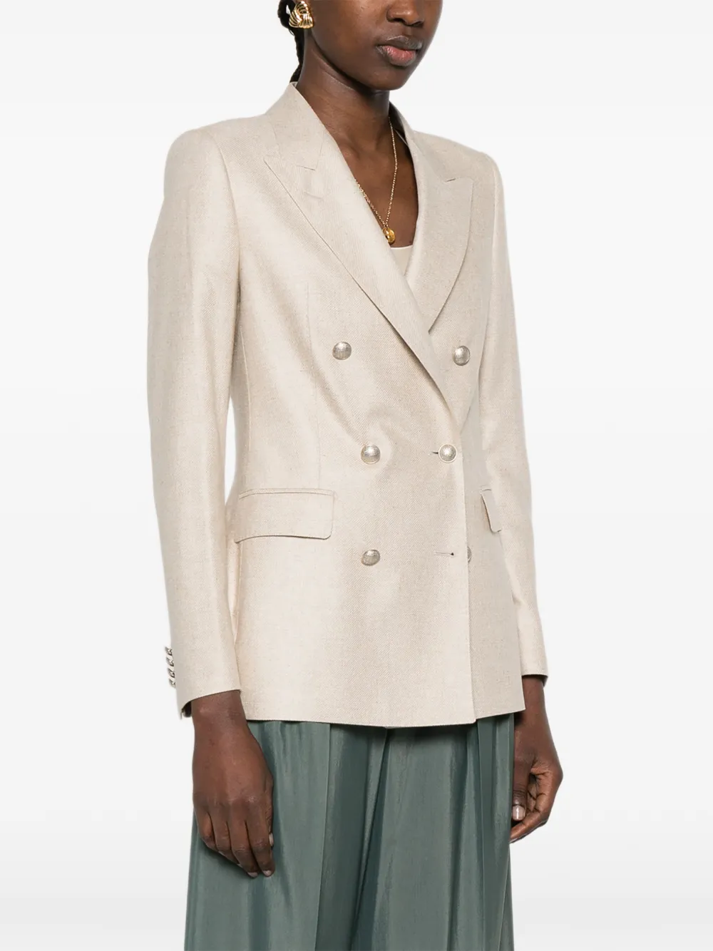 Светло-бежевый, двубортная застежка на пуговицы, лацканы с вырезом, передние клапанные карманы