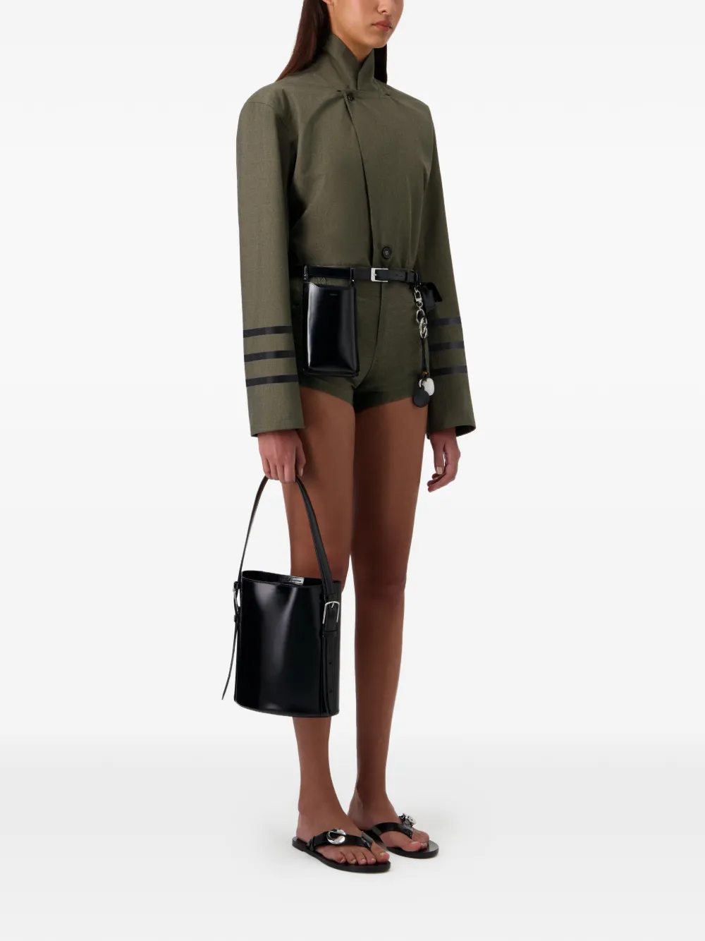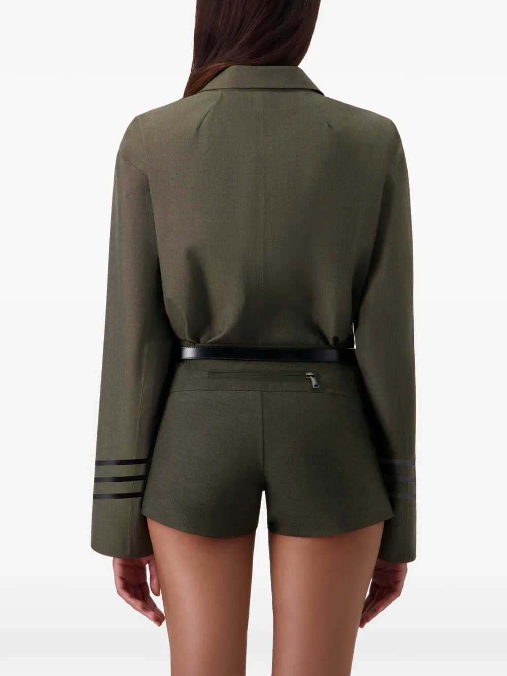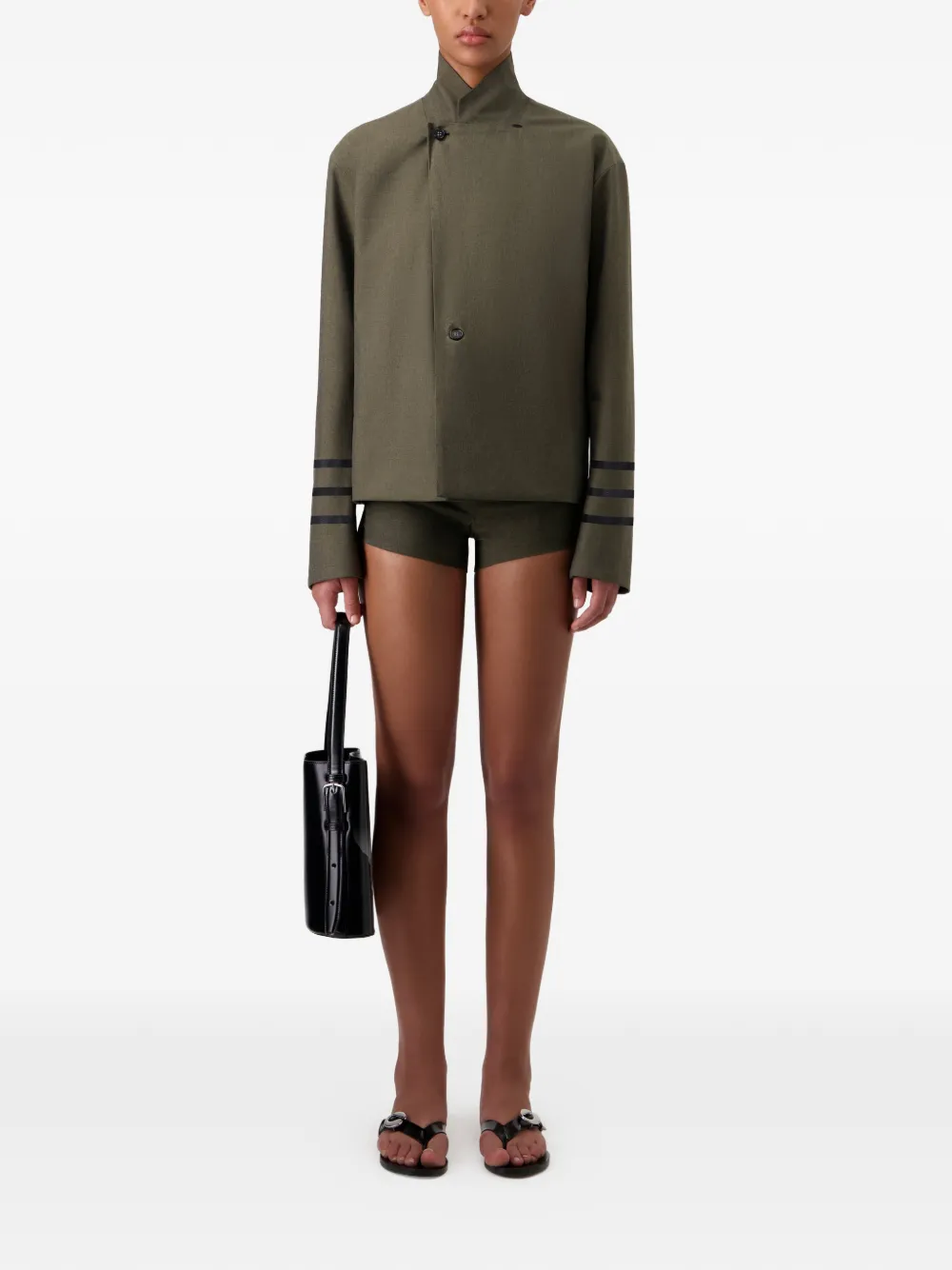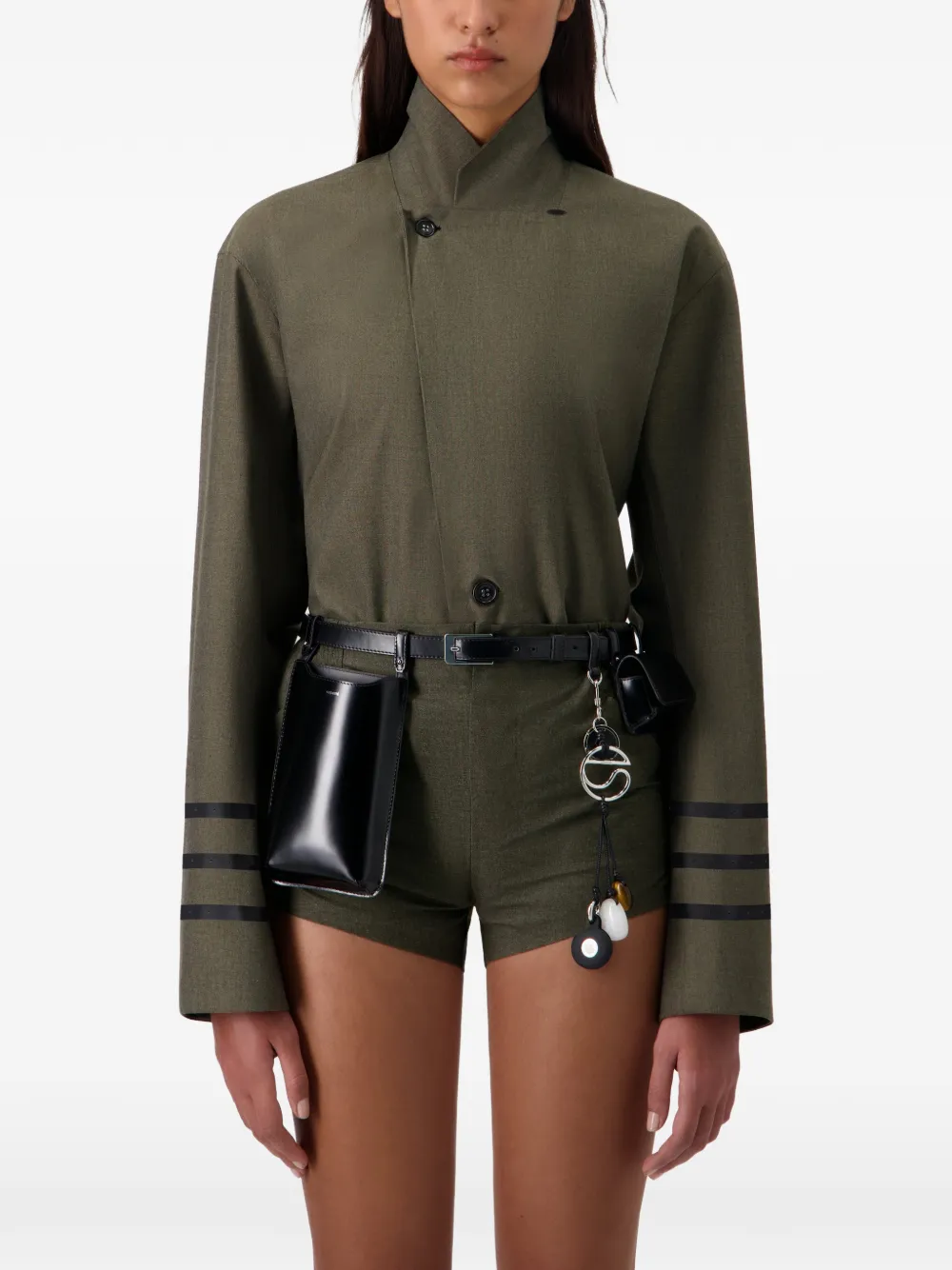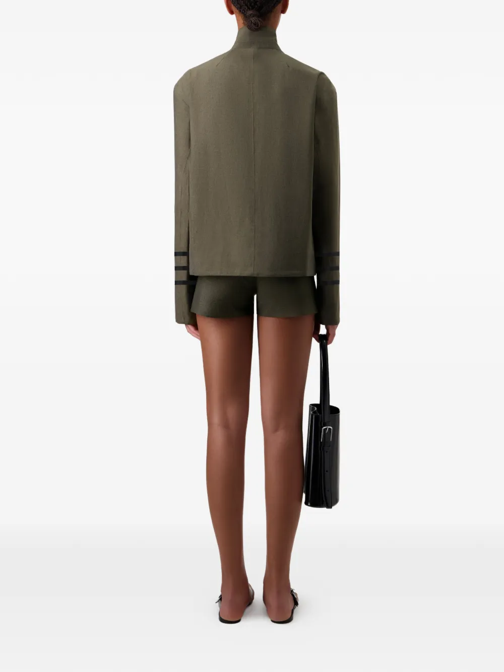 Зеленый цвет, V-образный вырез, лацканы, застежка на пуговицы, рукава в полоску, прямой низ