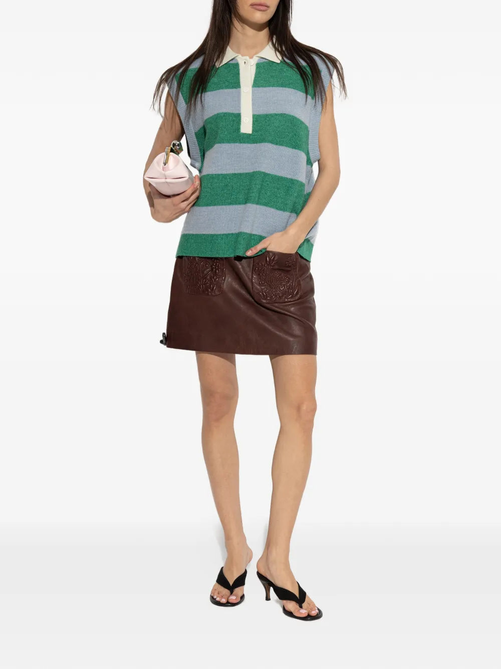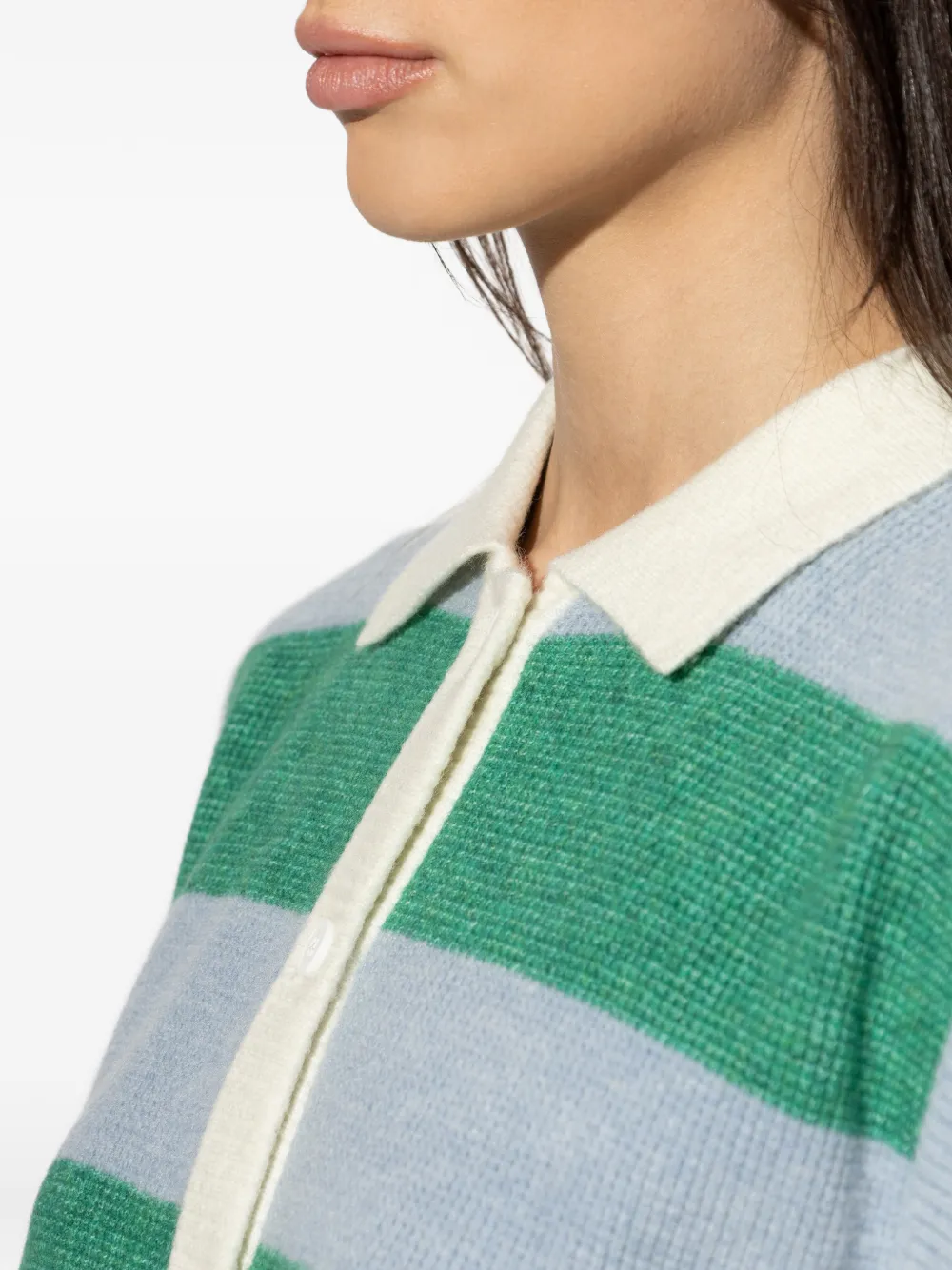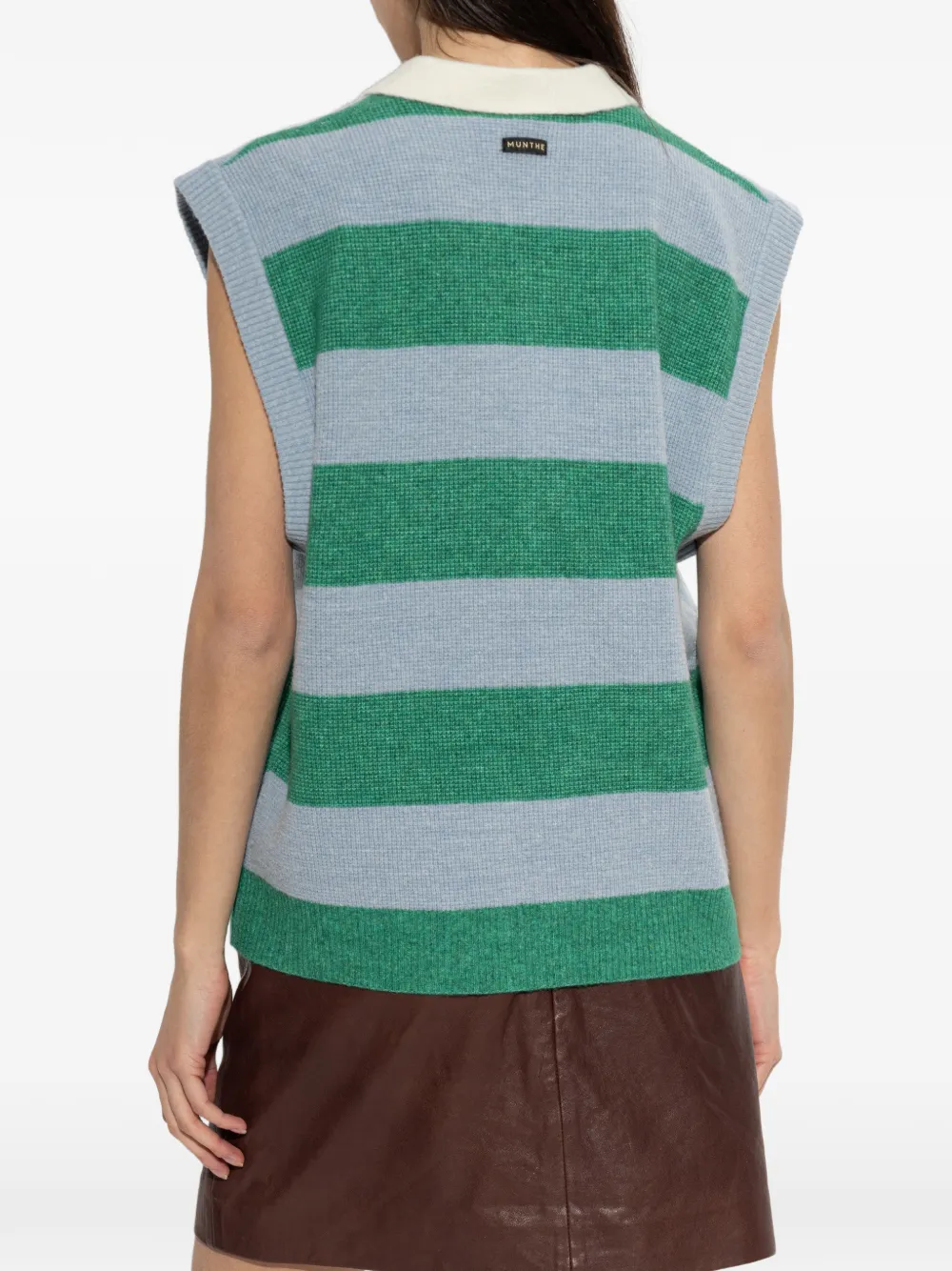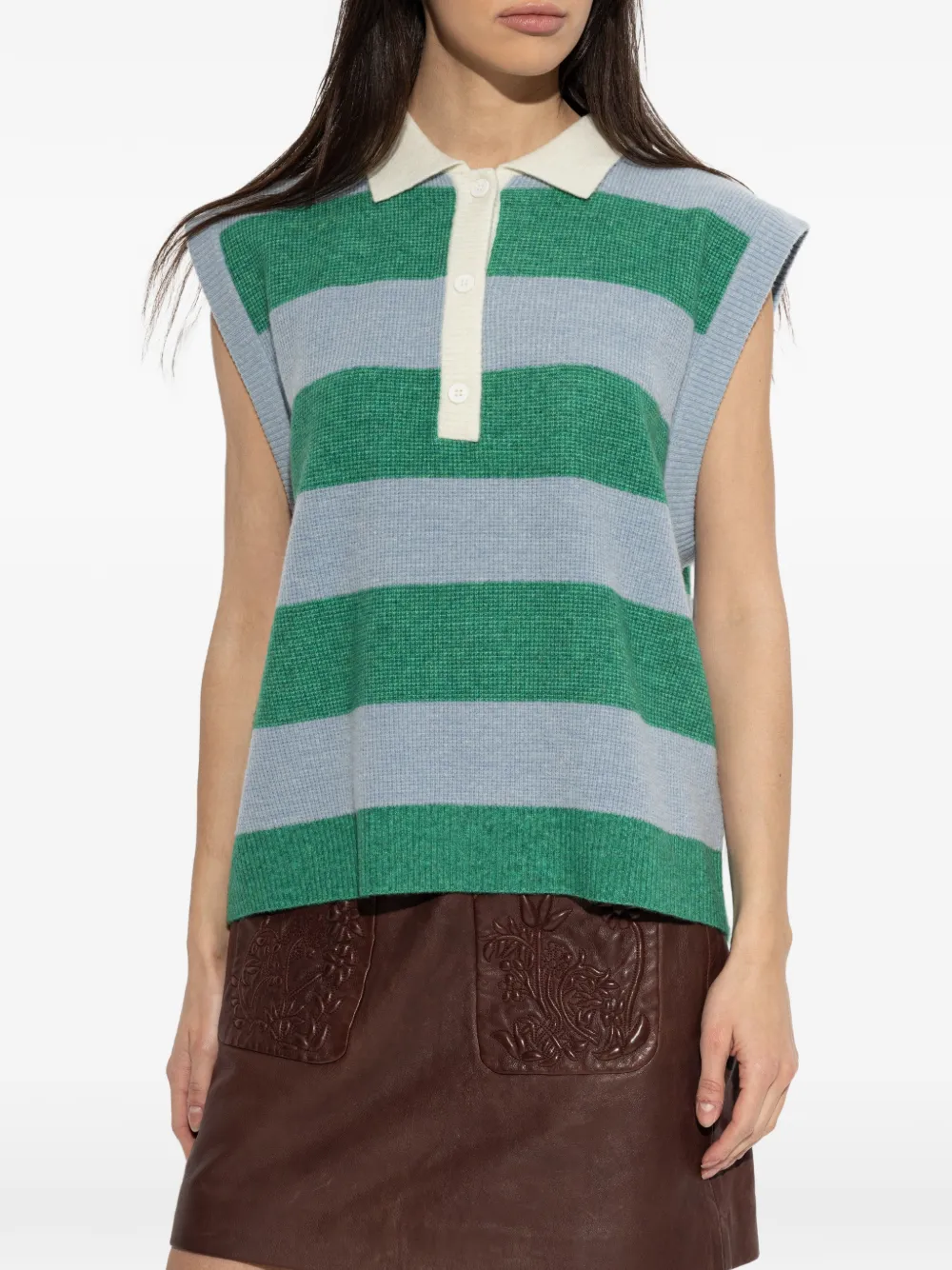 Зелено-синее полосатое поло без рукавов с застежкой на пуговицы и вязаным дизайном