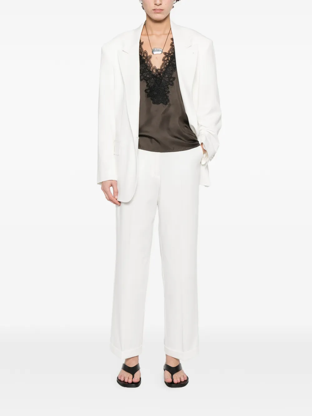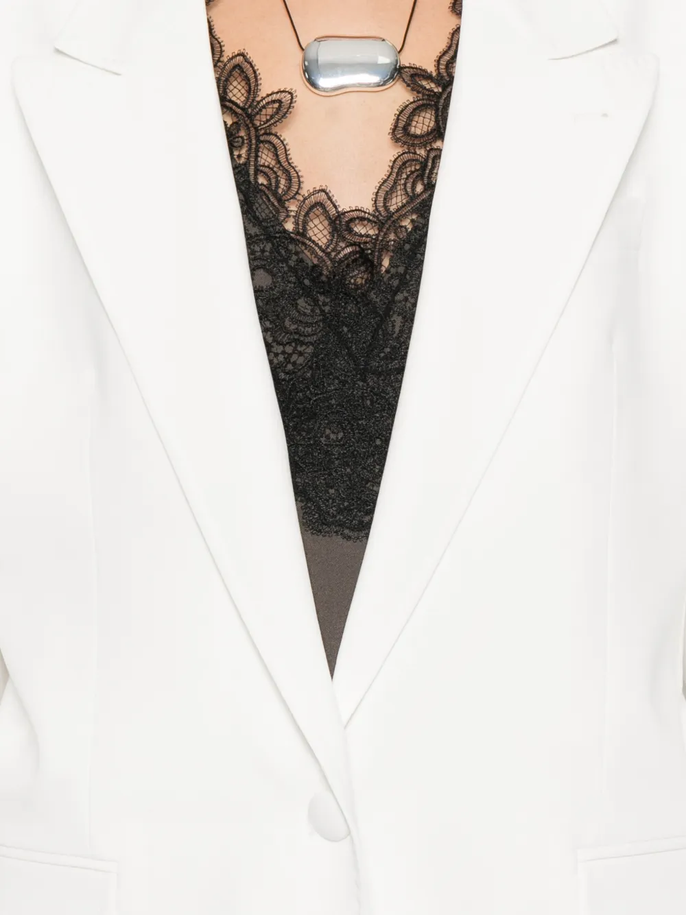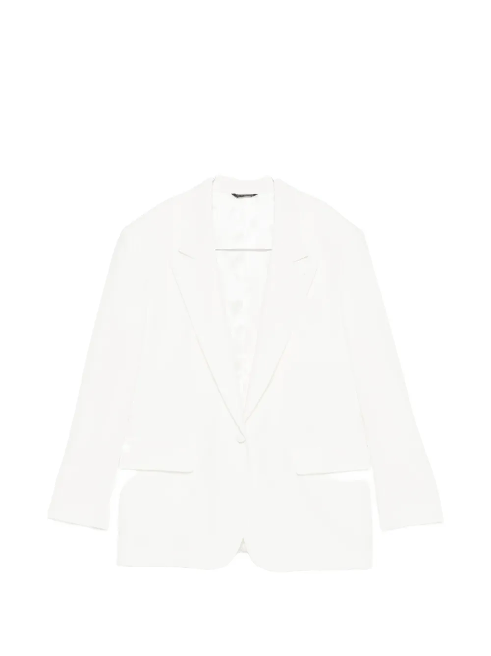 Белый, застегивается на пуговицы, лацканы с острыми концами, прорезные карманы с клапанами, длинные рукава