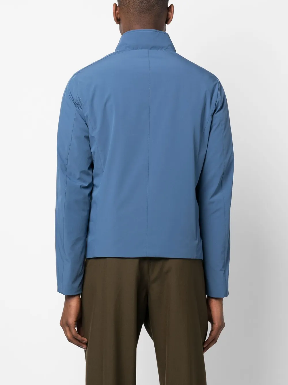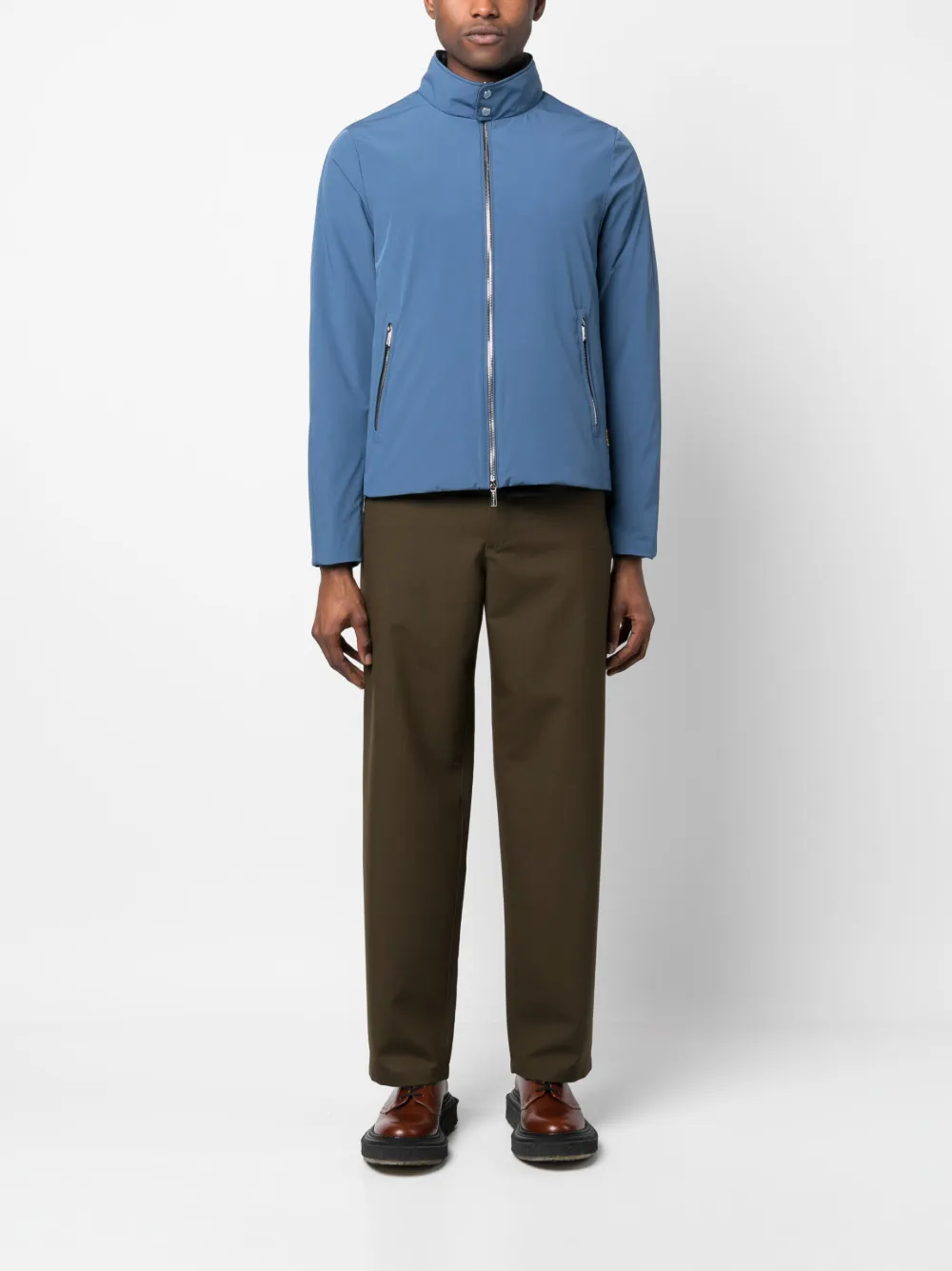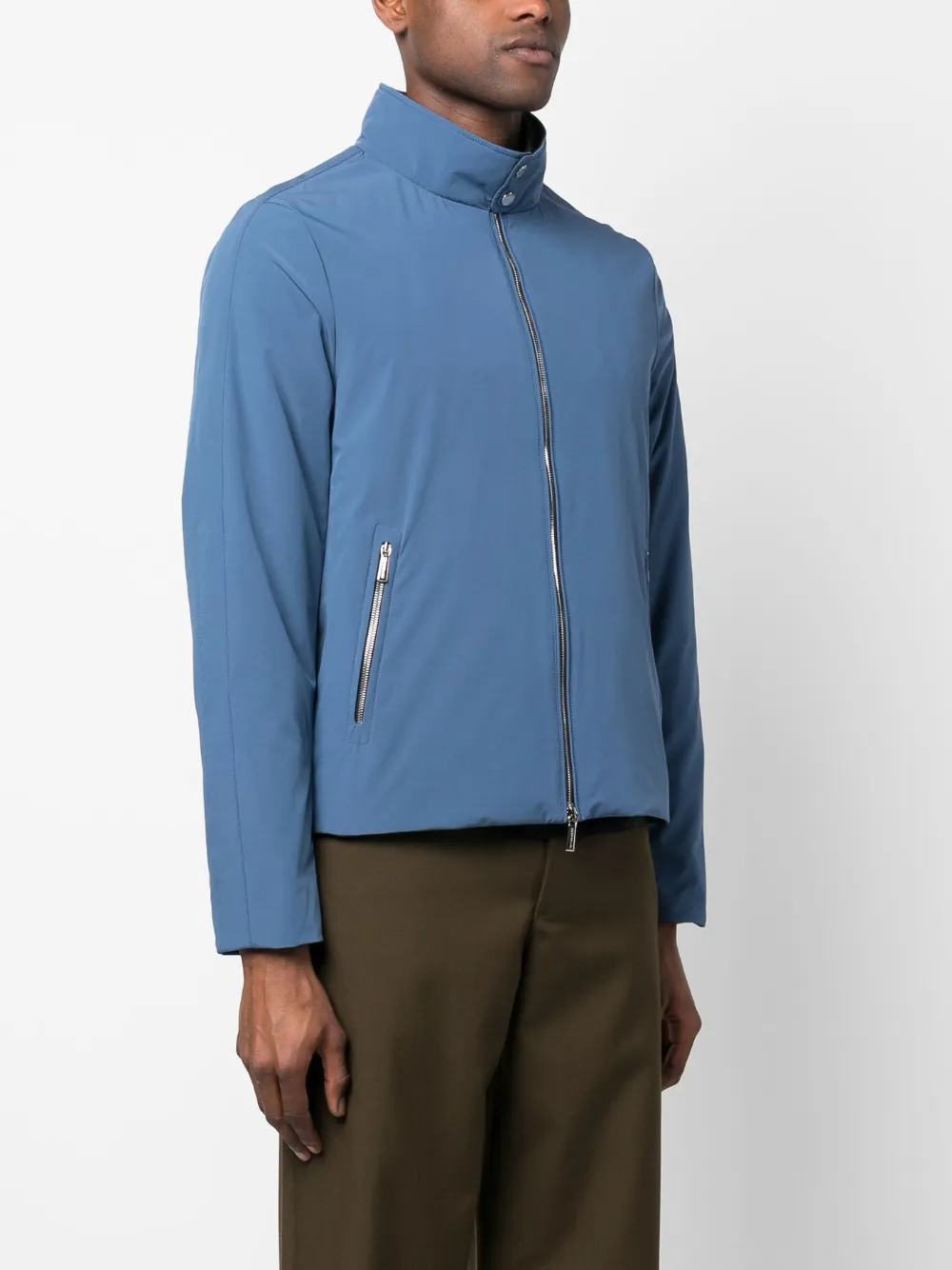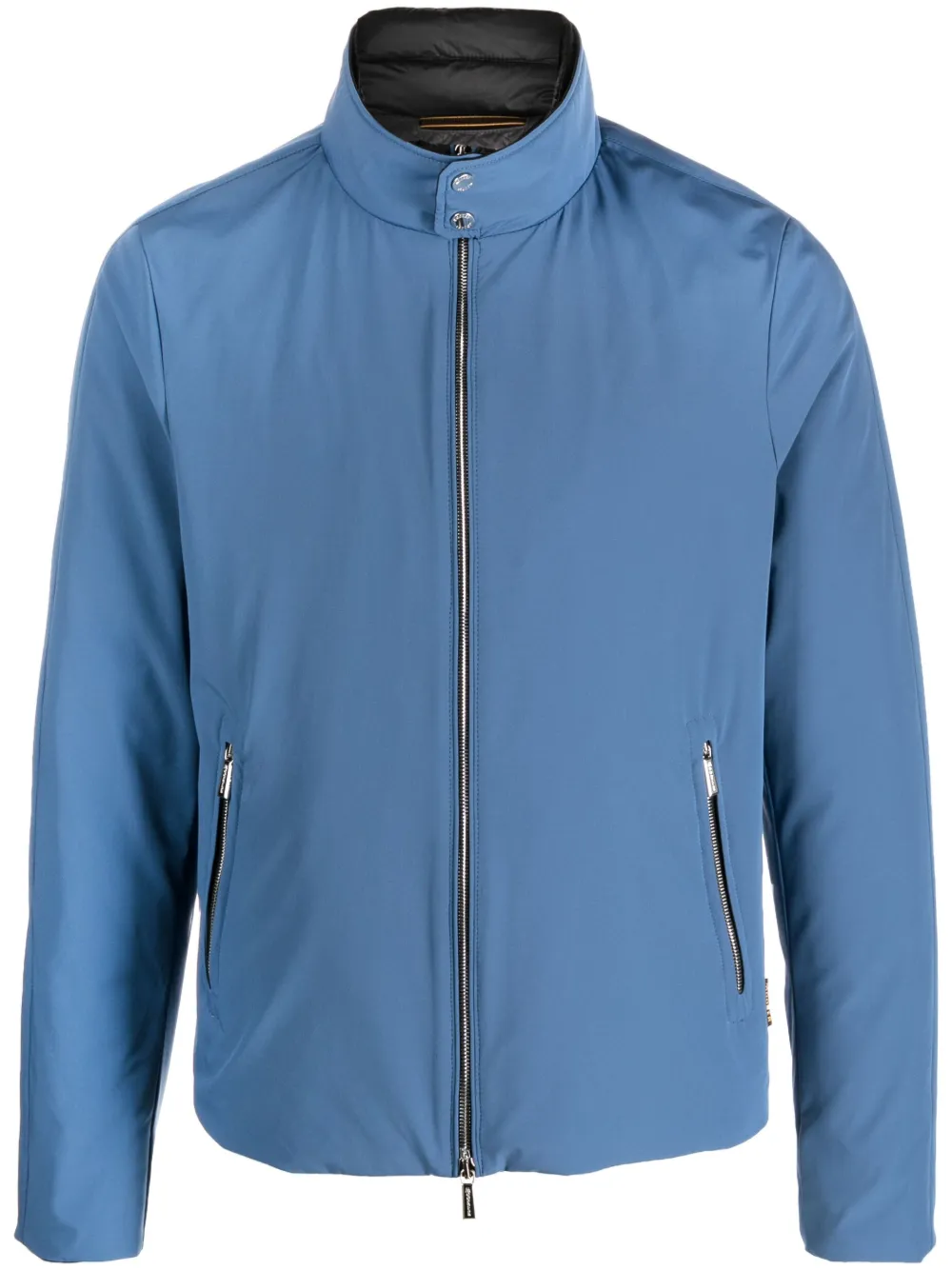 Васильковый, эластичный материал, легкий материал, высокий воротник, застежка на молнии спереди, передние карманы на молнии, прямой подол и длинные рукава.