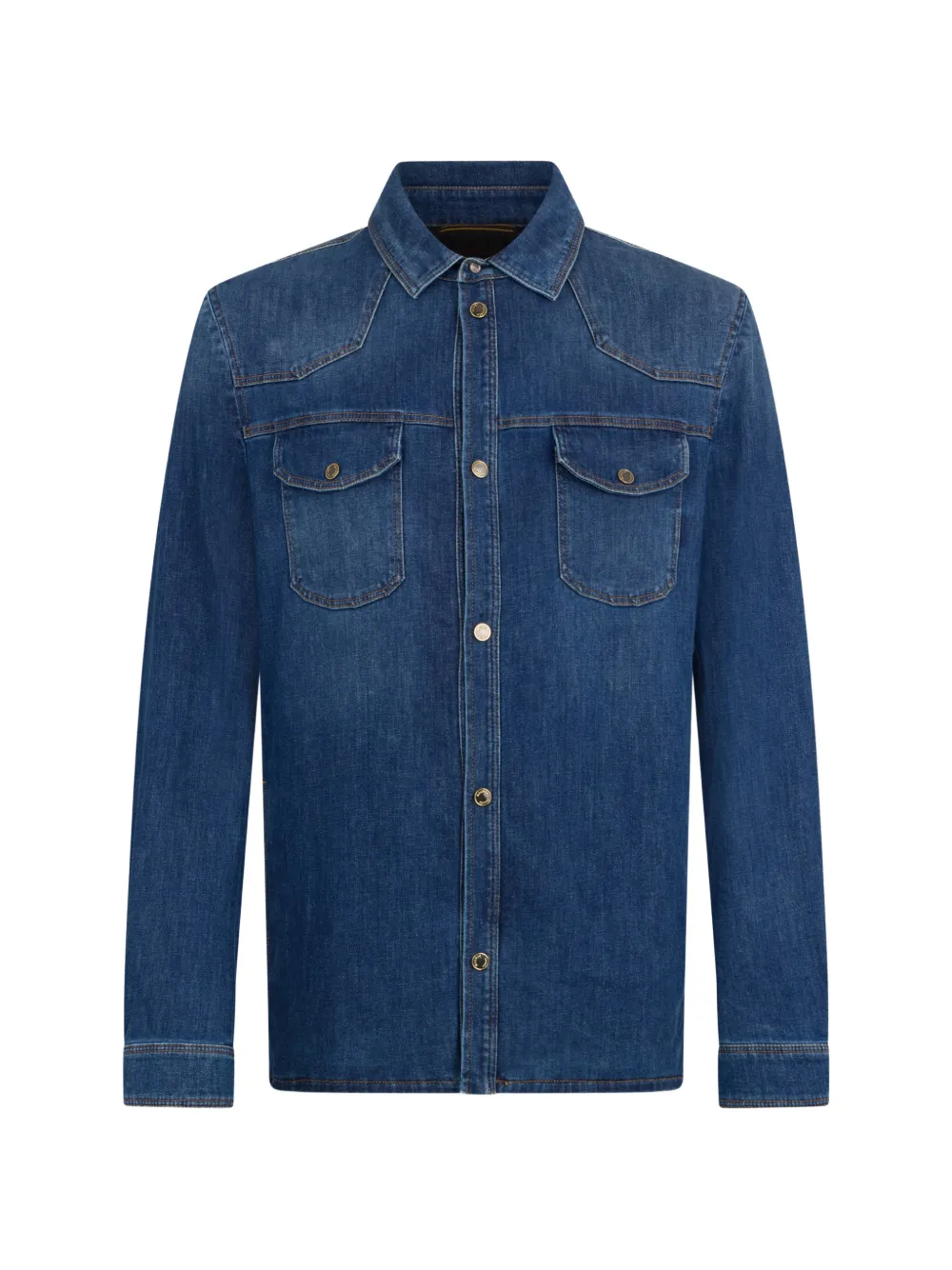 Синий, застежка на пуговицы, нагрудные карманы, длинные рукава, манжеты на пуговицах, заостренный воротник