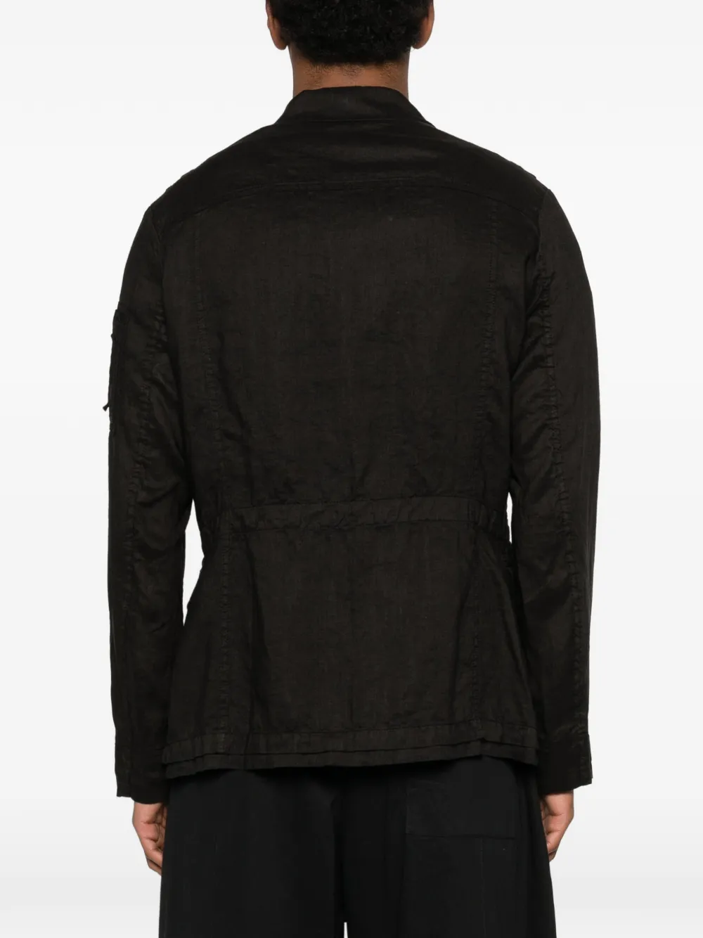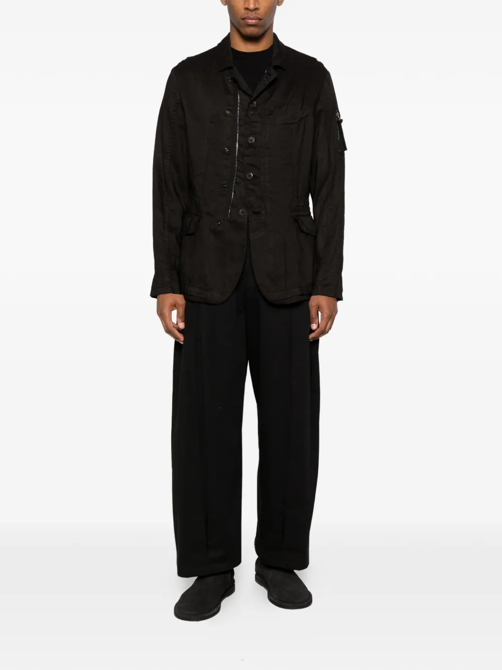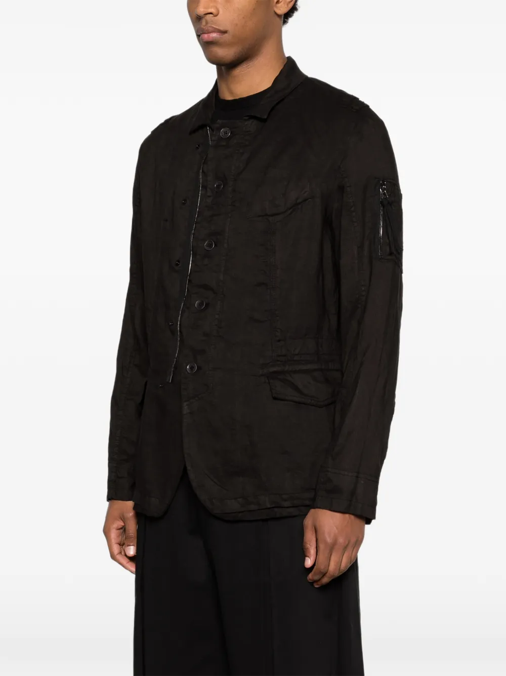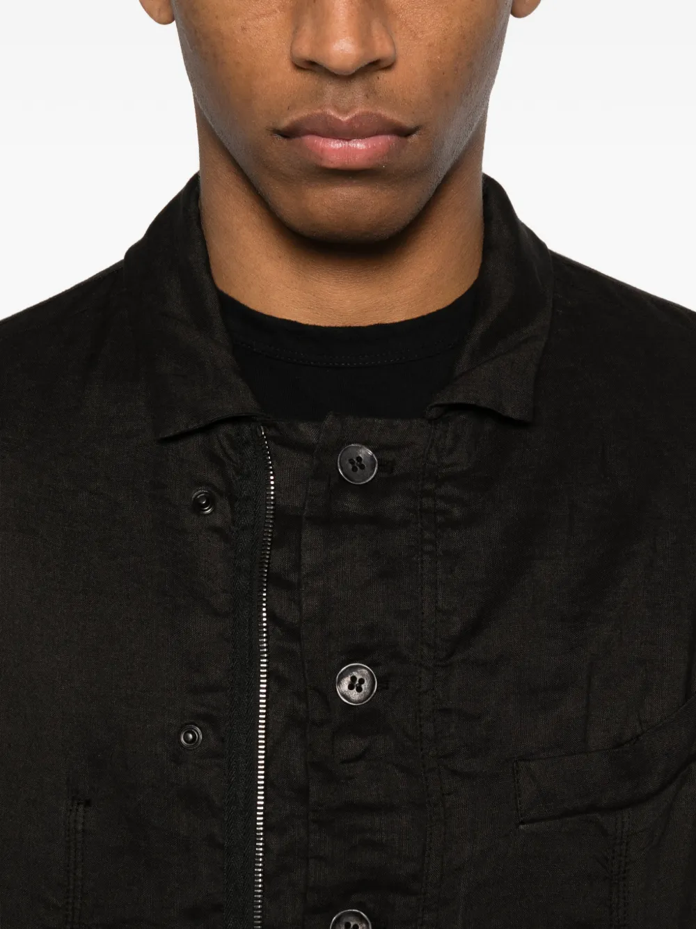 Черный цвет, нагрудный карман, накладные карманы с клапанами спереди, застежка на пуговицы, деталь-молния