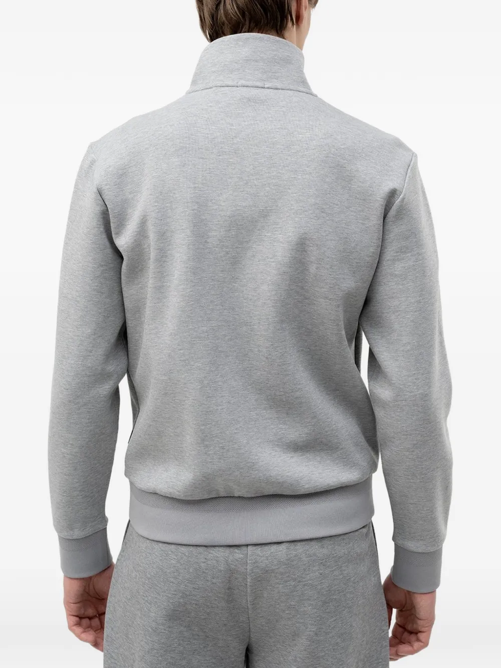 Серый цвет, застежка-молния, прорезные карманы, ребристые нижний край и манжеты, высокий воротник