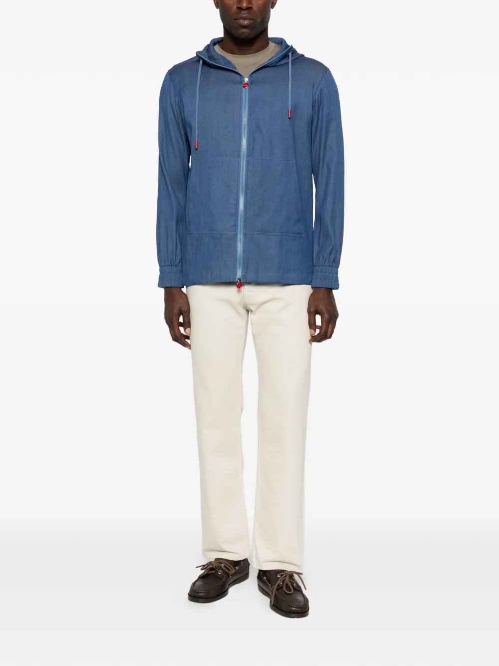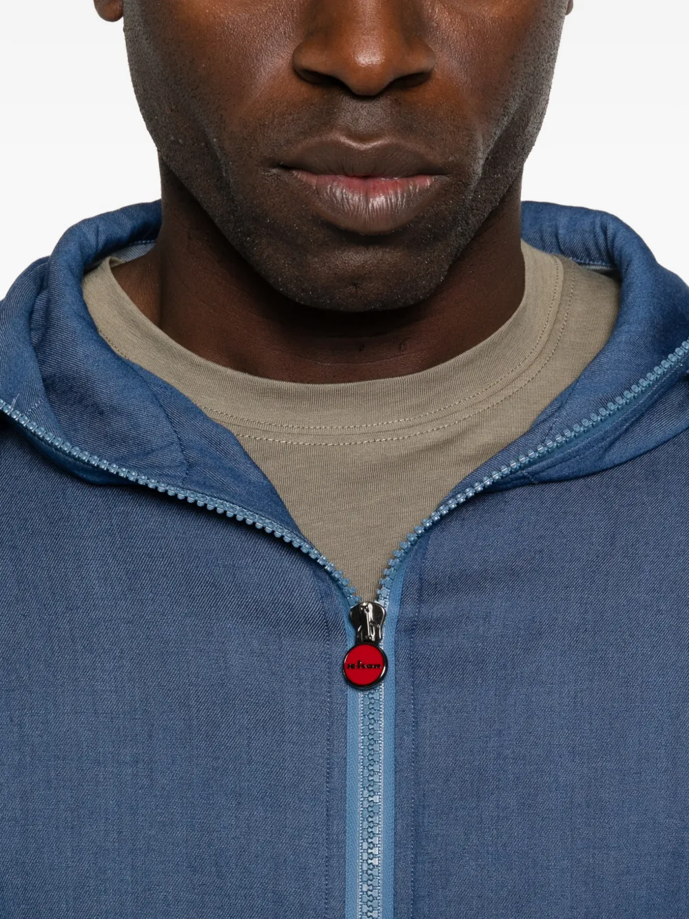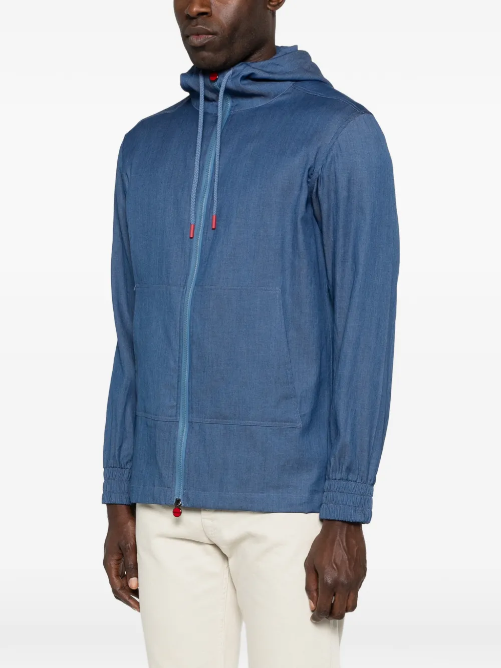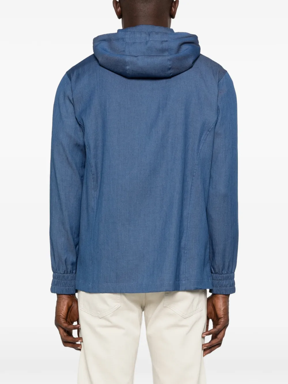 Синий цвет, капюшон, застежка-молния на шее, накладной карман, длинные рукава, эластичные манжеты
