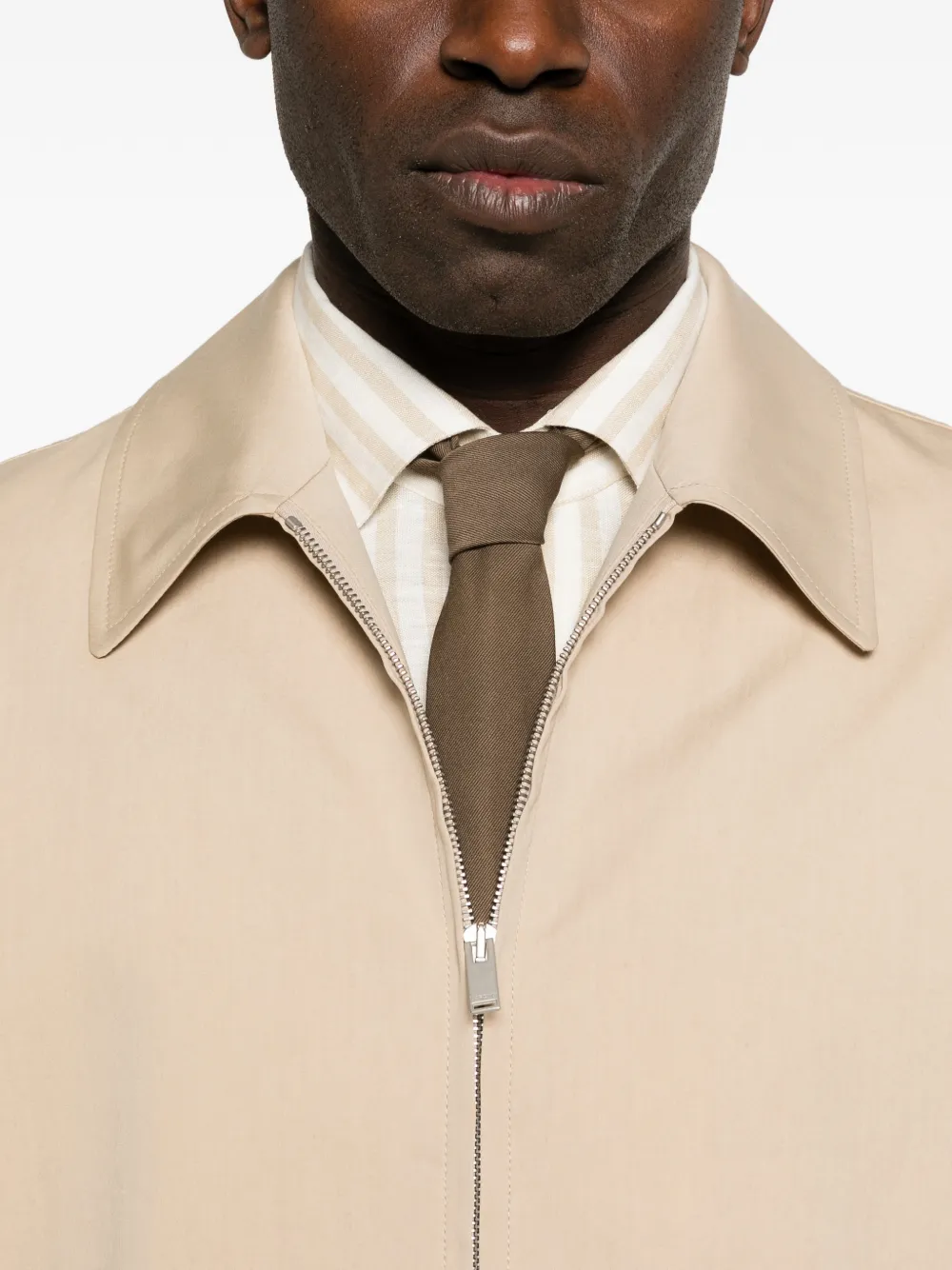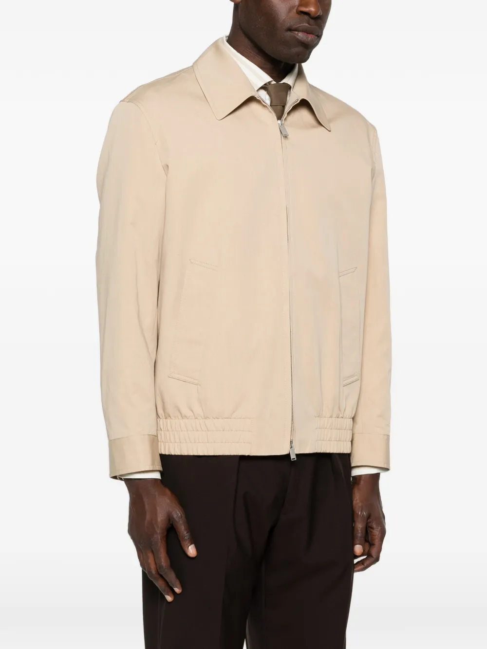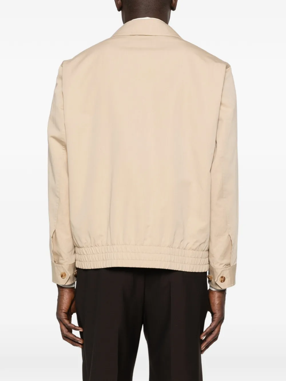 Светло-бежевый цвет, застежка-молния, эластичный край, манжеты на пуговицах, передние карманы