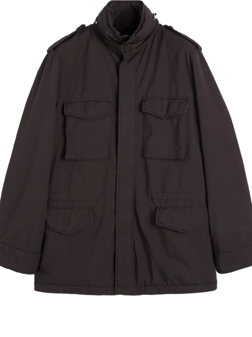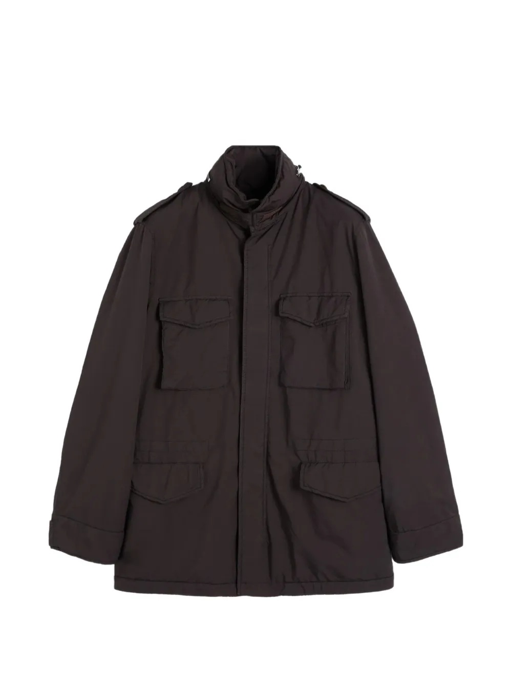 Коричневый цвет, застежка на пуговицы, несколько карманов, погоны на плечах, высокий воротник