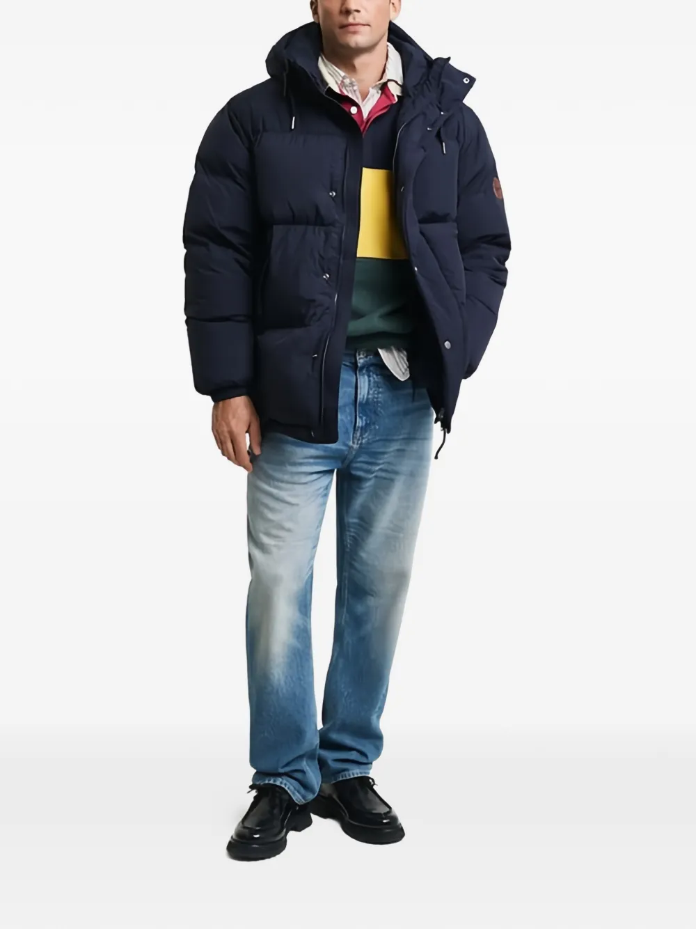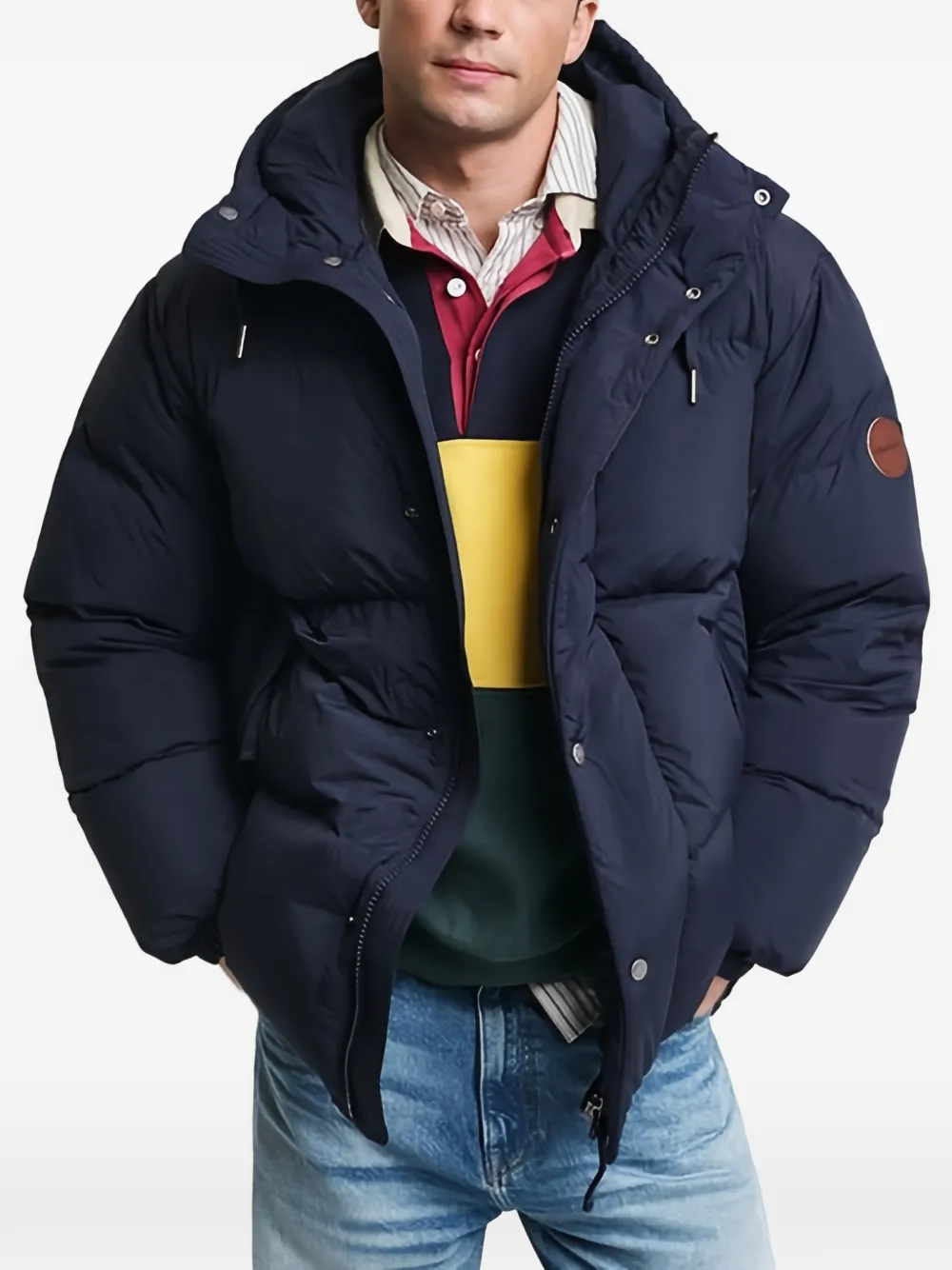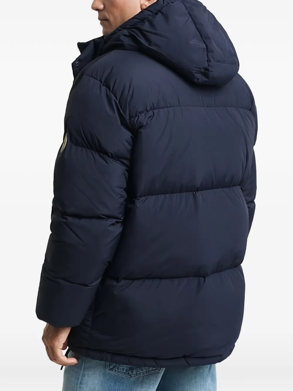 Синяя куртка с капюшоном, застежкой на пуговицы, передними карманами и нашивкой с логотипом