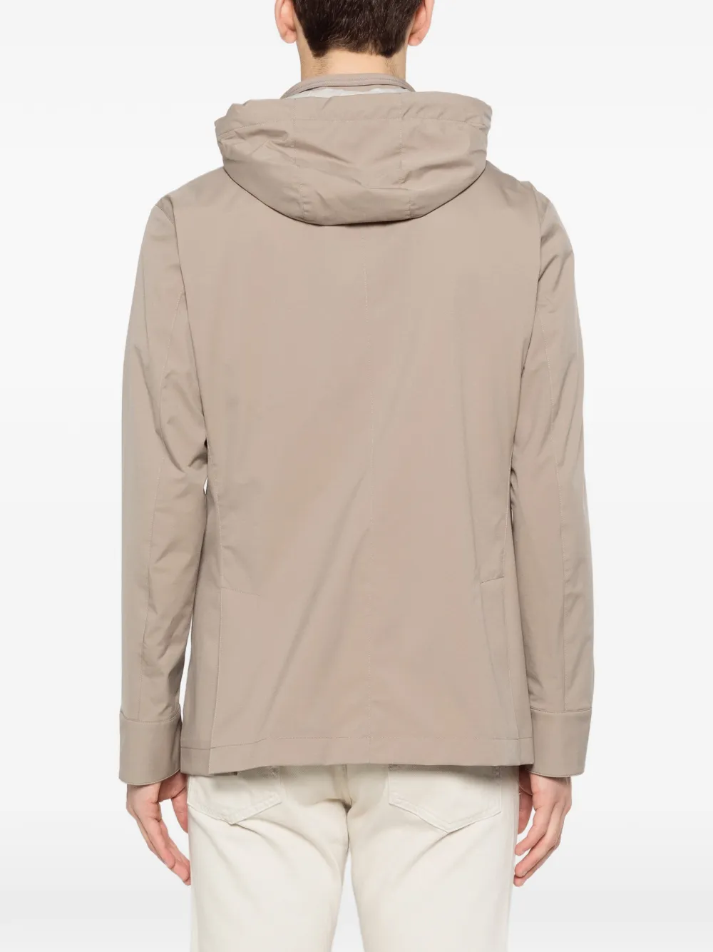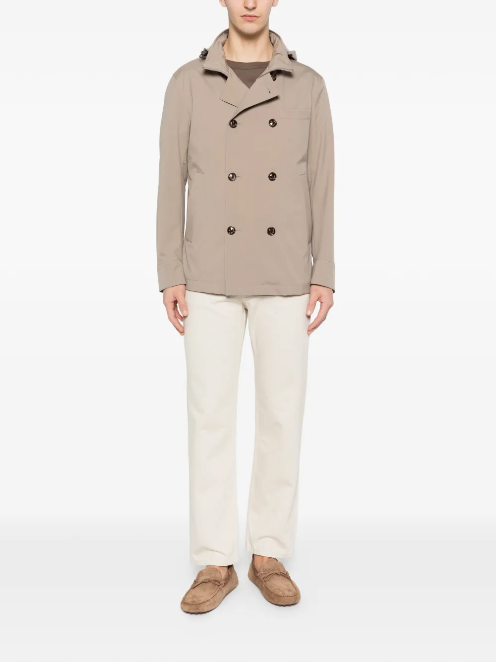 Песочно-хакки, застежка на пуговицы, капюшон, боковые карманы, длинные рукава, двубортный