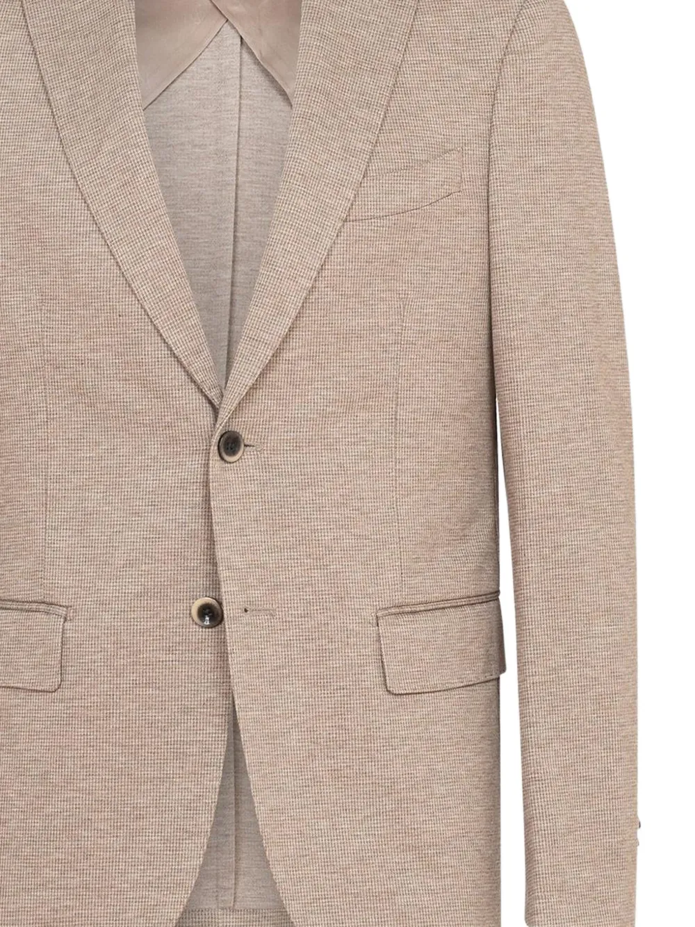 Нейтральный клетчатый узор, застежка на пуговицы, лацканы с вырезом, клапанные карманы