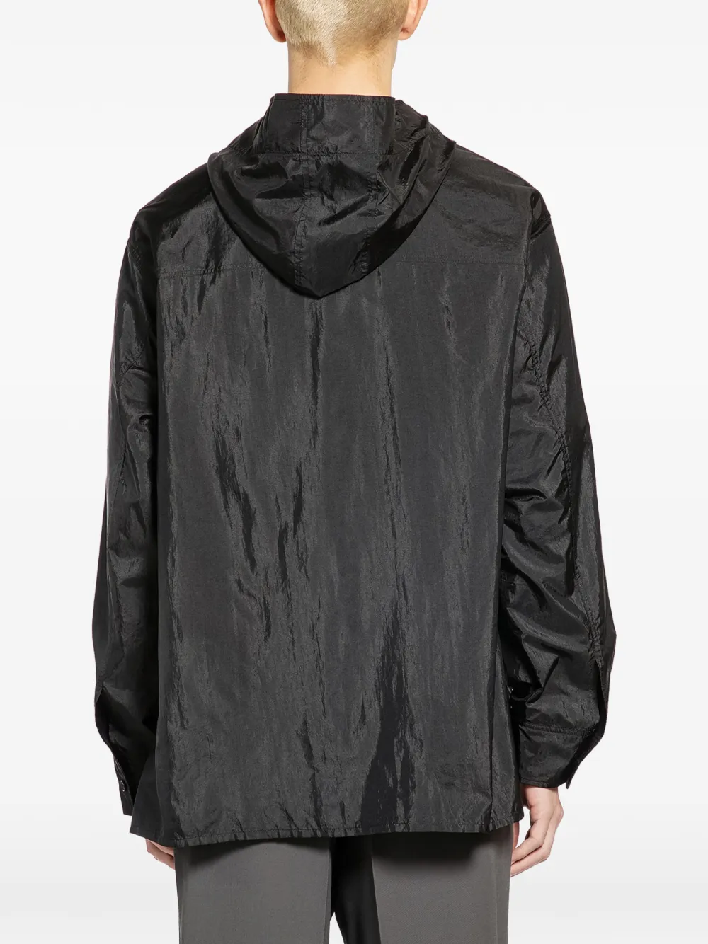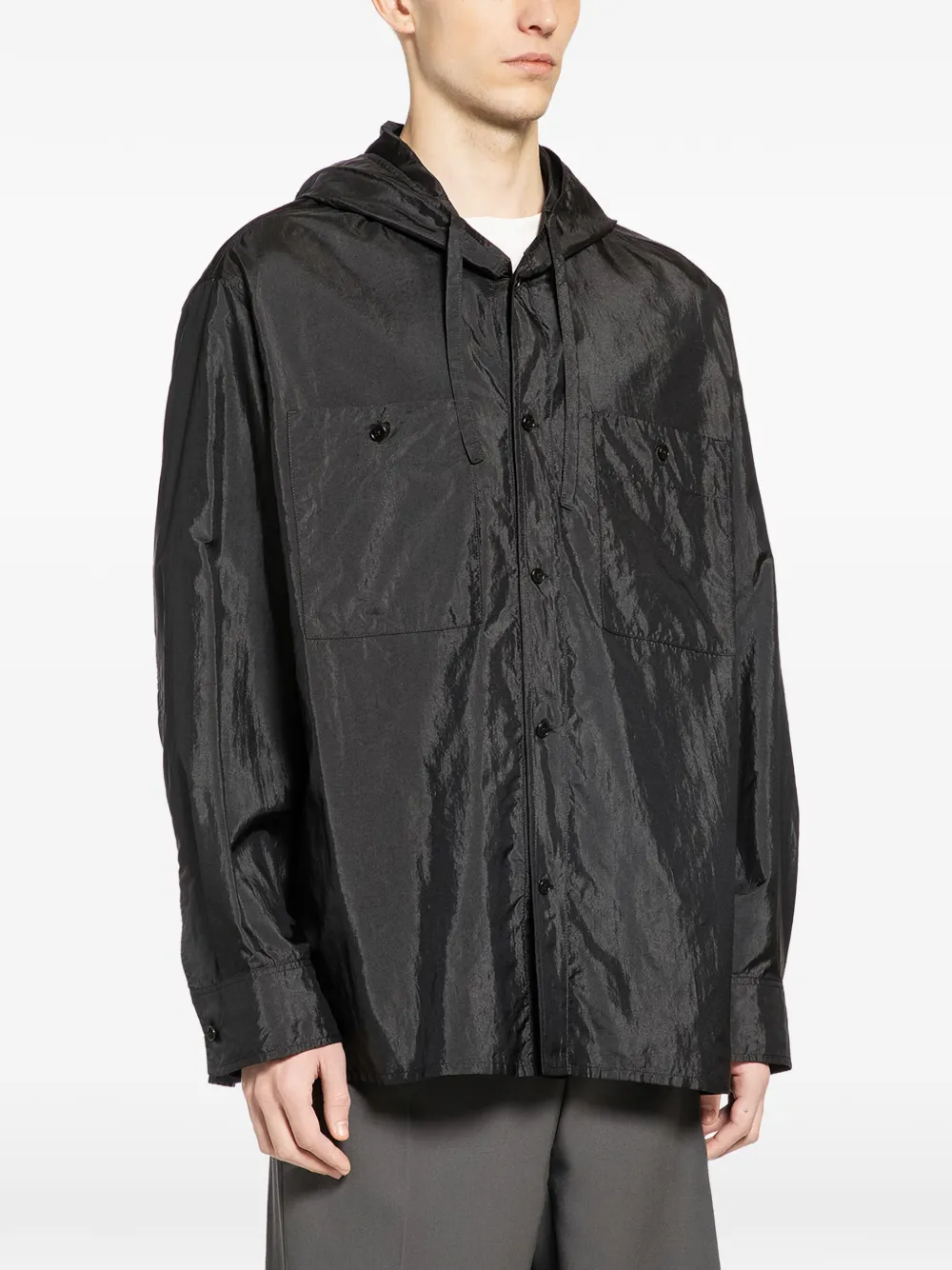 Черный, застегивается на пуговицы, нагрудные карманы, длинные рукава, с капюшоном