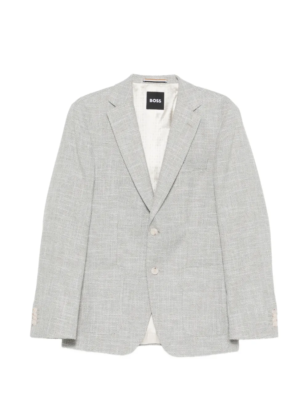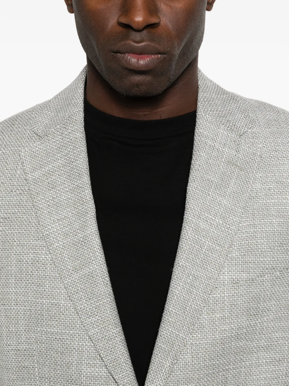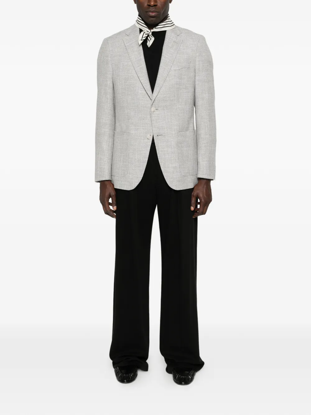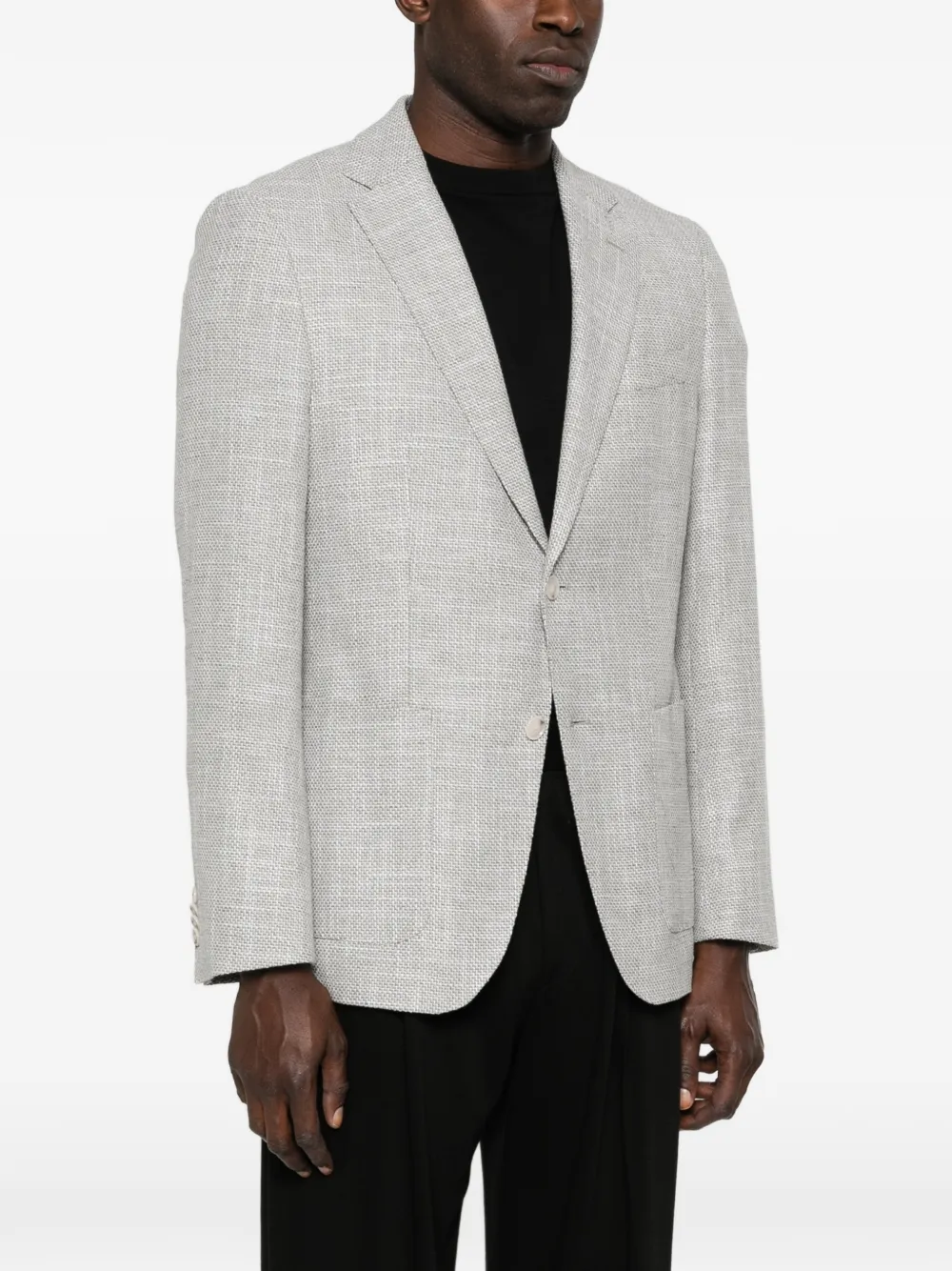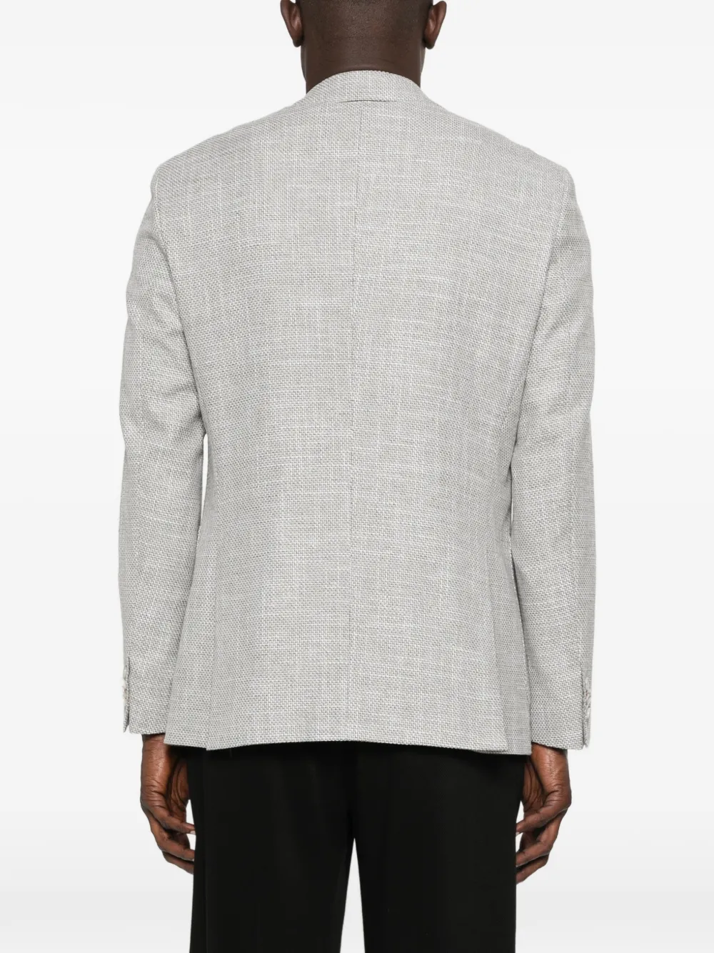 Светло-серый с узором, застежка на пуговицы, лацканы с вырезом, отделка из кожи