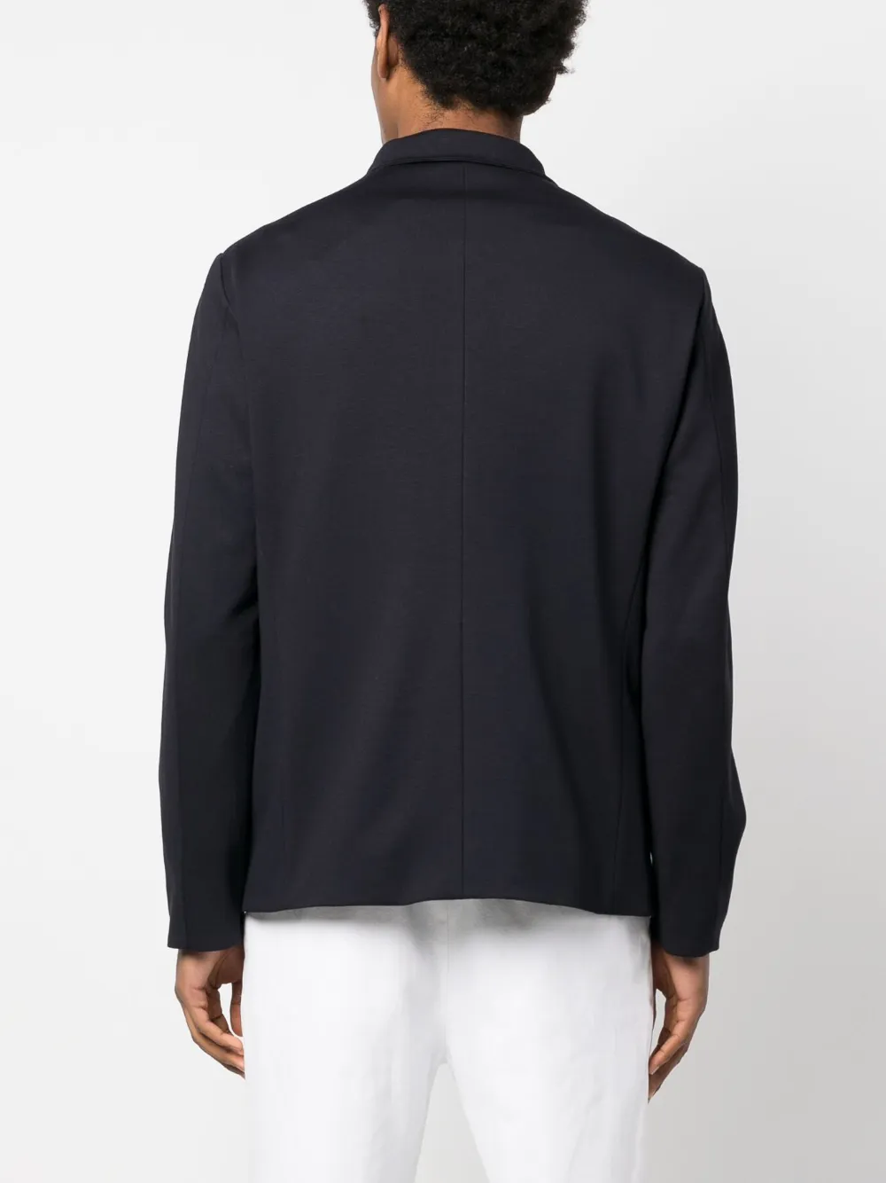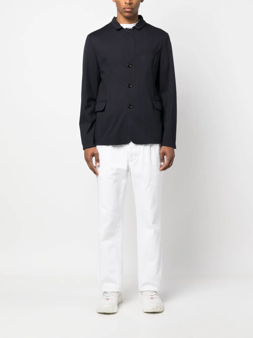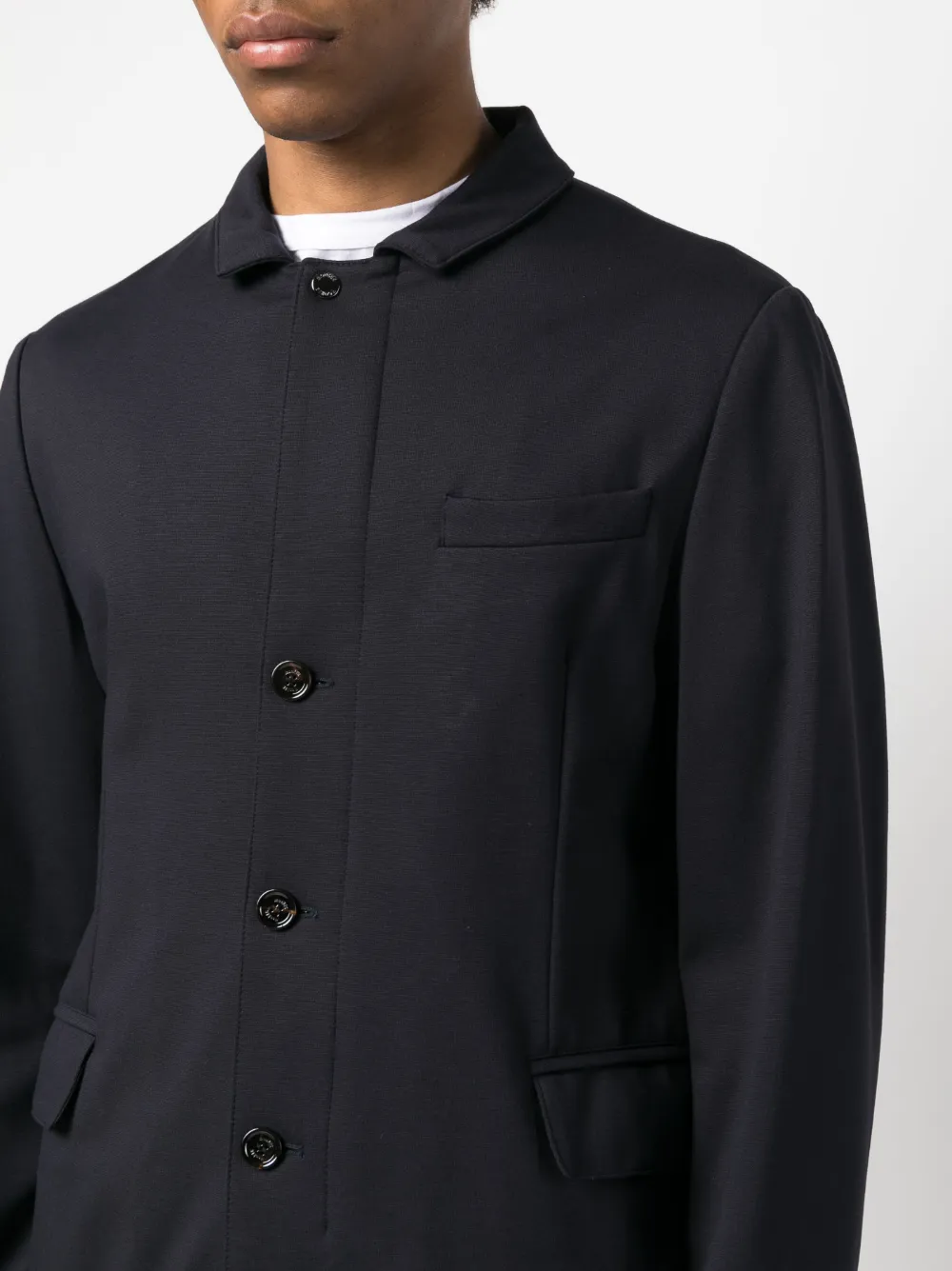 Темно-синий, зазубренный воротник, застежка на пуговицах спереди, два передних кармана с клапанами, прорезной карман на груди, длинные рукава и прямой подол.