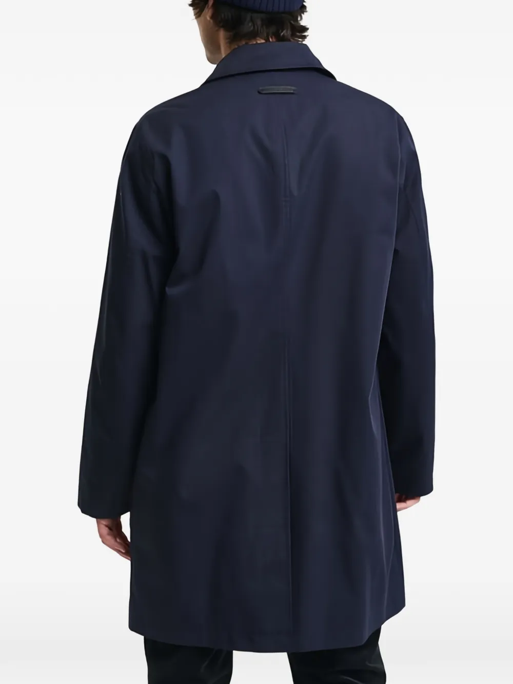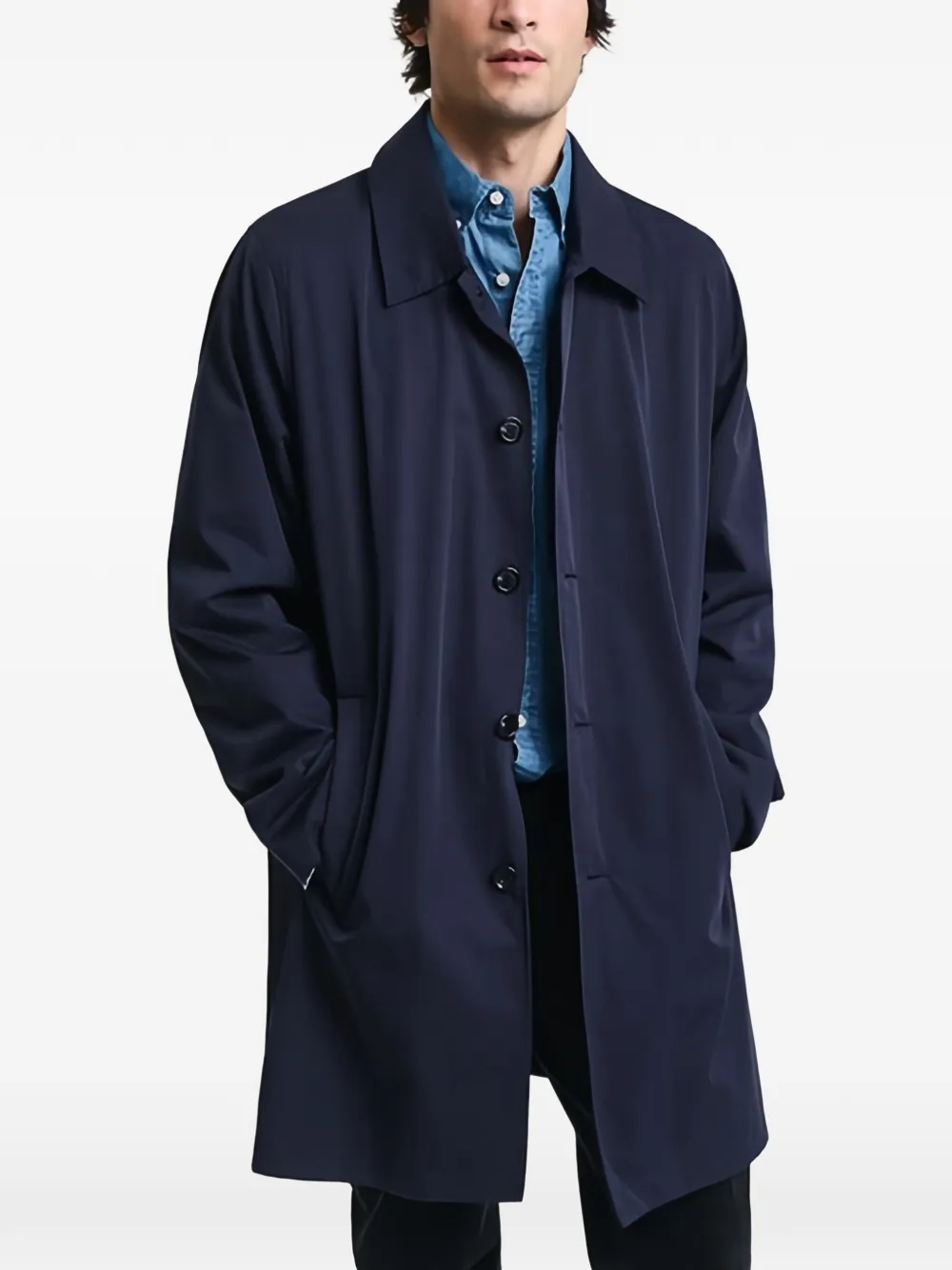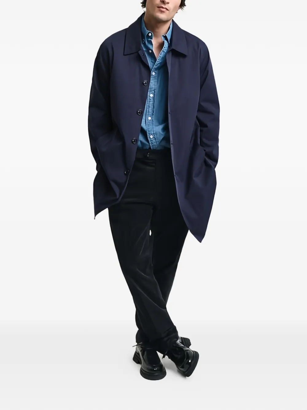 Синяя рубашка с застежкой на пуговицы спереди, длинными рукавами, воротником с острыми уголками и двумя боковыми карманами с разрезами