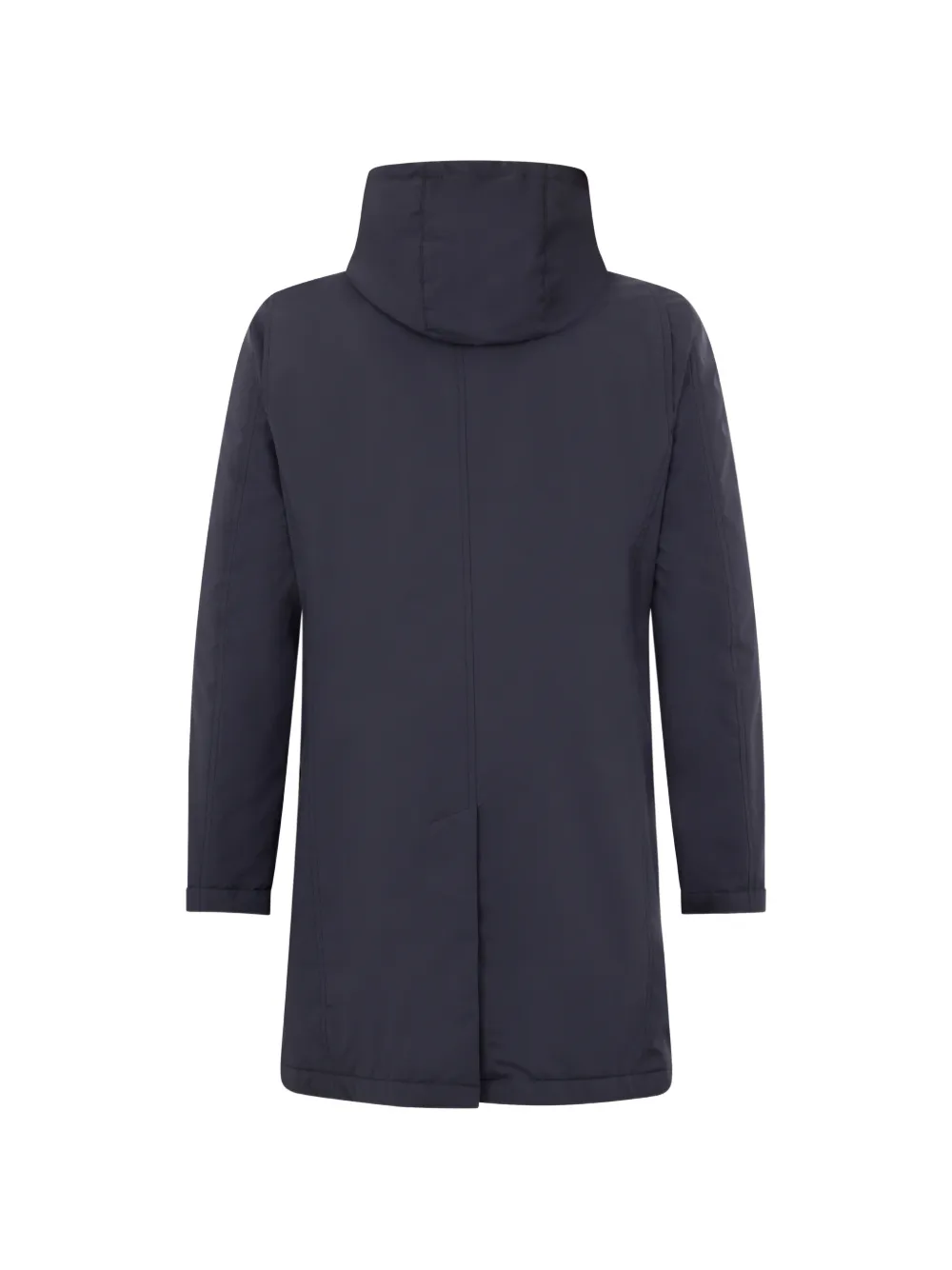 Темно-синий, боковые карманы, застежка на пуговицы, капюшон
