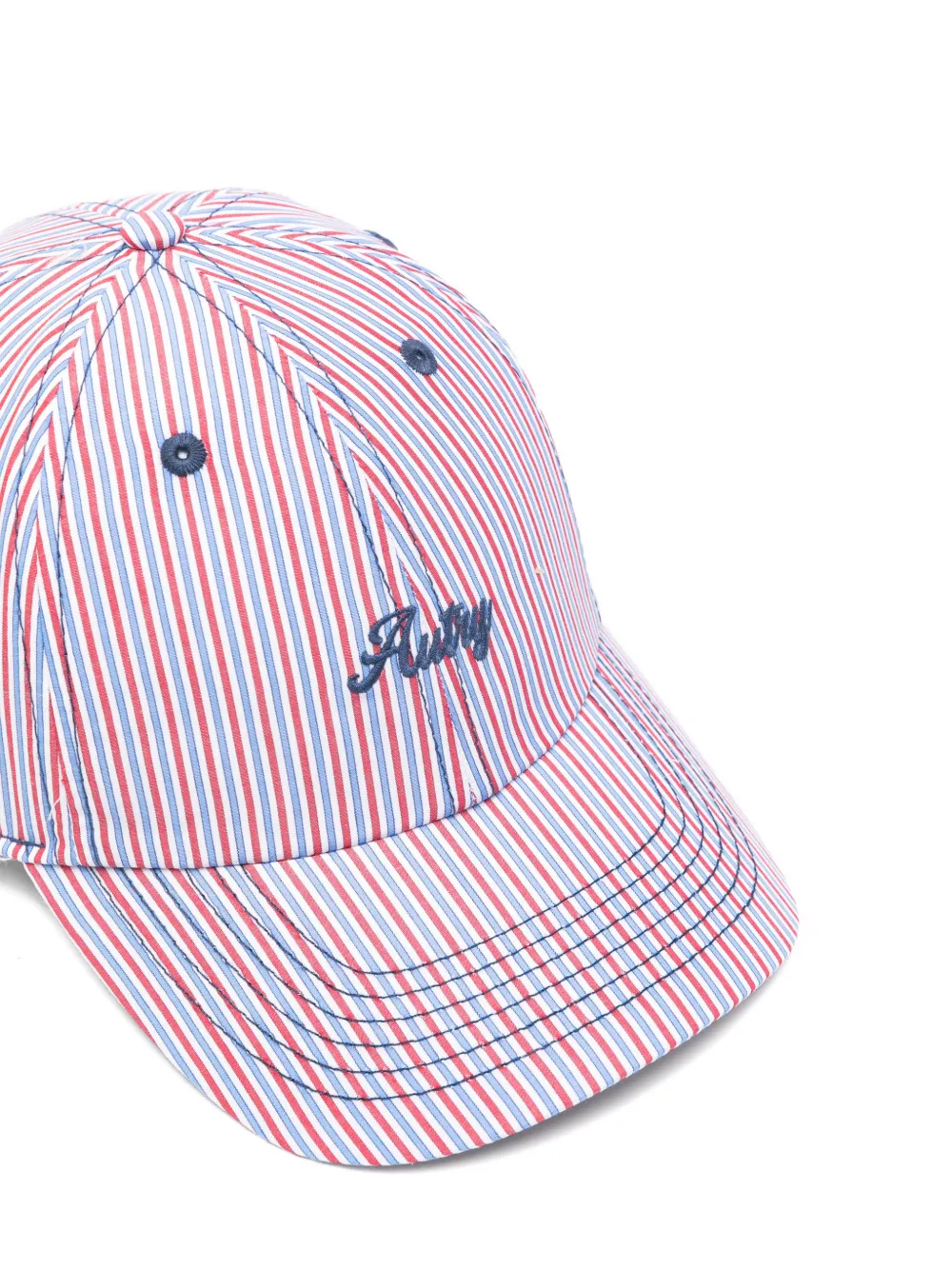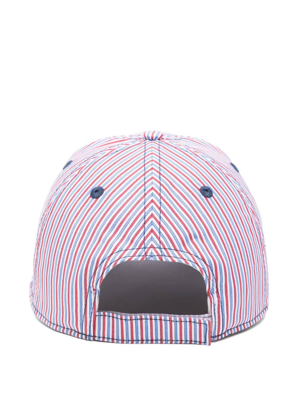 Красная, синяя и белая полосатая кепка с вышитым логотипом, застежкой на верхнюю кнопку и изогнутым козырьком