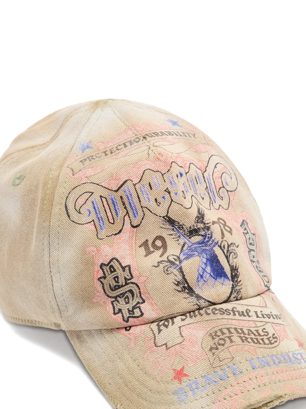 Бежевый цвет, графический принт, изогнутый козырек, изогнутая тулья, эффект состаренности