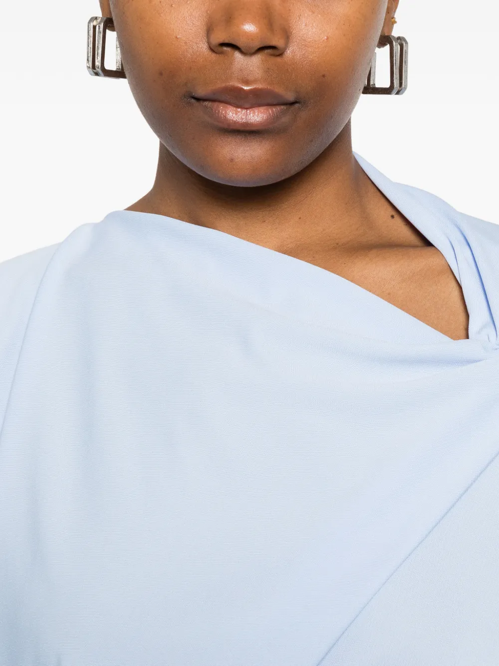 Синее платье на одно плечо с драпировкой. Напоминаем, что данную вещь необходимо примерять поверх собственной одежды.