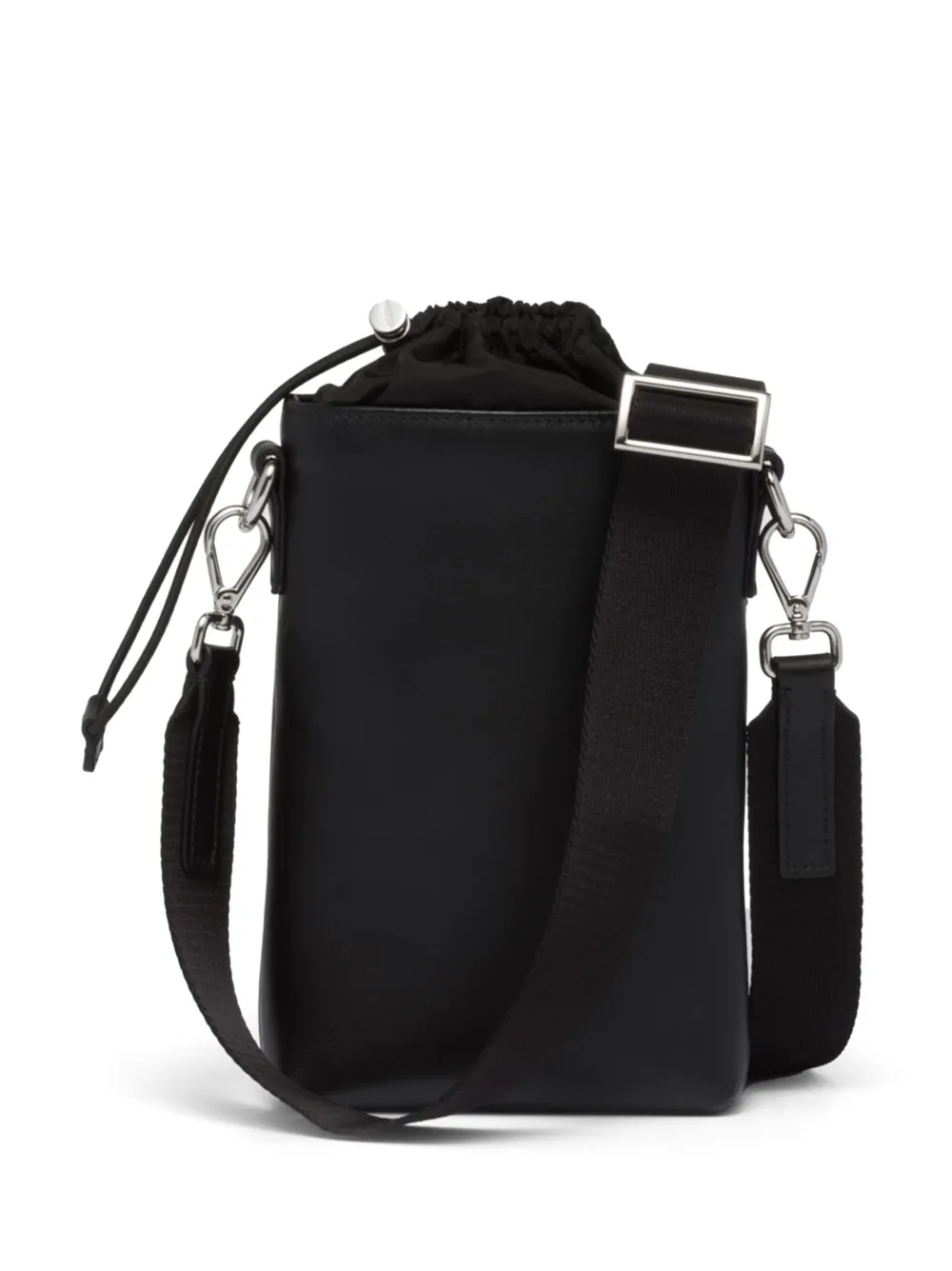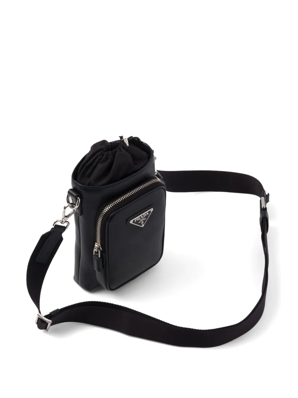 Черный, кожа, треугольный эмалированный логотип, передний карман на молнии, верхняя застежка на шнурке, съемный регулируемый ремень на плечо и основное отделение.