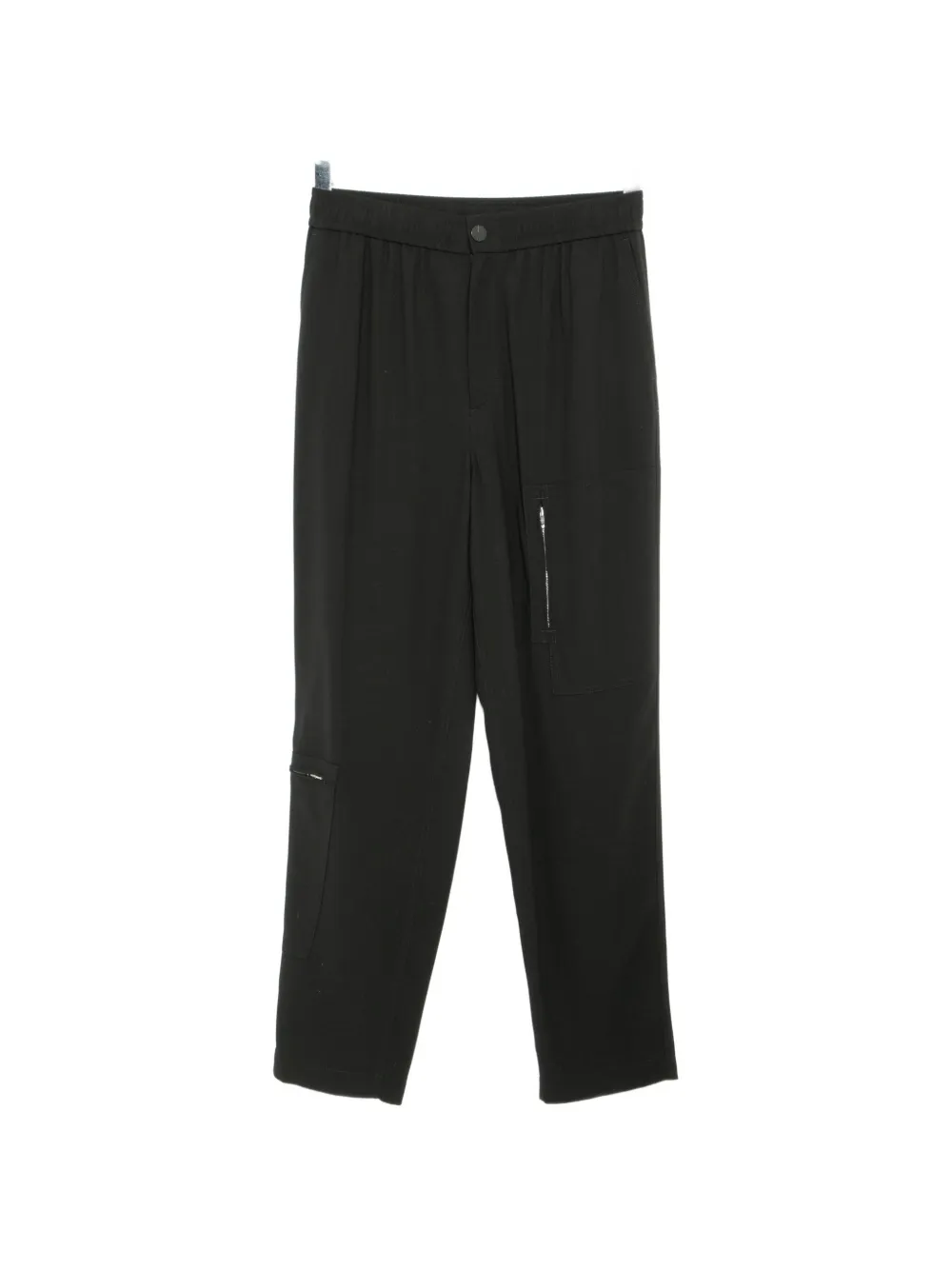 Черная эластичная поясная лента с внутренним шнурком, застежка на пуговицу и молнию спереди, два накладных задних кармана, боковые карманы в швах, боковые карманы на молнии