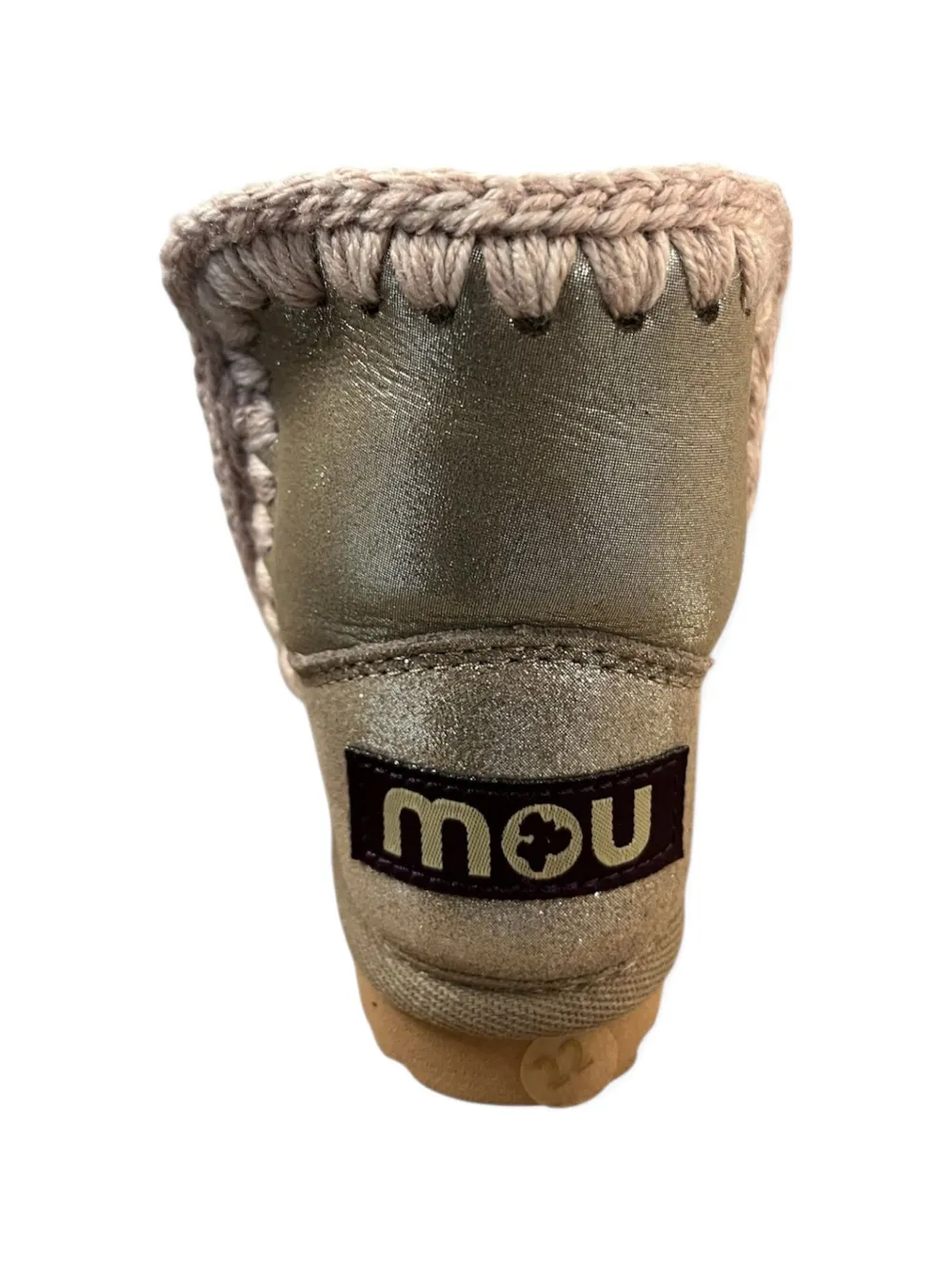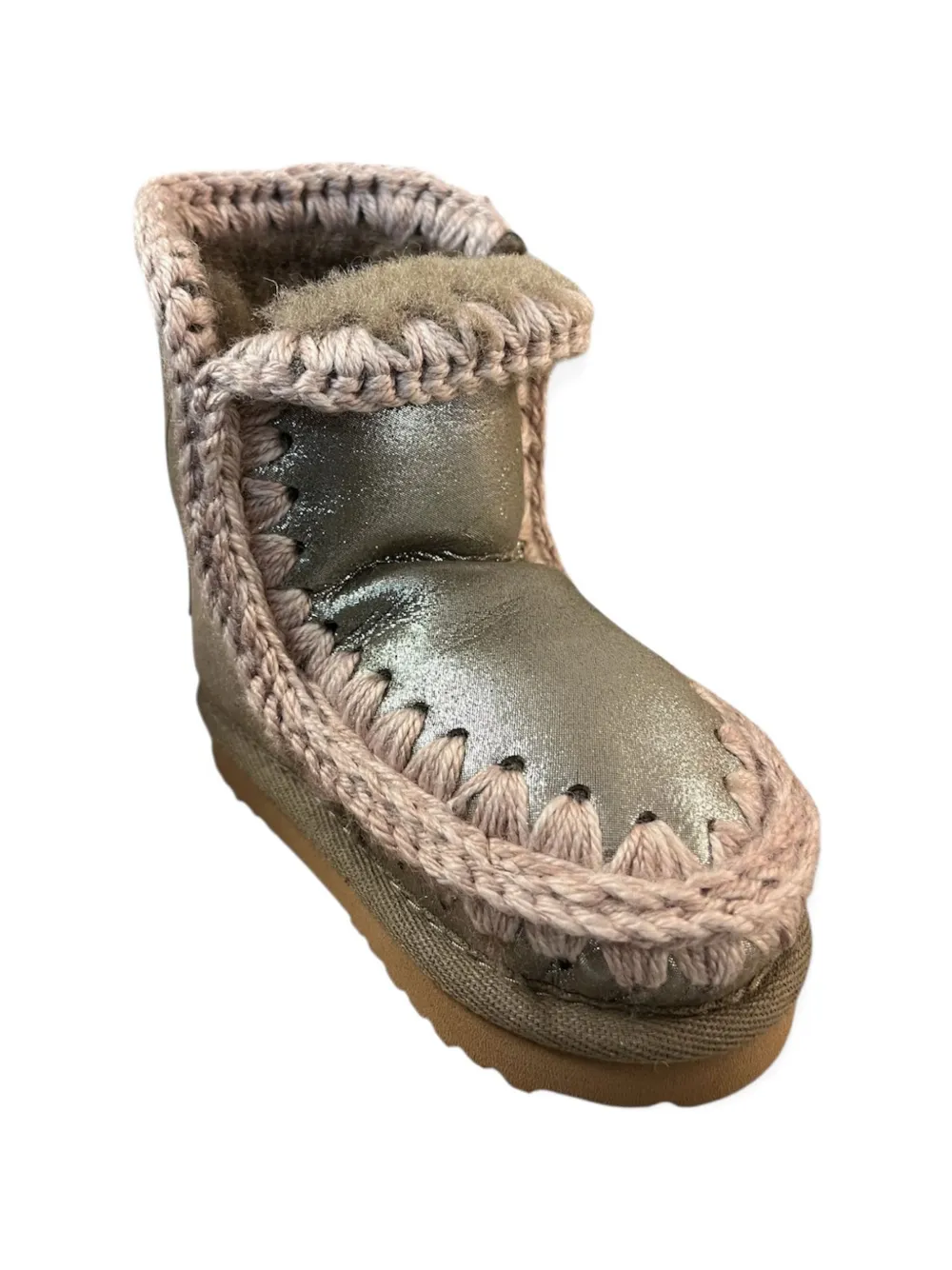 Серый металлизированный верх, отделка крючком, круглый носок, однотонная строчка, плоская подошва