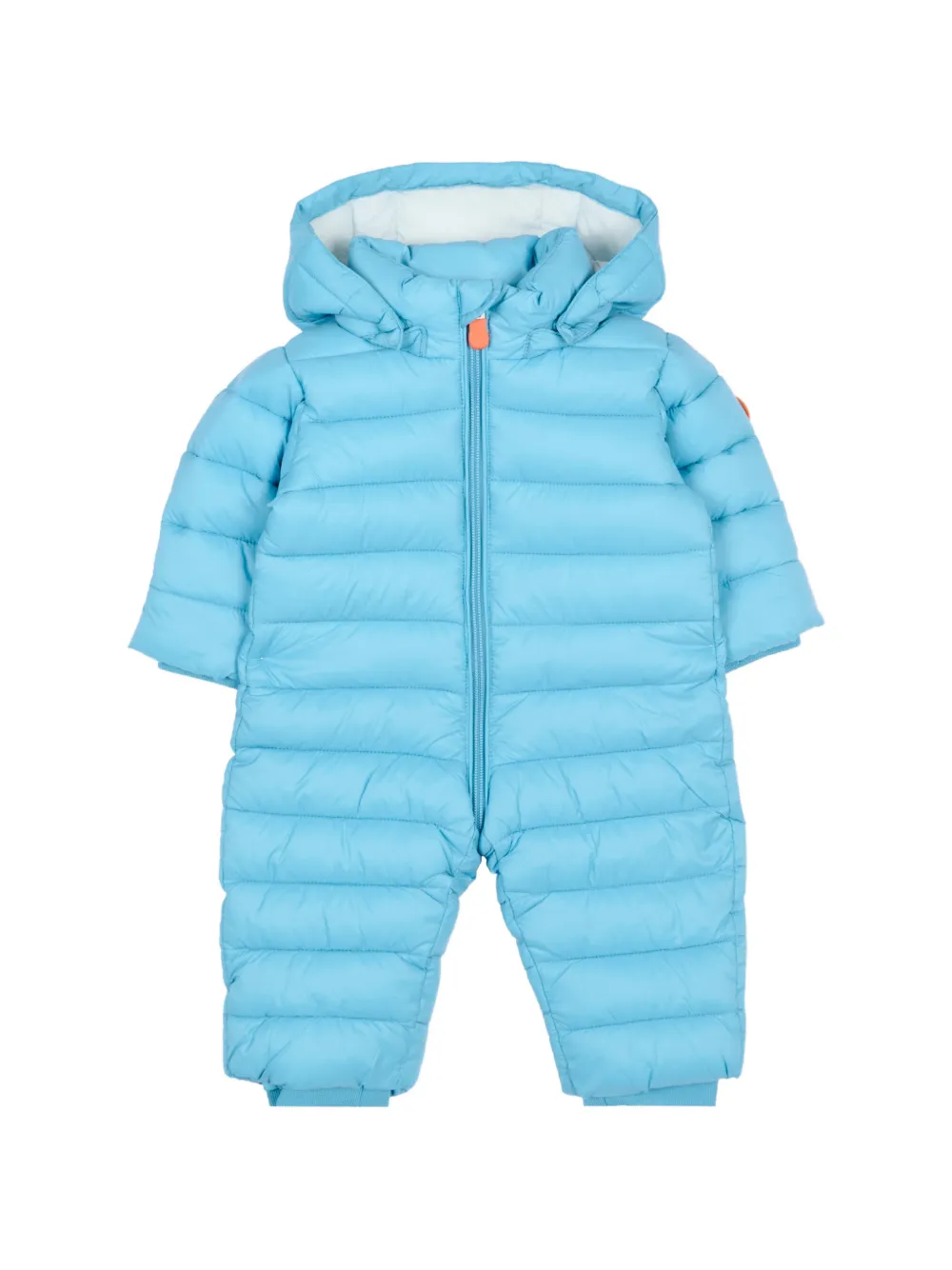 Светло-голубой стеганый комбинезон с капюшоном, застежкой-молнией спереди, длинными рукавами и закрытыми ножками
