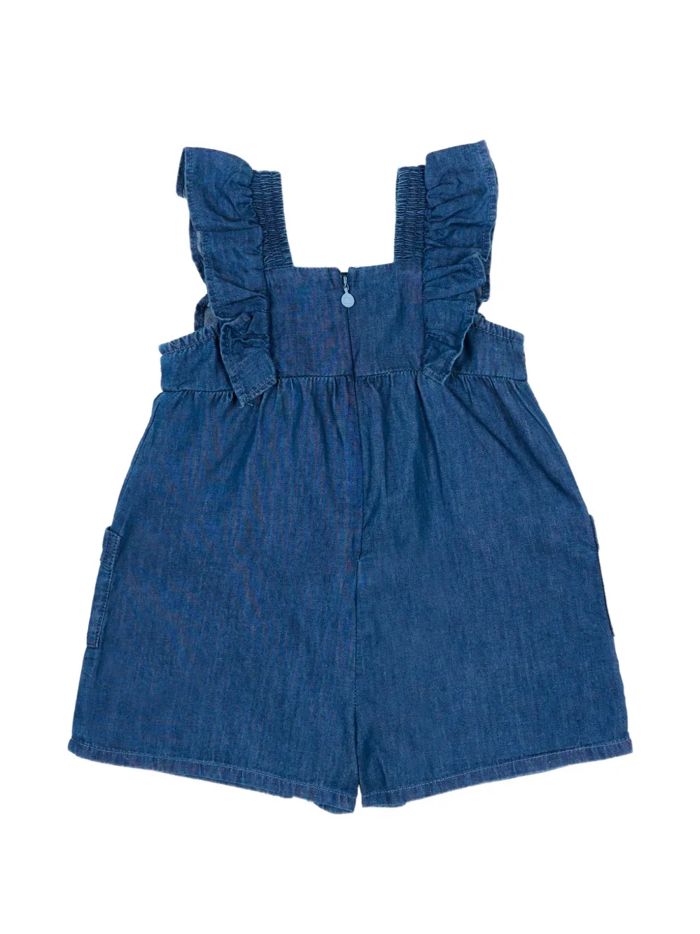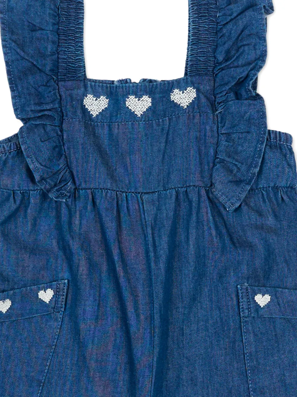 Голубое изделие с мотивом в виде сердца, оборками по краю, квадратным вырезом, передними карманами, без рукавов