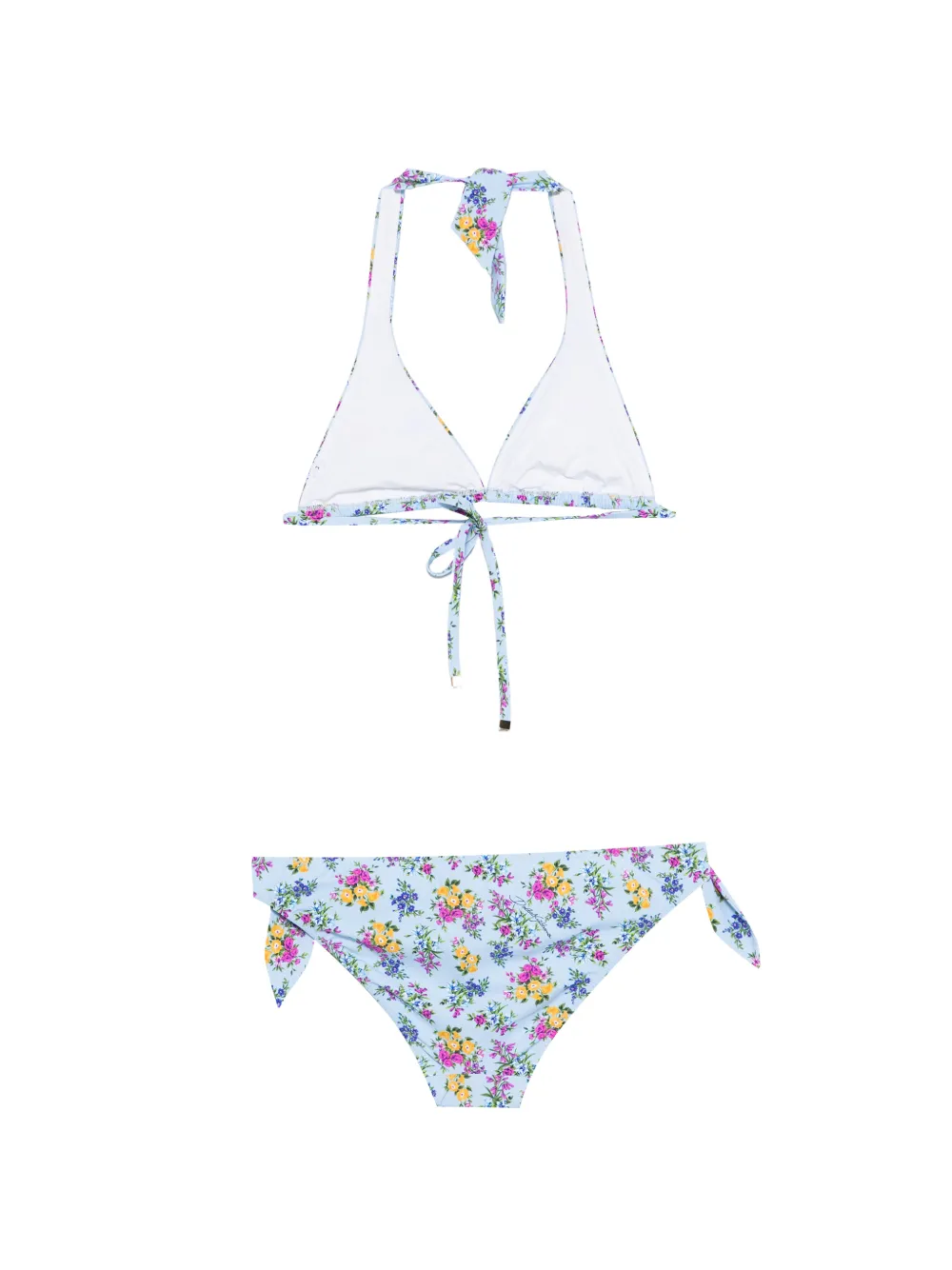 Голубой/разноцветный купальник с цветочным принтом, деталями-завязками по бокам и нашивкой с логотипом