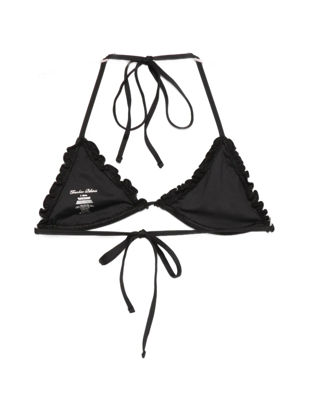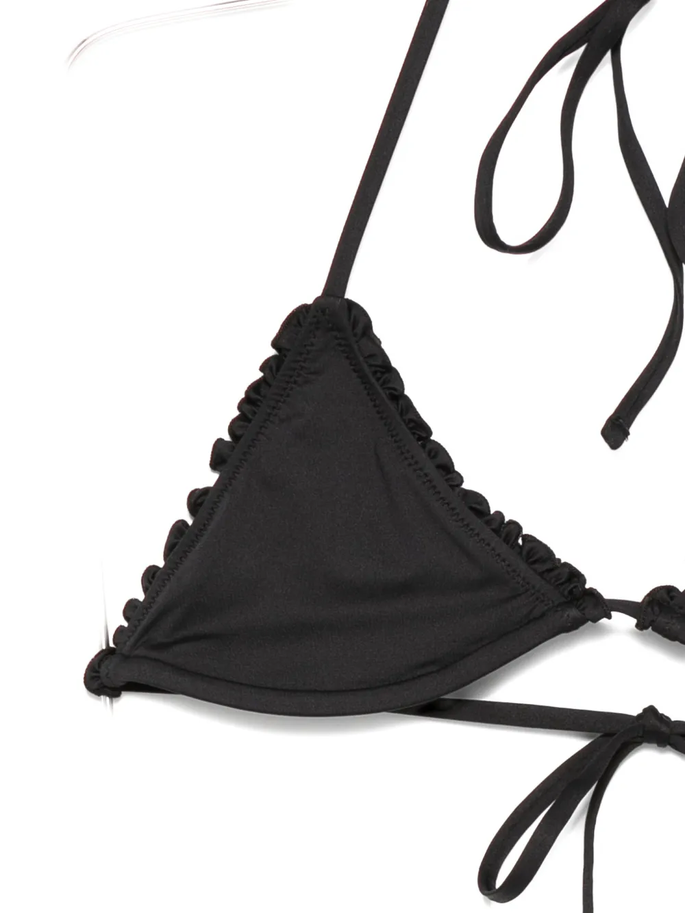 Черный треугольный топ с воланами и завязками. Пожалуйста, примерьте купальник поверх собственной одежды.