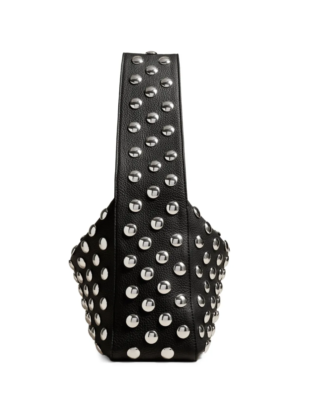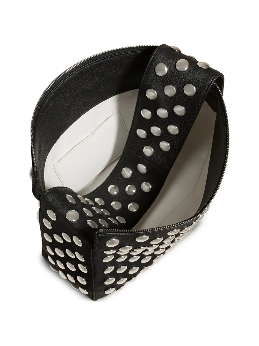 Черная сумка с заклепками, верхней застежкой-молнией, верхней ручкой и внутренним открытым карманом