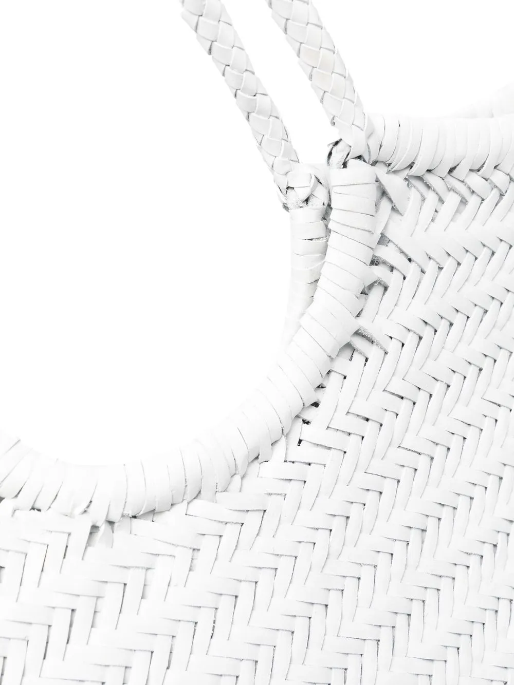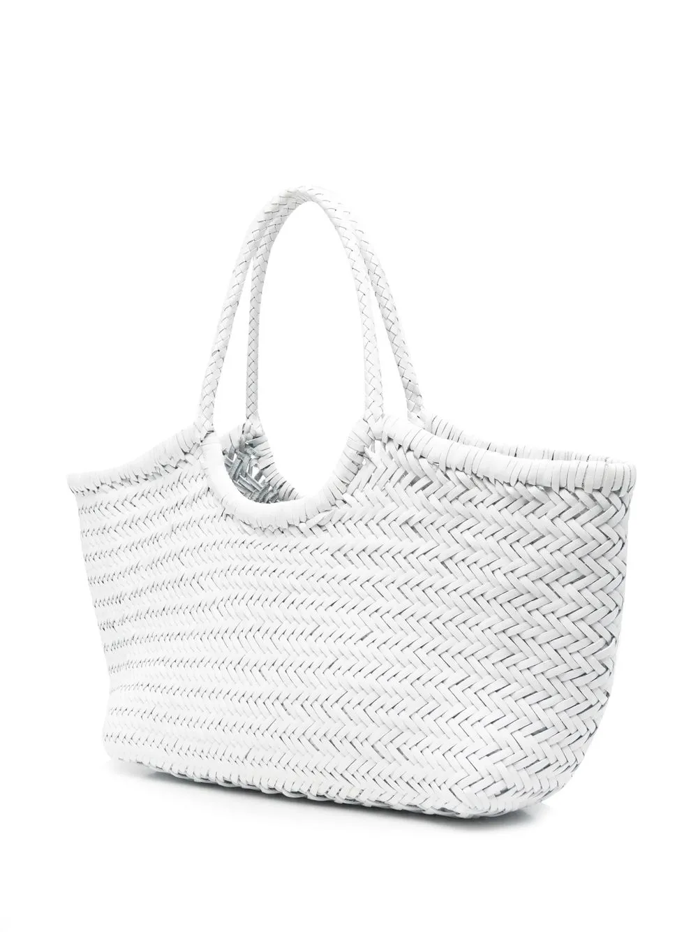 Белый, кожа, переплетенный дизайн, две закругленные ручки и основное отделение.