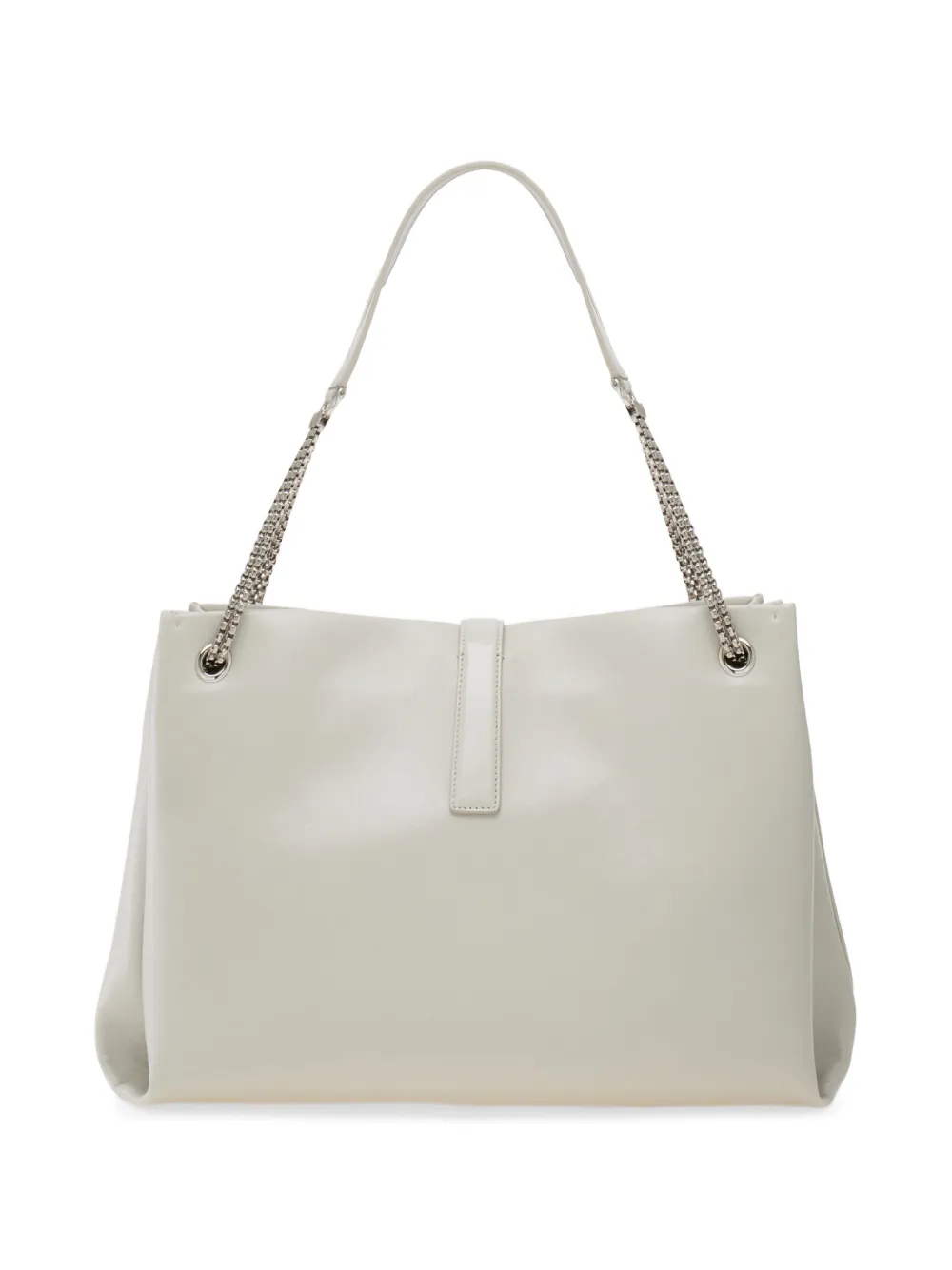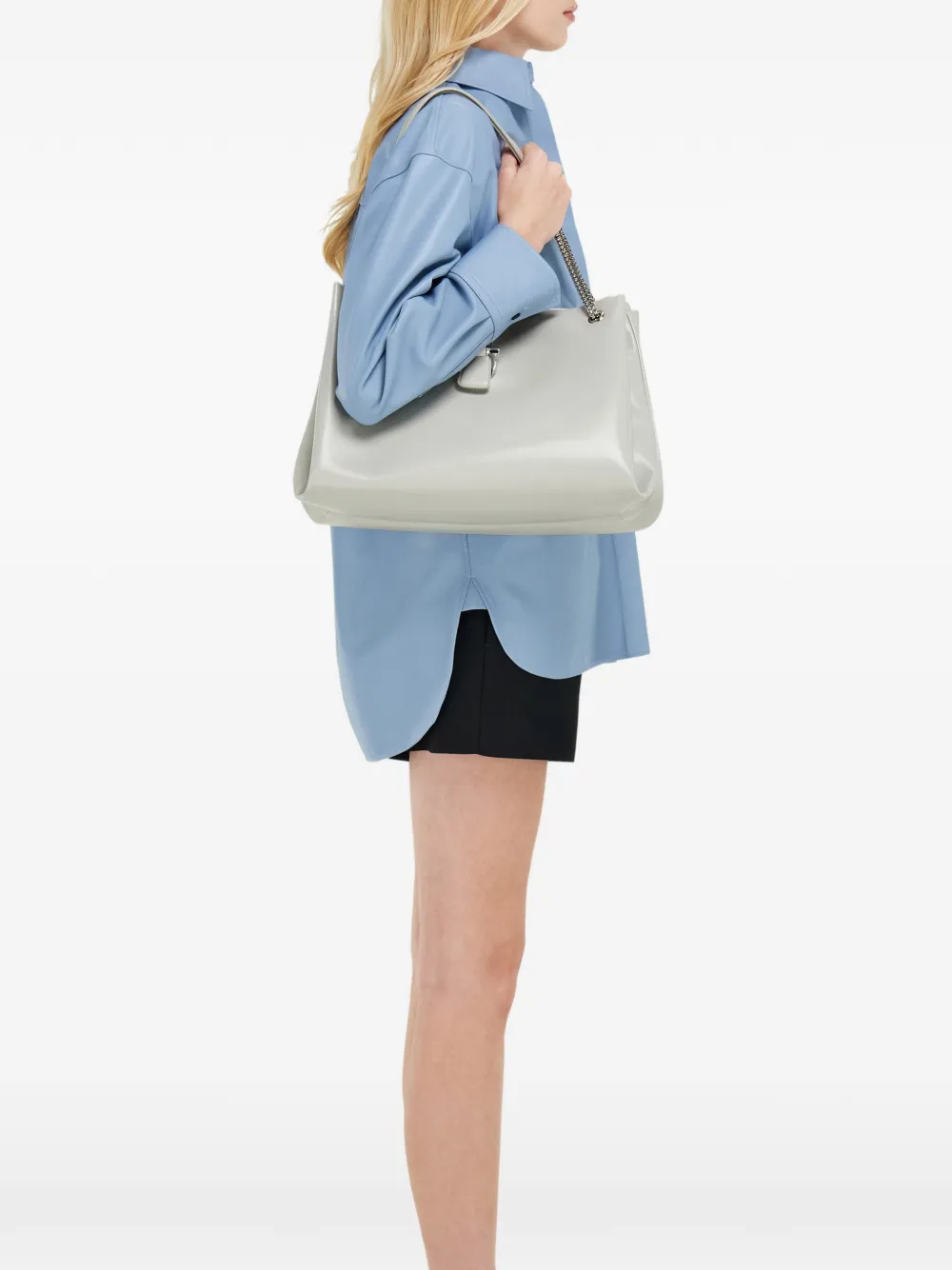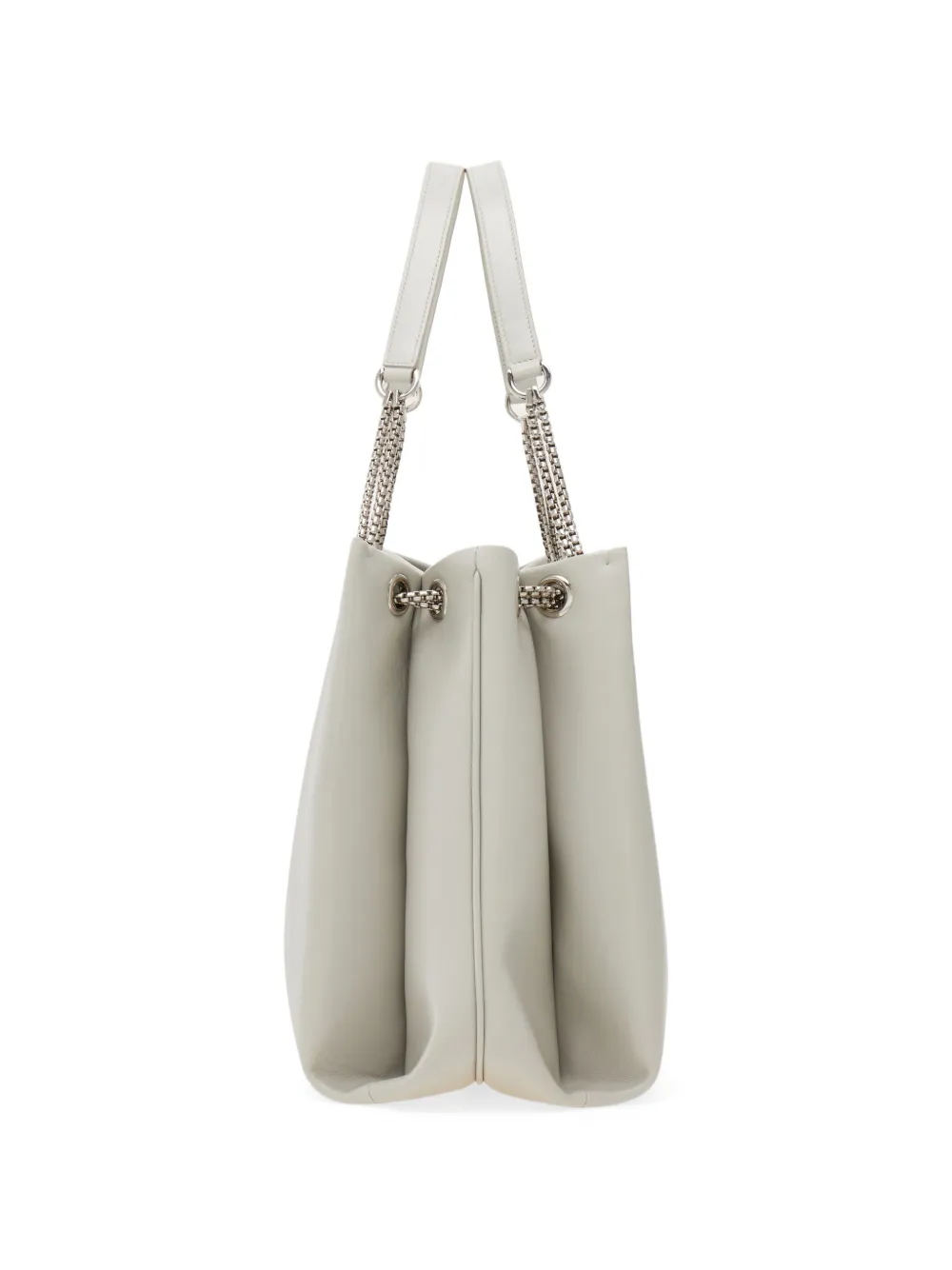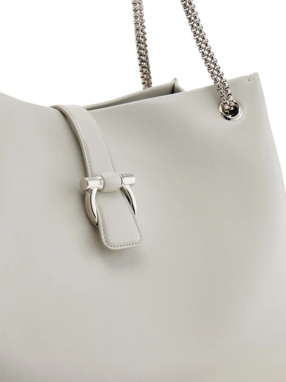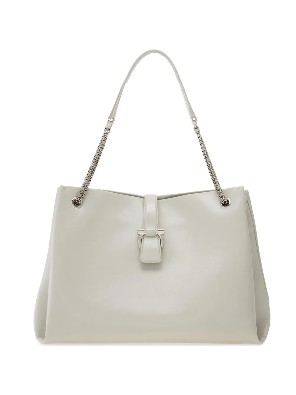 Металлическая фурнитура в прохладном палладиевом оттенке подчеркивает рок-дух этой сумки-тоут Ferragamo с мягкими очертаниями и вместительным внутренним пространством. Объемные боковые складки напоминают силуэт флорентийской лилии и обеспечивают дополнительное пространство в подкладке с плоским карманом. Ремень-цепочка из телячьей кожи.
