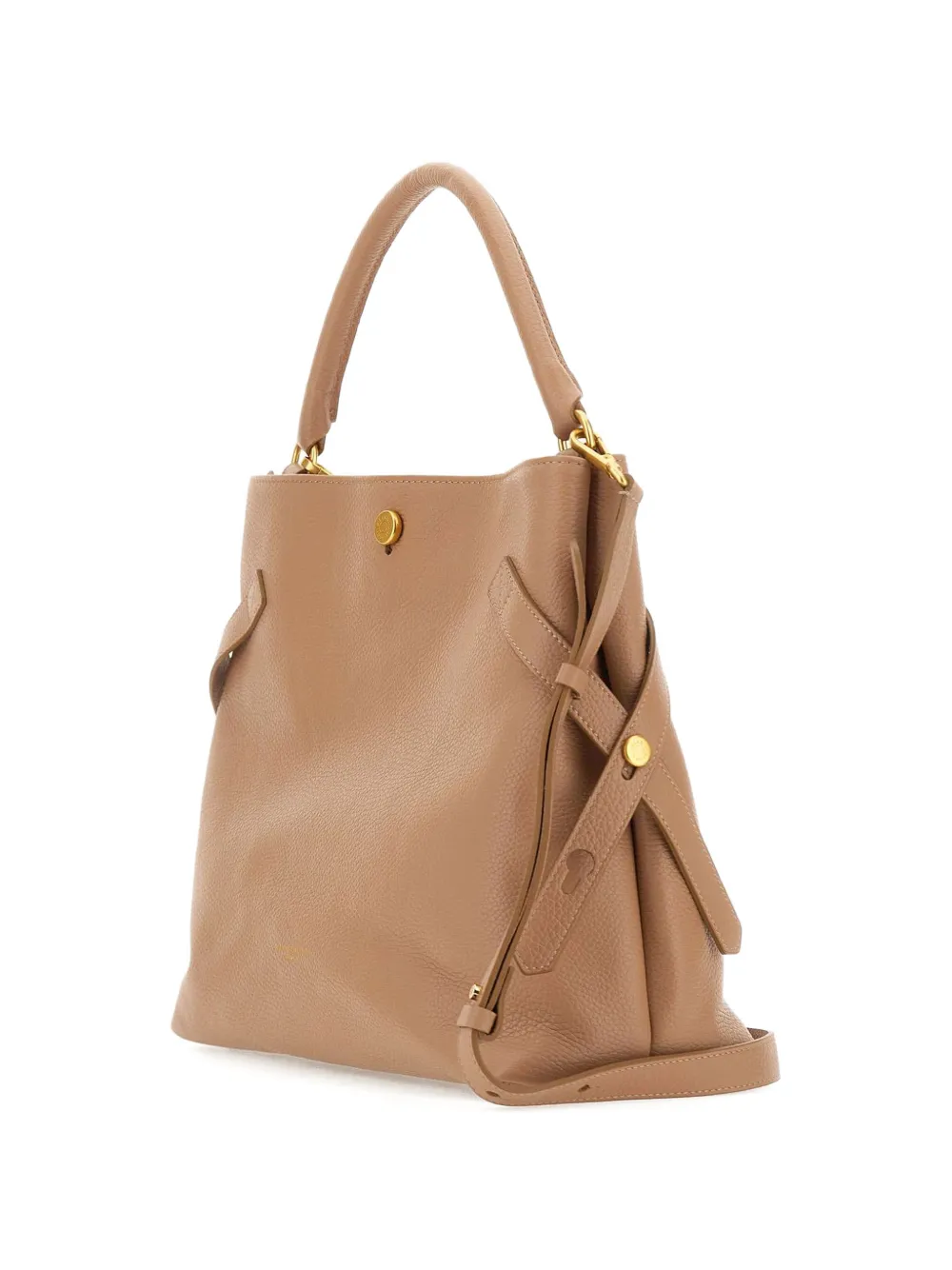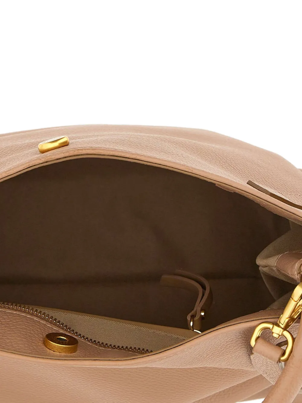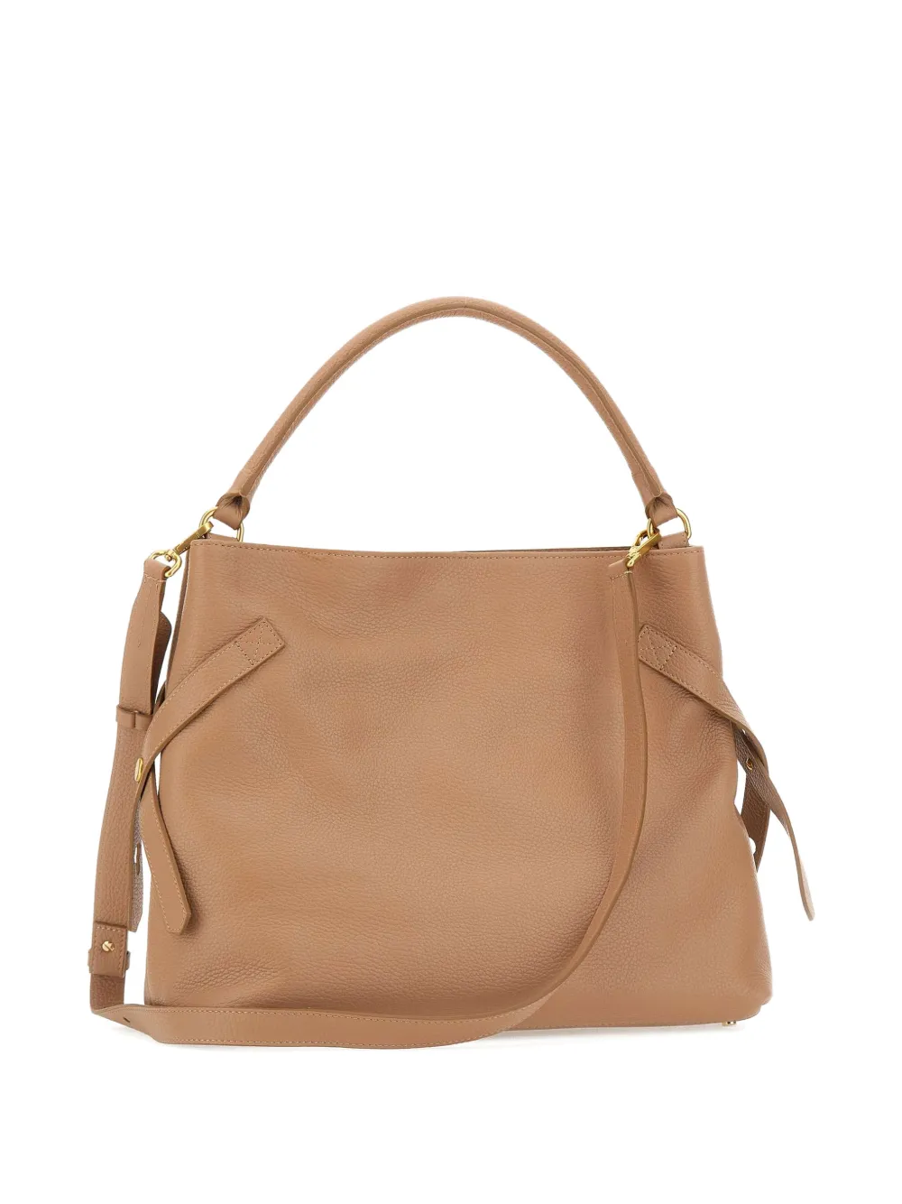 Бежевый цвет, фактурная отделка, фурнитура золотистого оттенка, трубчатая верхняя ручка, регулируемый ремень, внутренний открытый карман, внутренний карман на молнии