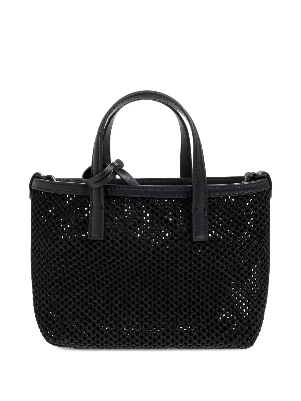 Черная сумка с тиснением в виде надписи, верхней ручкой, съемным плечевым ремнем, украшением-брелоком и узлом
