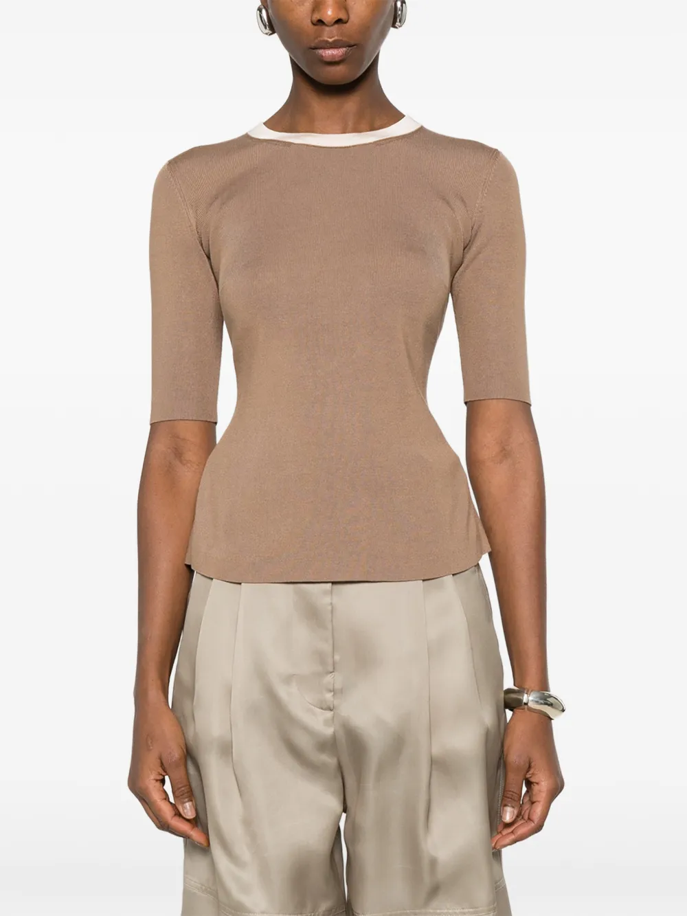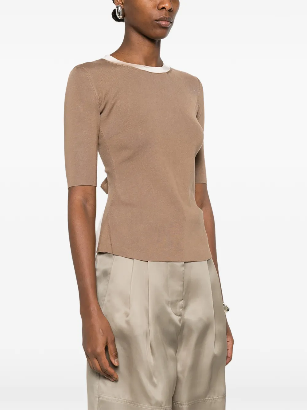 Бежевый джемпер с круглым вырезом, короткими рукавами, вырезами и рубчатой вязкой