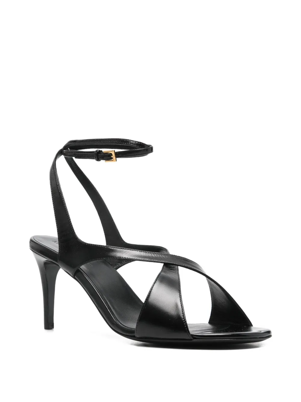 Черные босоножки с ремешком на щиколотке, золотистой пряжкой, перекрещивающимися ремешками, каблуком-шпилькой и открытым носком