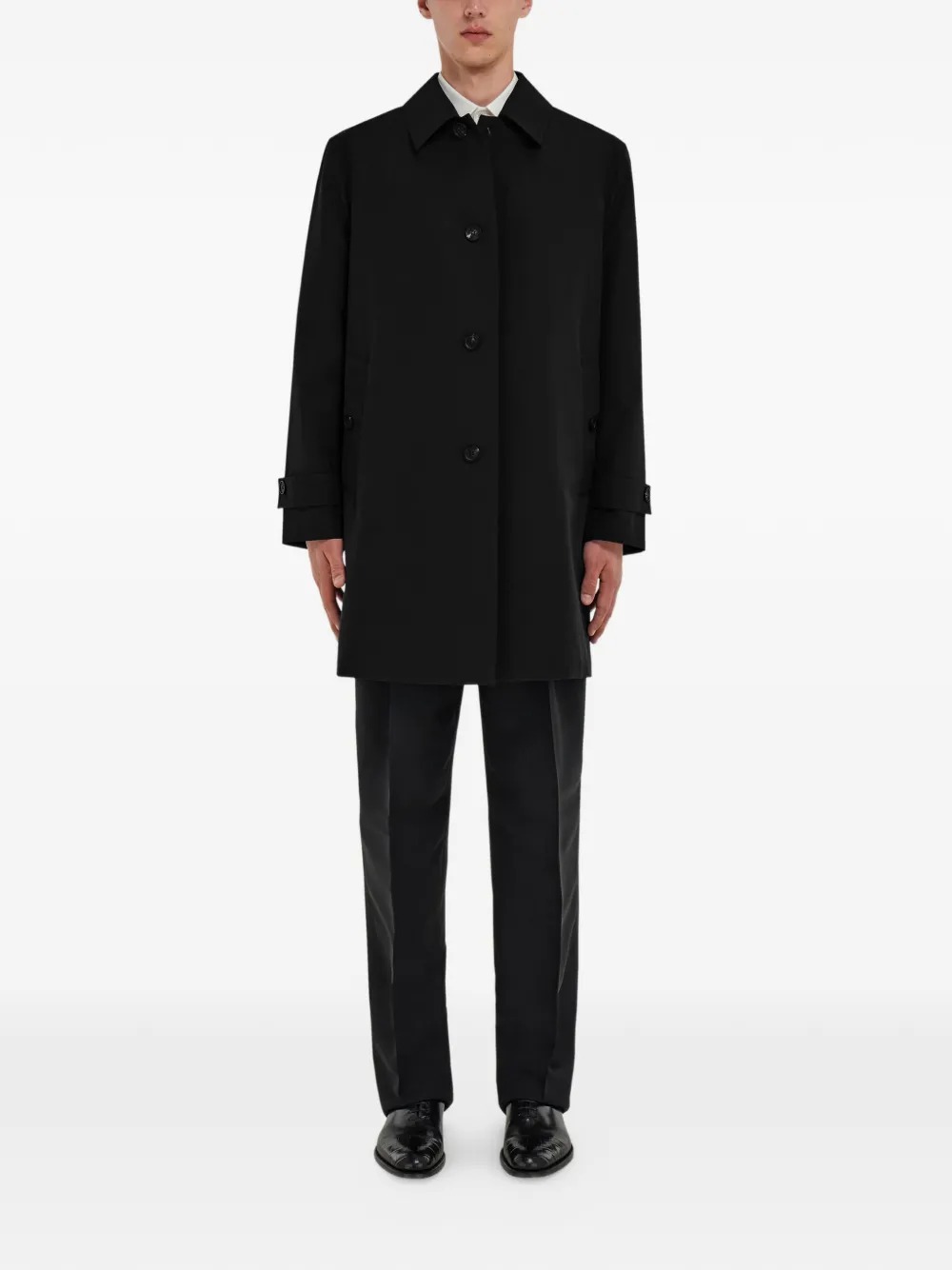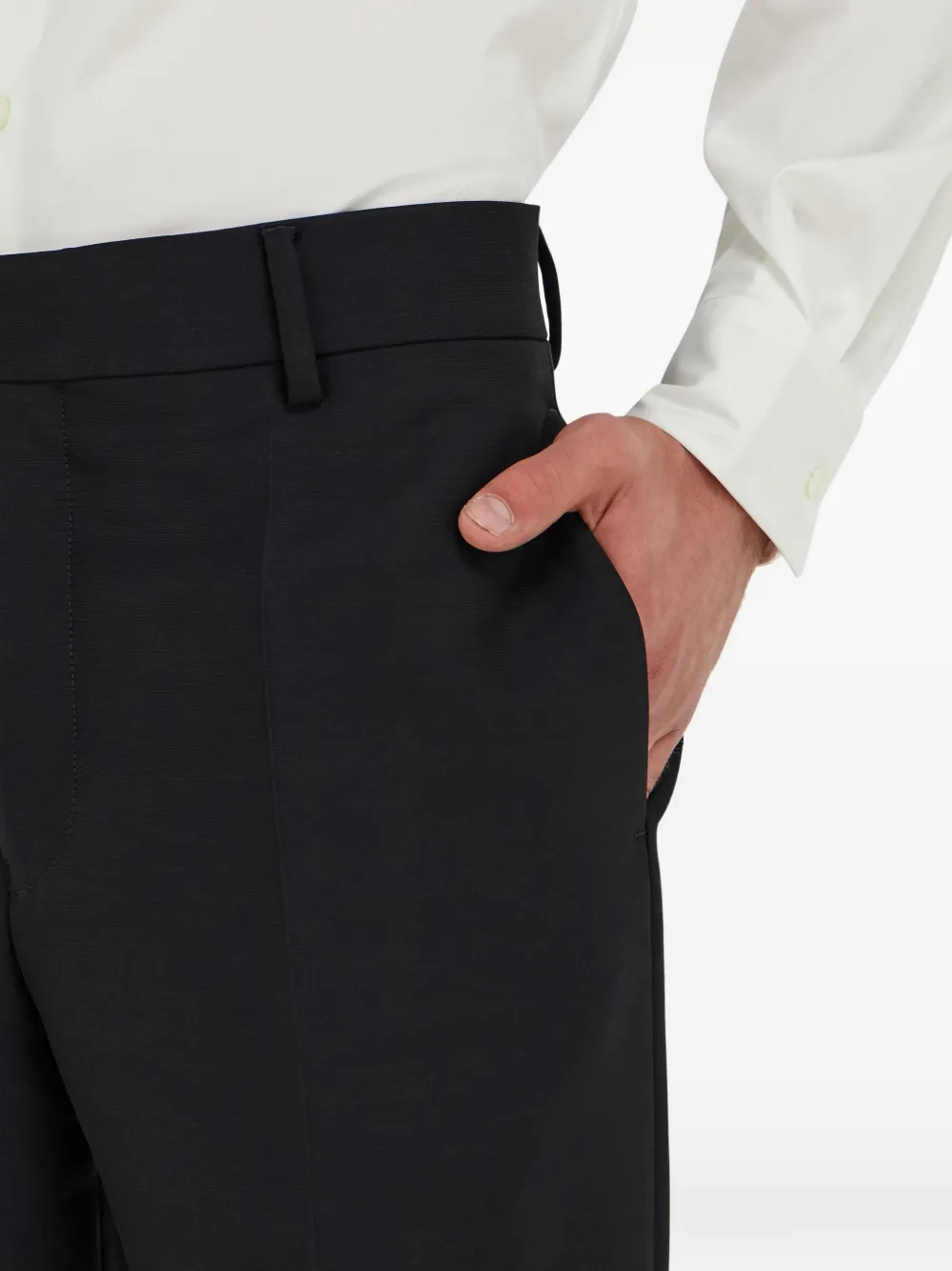 Легкие брюки из эластичной шерсти, выполненные из шерстяной ткани с рисунком "елочка" и богатой текстурой. Брюки имеют зауженный крой, стрелки по всей длине и застежку на крючок и пуговицу на поясе. Черный классический дизайн, шлевки для ремня, боковые карманы в швах, задние прорезные карманы.