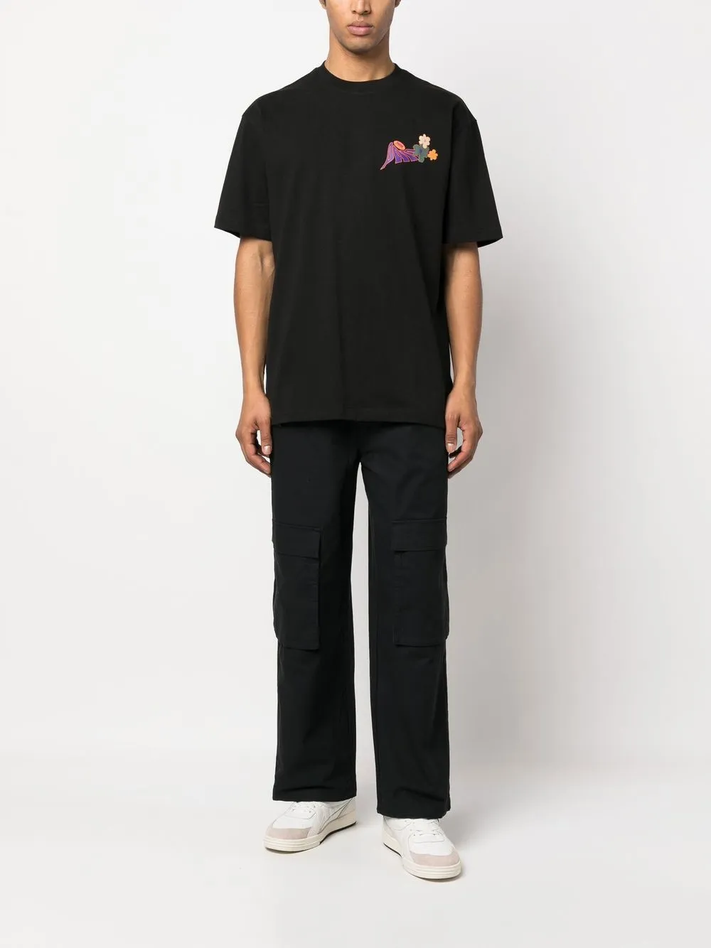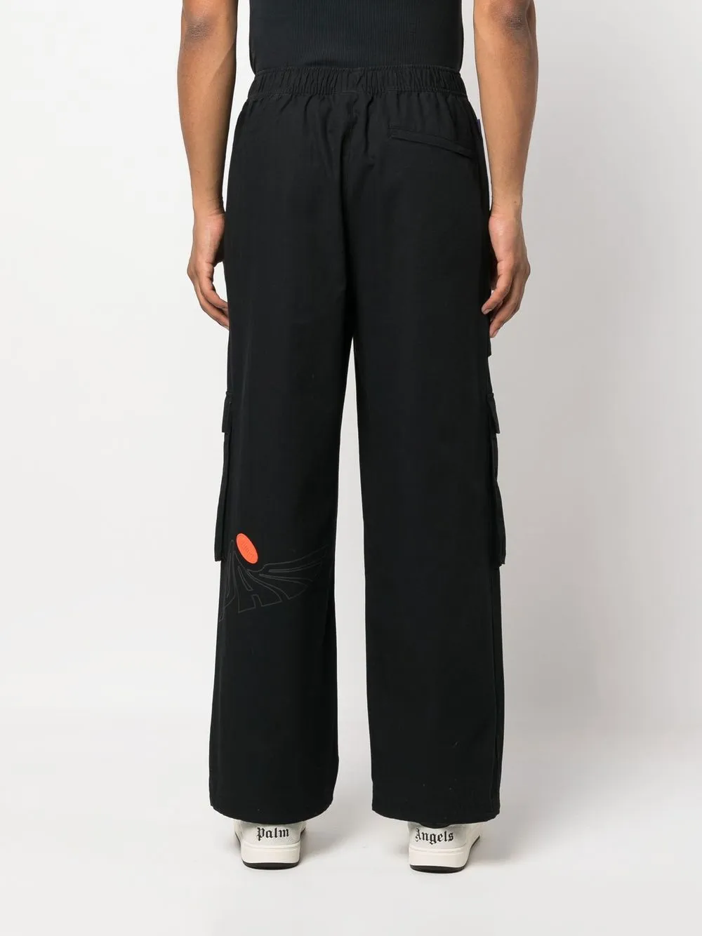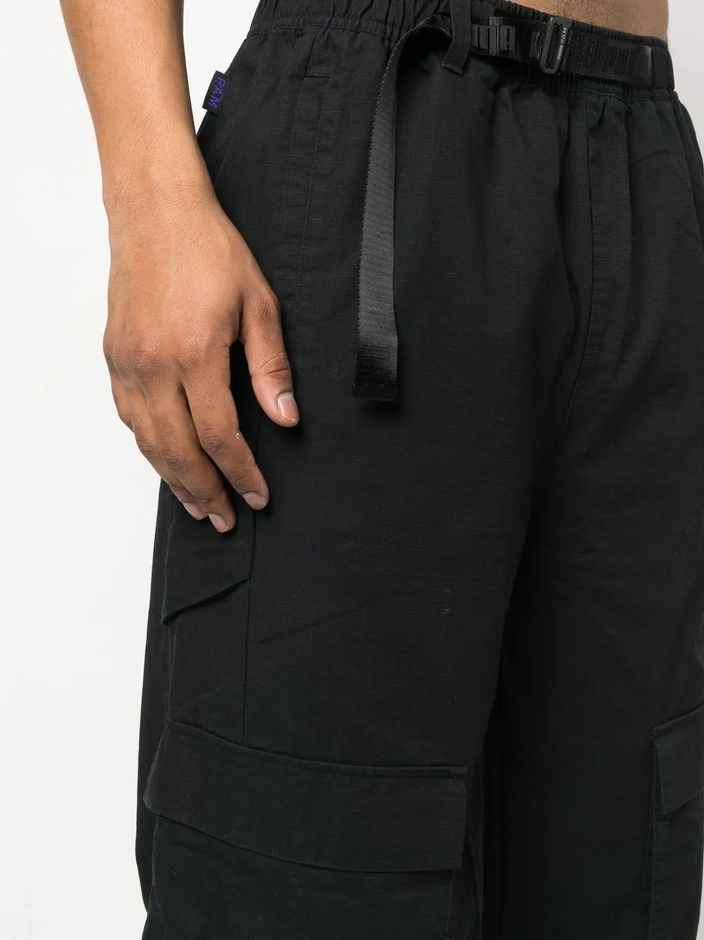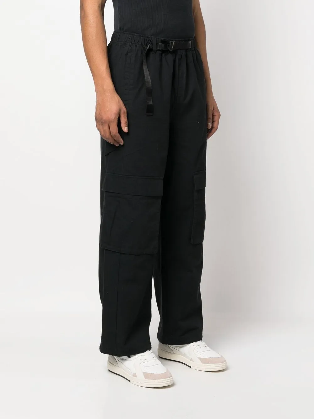 Черный, хлопок, ремень на талии, регулируемый дизайн, эластичный пояс, широкий крой, два кармана карго спереди, два вшитых кармана по бокам, задние карманы с листочкой и принт с надписью сзади.