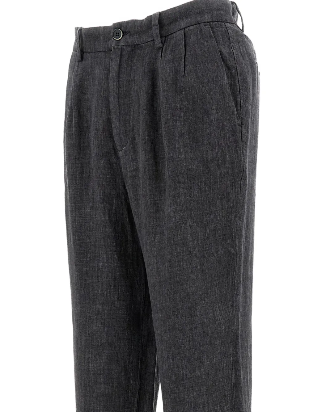 Металлические серо-металлизированные шлевки для ремня, застежка на пуговицу и молнию, складки спереди, боковые и задние карманы на пуговицах, манжеты на брючинах